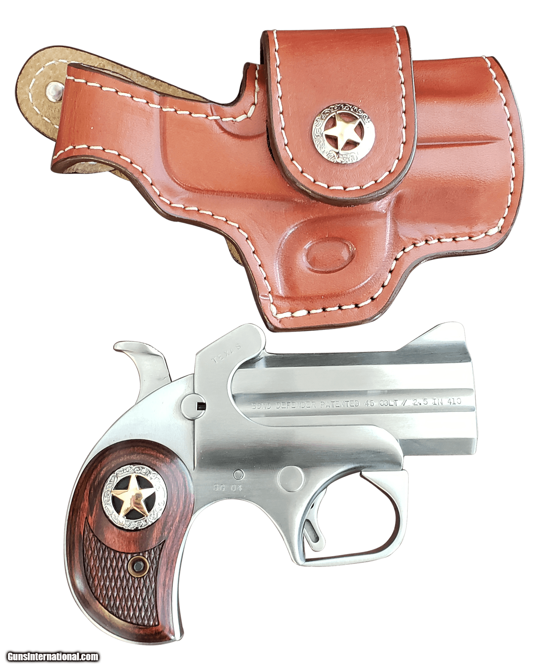 Description: Guns Listing ID: prod50554 The compact, yet powerful, Rustic Defender is a bold statement to a bold state. It‚‚s built with a 3\" barrel chambered for .45 Colt or 2.5 .410 shot shells and includes a matching driving hol SOLD Manufacturer: BOND ARMS Model: Rustic Defender Caliber Info: .45 LC Condition: new Barrels: 3 BARREL Finish: STAINLESS STEEL |
