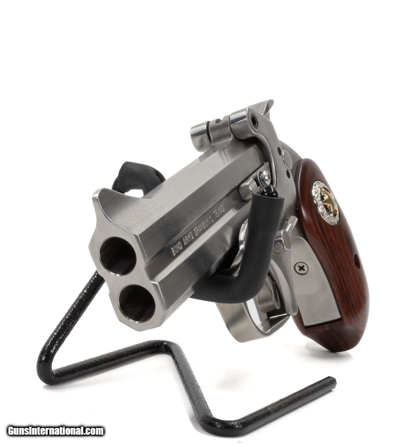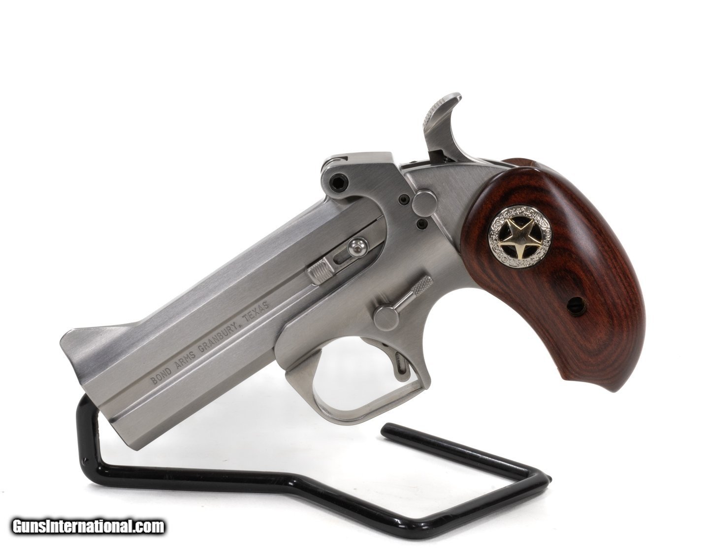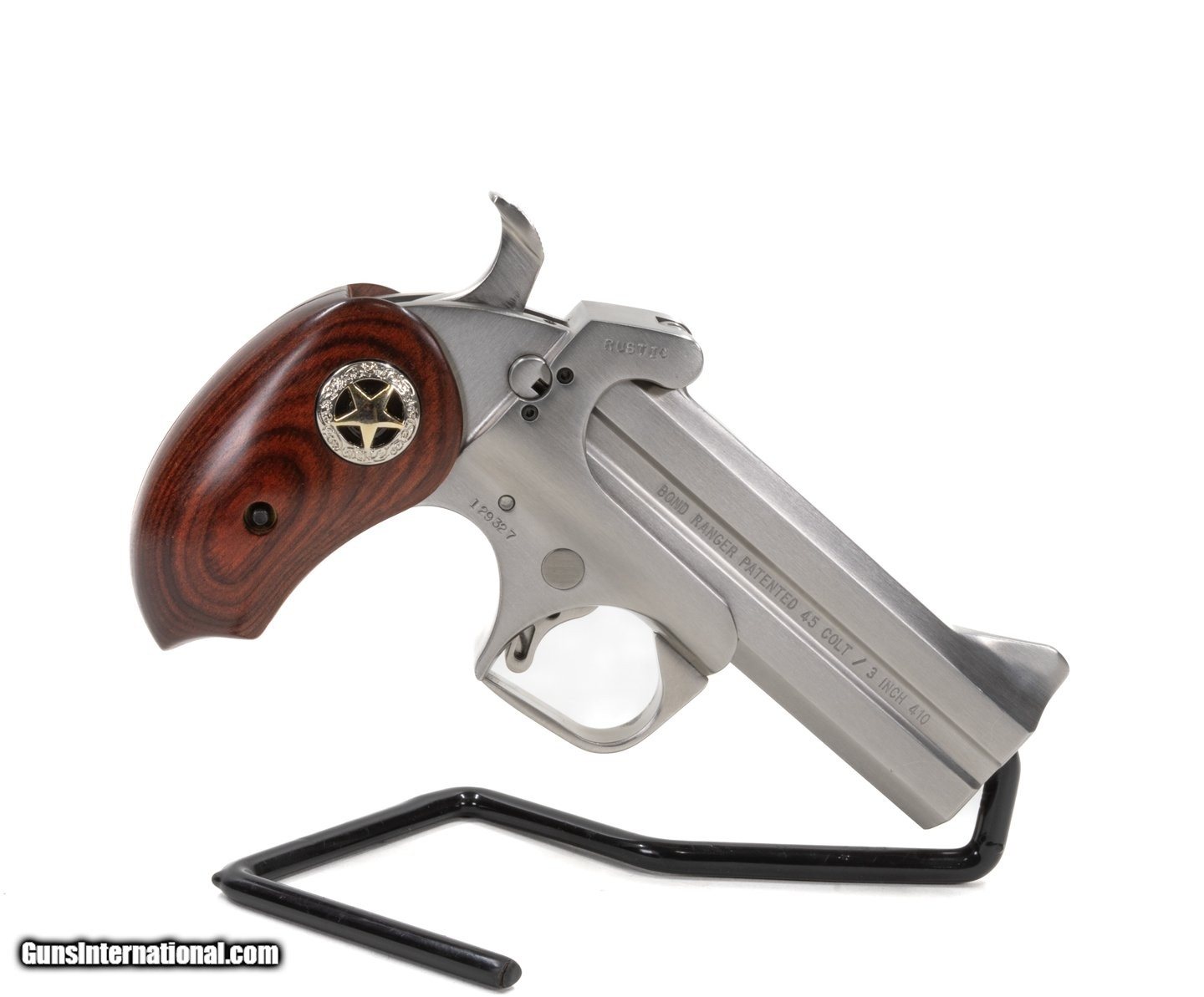 Description: Guns Listing ID: 574800 Pre-Owned Bond Arms Rustic Ranger Pistol in .45LC / .410 Bore Manufacturer: Bond Arms Model: Rustic Ranger Condition: Very Good Caliber/Gauge: .45 Long Colt / 410 Bore Action: Single Action Barrel Length: 4.25\" Capacity: 2 Finish: Stainless Grips: Wood Other Features: Double barrel pistol • We do not test fire used guns. All guns are function checked once we receive them. Unless stated otherwise, this firearm is functional. SOLD Manufacturer: BOND ARMS Model: Rustic Ranger Caliber Info: .45lc / .410 Condition: Used - Non-Certified Barrels: 4.25" BARREL Action: SINGLE SHOT Finish: stainless |