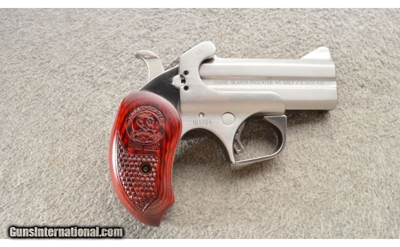 Description: This gun appears to be near new condition, The finish is clear of scratches and the wood grips do not show any scuffs or scratches. It may have never been fired. Comes with box as pictured. .45 Colt / 410 Gauge SOLD Chambers: 2 Metal Condition: 98% No scratches Wood Condition: No noticeable marks Bore Condition: Near new Barrels: 2 Triggers: SA Sights: Fixed Item Location: Owatonna, MN |