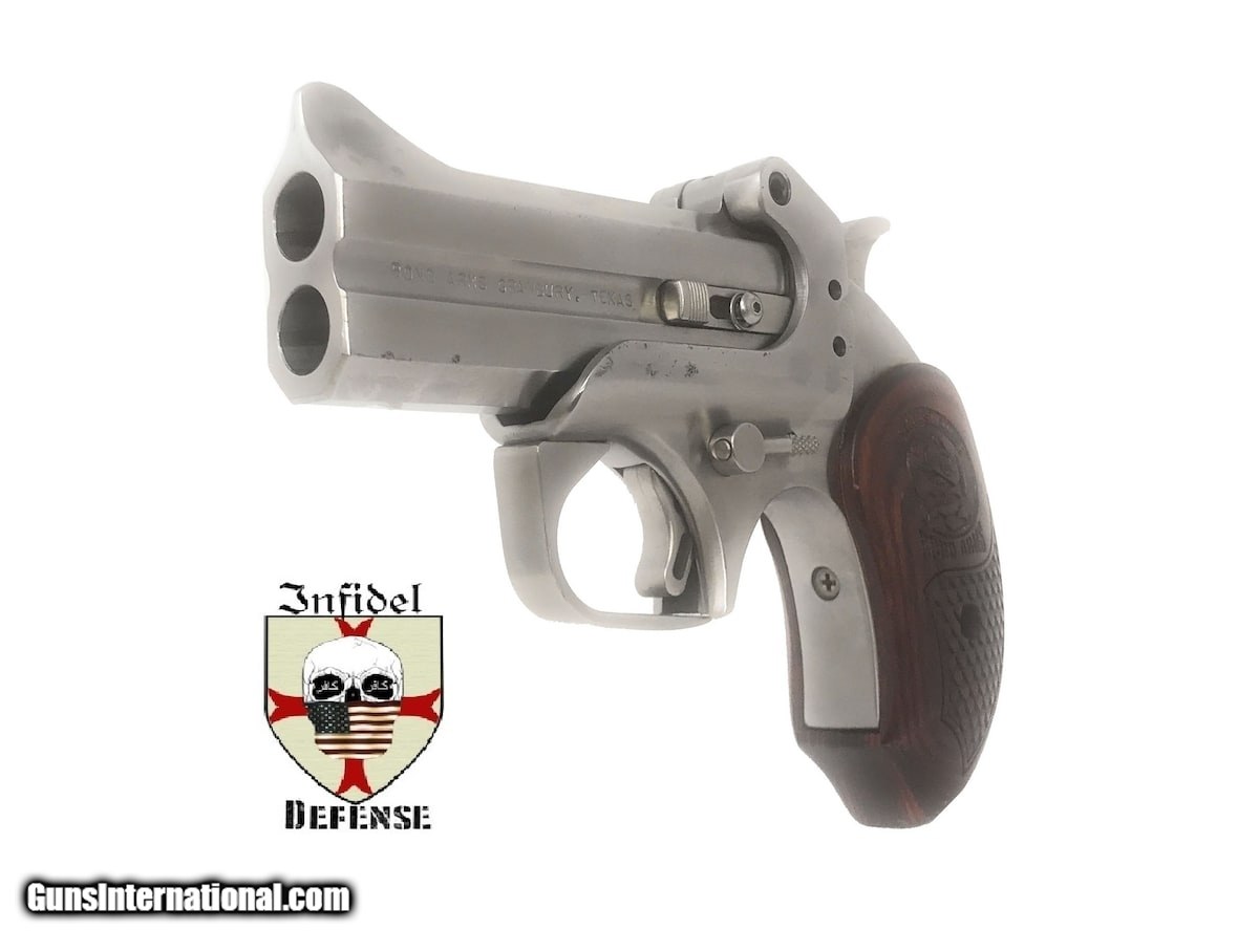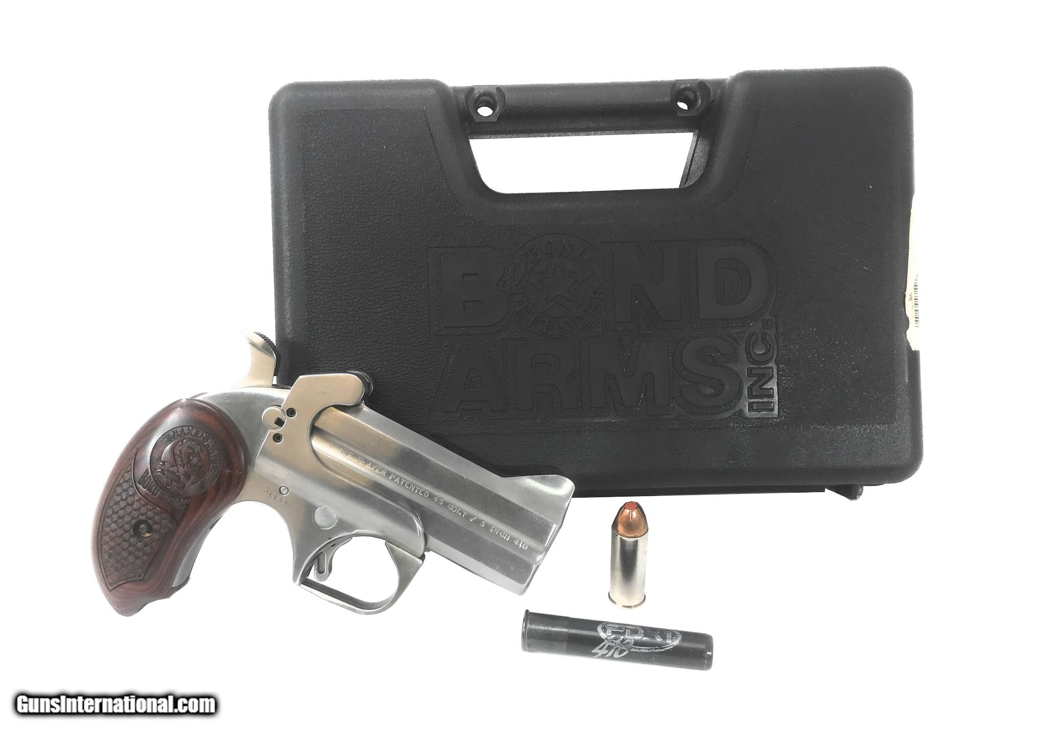 Description: Guns Listing ID: 270608 Manufacturer: Bond Arms Model: Snake Slayer Type: Derringer Pistol Caliber: .45 Colt/410 Serial No.: 91182 Capacity: 2 Barrel Length: 3.5\" Front Sight: Fixed Blade Rear Sight: Fixed Reaar Sight Action: Single Action Grip: Rosewood Grip Overall Length: 5.75\" Weight: 22.0 oz Safety: Cross Bolt Safety Handedness: Ambidextrous SKU: 22050032 Although The Derringer Pistol Is In Good Condition, It Has Signs Of Use, Some Marks On The Receiver And Barrel. (See Photos) SOLD Manufacturer: BOND ARMS Model: SNAKE SLAYER Caliber Info: .45 LC/.410 GA Condition: Used - Non-Certified Barrels: 3.5 BARREL Action: OVER/UNDER Finish: MATTE STAINLESS Weight: not specified |