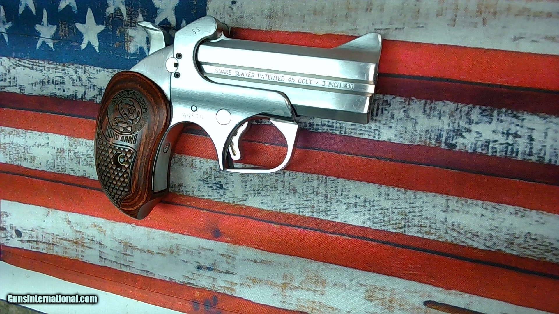 Description: Guns Listing ID: 847246 Overall good condition: firearm has some scratches on barrel and receiver. Comes with two grips: Rosewood and rubber. The Bond Arms Snake Slayer is a two shot derringer chambered for .45LC and .410 shotshells. Features include a 3\" barrel and chamber, a stainless steel finish, engraved rosewood grips, and a 2 shot capacity. SOLD Manufacturer: BOND ARMS Model: SNAKE SLAYER Caliber Info: 45 / 410 Condition: Used - Non-Certified Barrels: 3.5 BARREL Finish: STAINLESS |