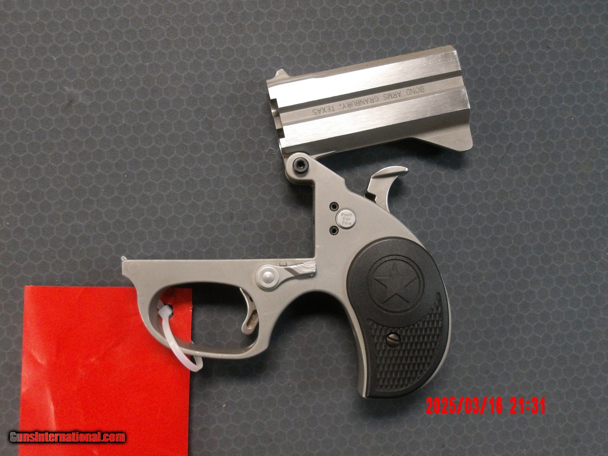 Description: Guns Listing ID: 499767 BOND ARMS Stinger - 9MM LUGER (9x19 PARA) - 2 ROUNDS - 3 \ SOLD Manufacturer: BOND ARMS Model: Stinger Caliber Info: 9MM LUGER (9x19 PARA) Condition: Used - Non-Certified Barrels: 3 Action: OVER/UNDER Finish: black & stainless |