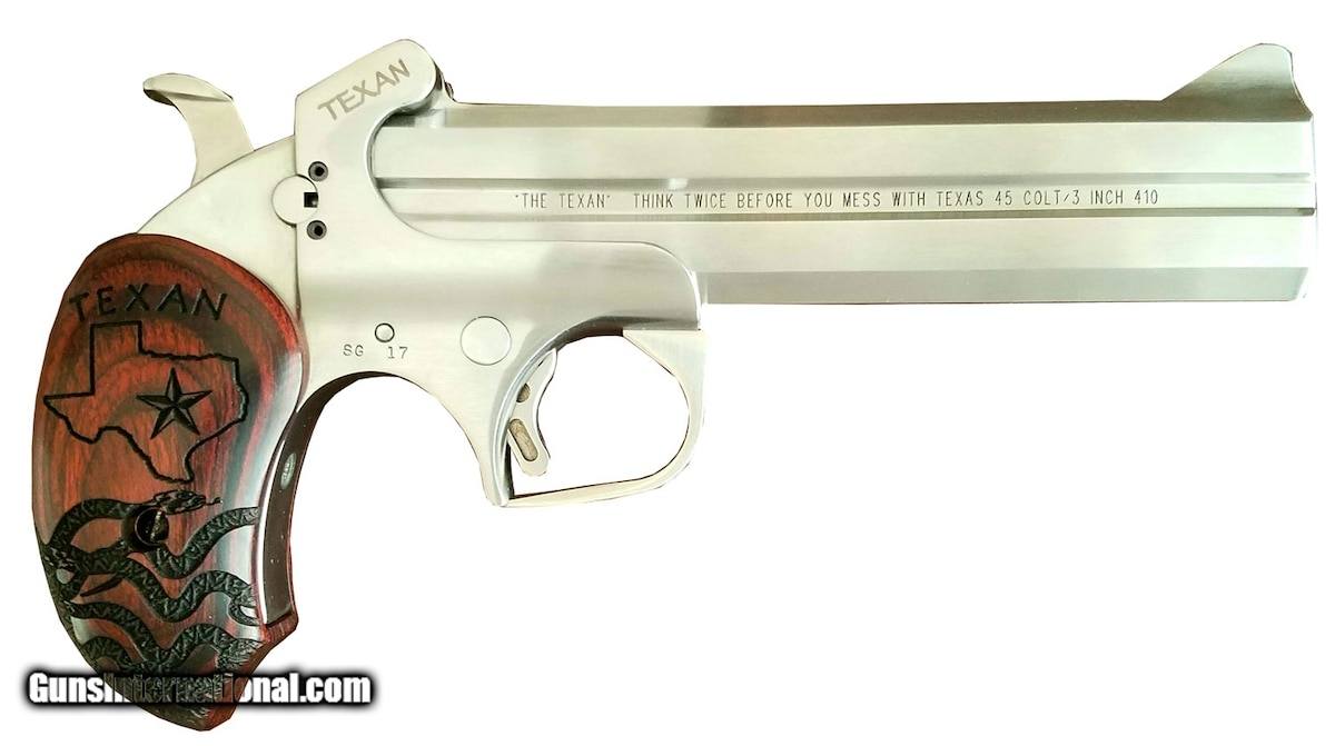 Description: Guns Listing ID: 264959 The Texan features a stainless steel double barrel and frame, rosewood grips with an outline of the state of Texas with a star as well as snakes criss-crossing at the bottom, and chambered for .45 Colt and .410 shot shells. SOLD Manufacturer: BOND ARMS Model: TEXAN Caliber Info: .45 LC Condition: new Barrels: 6" BARREL Finish: STAINLESS STEEL |