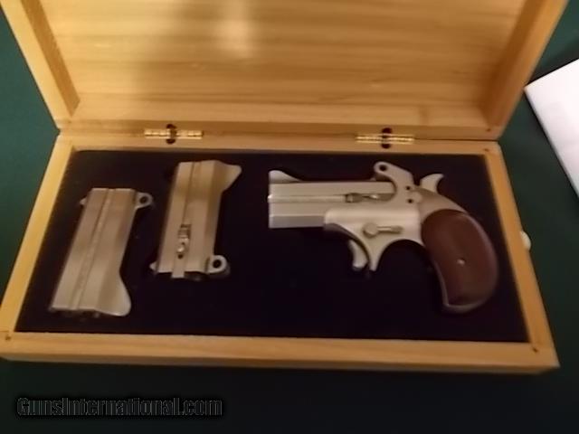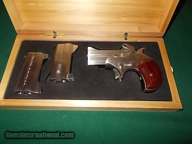 Description: 45LC/410-2.5", 45LC/45LC, 32 HR Magnum/32 HR Magnum, all 3 bbls are 3" in length, most compact failsafe construction of any derringer, unfired new in Alder display case SOLD |