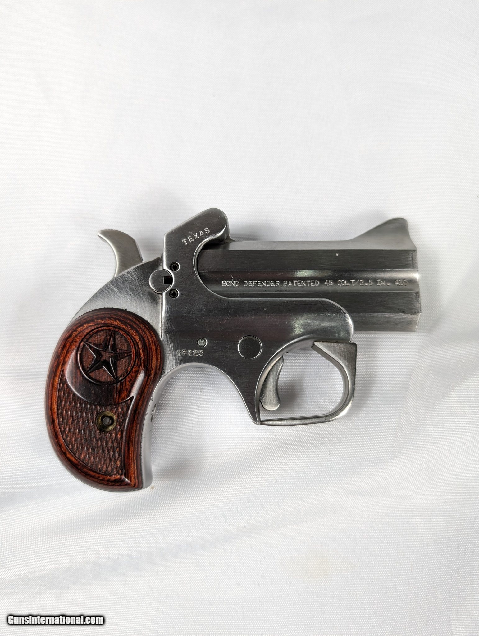 Description: Guns Listing ID: 1253845 THIS PISTOL IS IN EXCELLENT CONDITION AND COMES AS PICTURED SOLD Manufacturer: BOND ARMS Model: TEXAS DEFENDER Caliber Info: .45 LC/.410 GA Condition: Used - Non-Certified Barrels: 3 BARREL Finish: STAINLESS/WOOD GRIPS |
