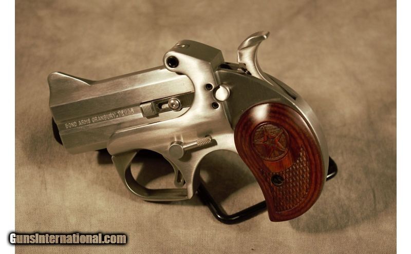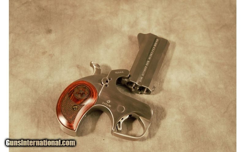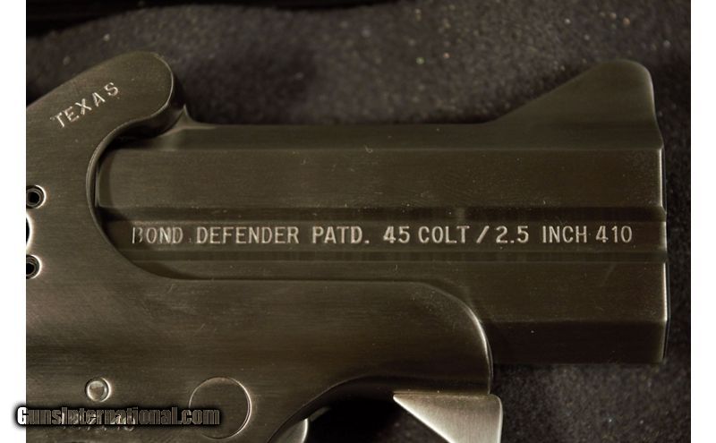 Description: The Bond Arms Texas Defender is a double barreled derringer that fires the 45 Long Colt round and can also fire 2.5" 410 GA shotgun shells whats unique about these firearms is that you can purchase different length barrels in several different calibers .45 Long Colt SOLD Chambers: 45 LC & 2.5" 410 shot shells Metal Condition: Very good little to no wear Wood Condition: Very good little to no wear Bore Condition: Very good little to no wear Barrels: 3 Item Location: Chesterfield, MI |