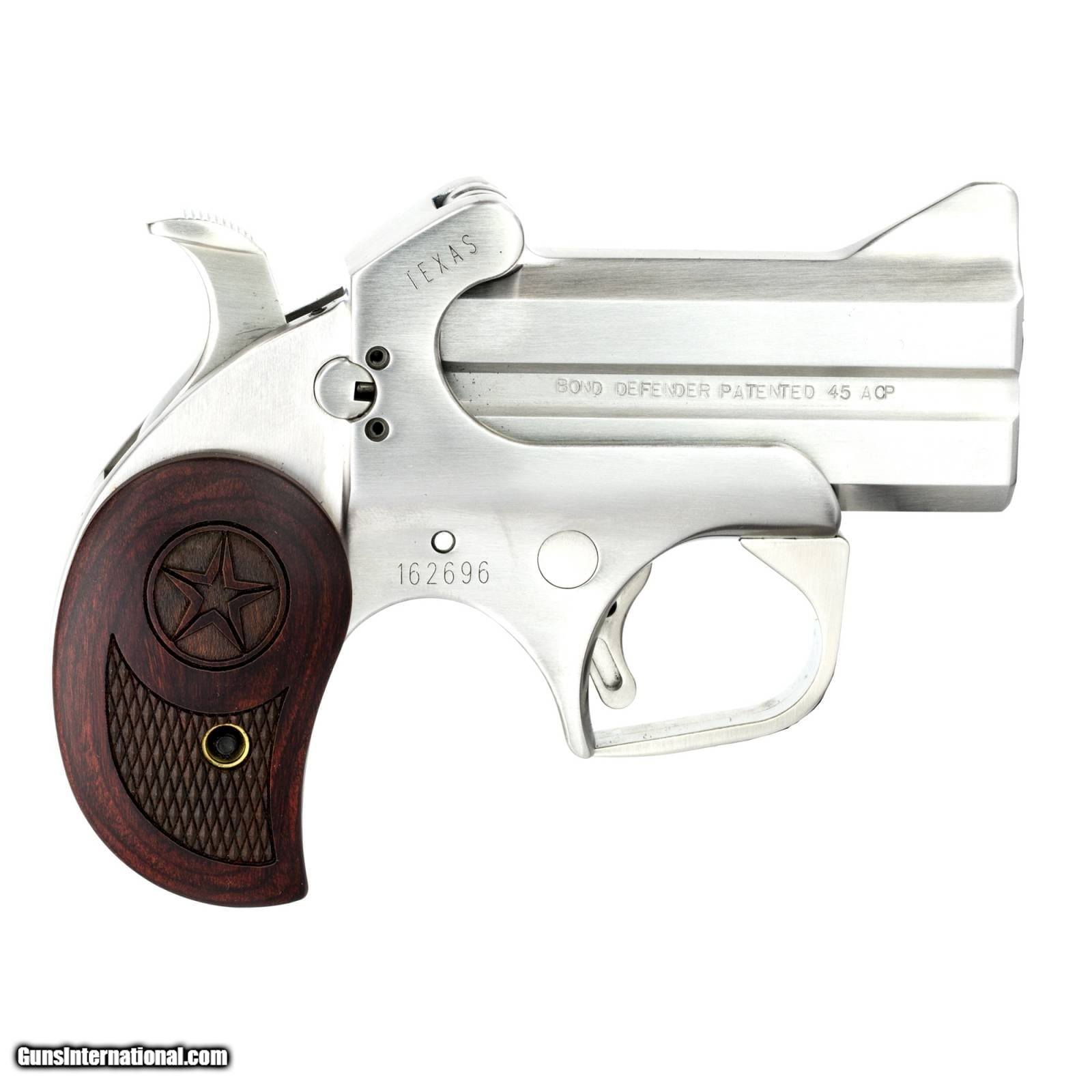Description: Guns Listing ID: 260088 They make em big in Texas and the Bond Arms Texan derringer is no exception. This over under has a 6 barrel and fires 45 LC and 410 bore. The stainless steel double barrel and frame are accompanied by extended rosewood grips feature an outline of the great state of Texas. The Bond Arms Texan derringer also features an automatic spent casing extractor making the process of reloading that much easier. Details Action SA - Caliber .45 ACP - Capacity 2rd - Barrel 3 Stainless Steel Satin - Sights Fixed Rear Blade Front - Frame Stainless Steel Satin - Grips Rosewood - Length 5 - Weight 20 oz. - Interchangeable barrels - Rebounding hammer - Retracting firing pins - Crossbolt safety - Spring-loaded cammed locking lever (for a tighter barrelframe fit and rapid loading and unloading) - Stainless steel with satin polish finish - Trigger guard SOLD Manufacturer: BOND ARMS Model: TEXAS DEFENDER Caliber Info: 45 ACP Condition: new Barrels: 3 BARREL |