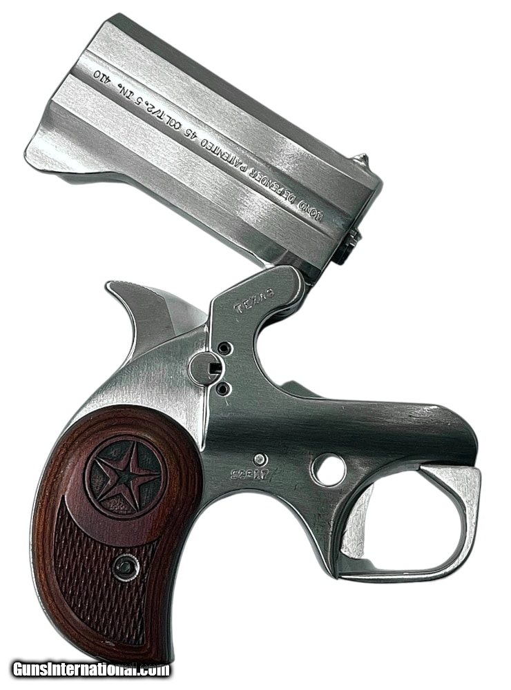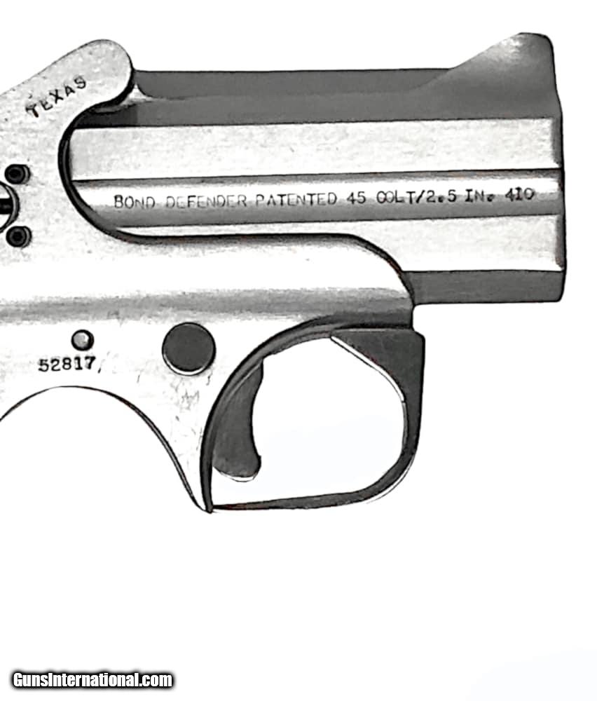Description: Guns Listing ID: 515519 Manufacturer: Bond Arms Importer: Bond Arms Model: Texas Type: Handgun Action Type: Single Shot Caliber / Gauge: .45 Colt Finish: Nickel Barrel Type: Over Under Grip Type: Wood Barrel Length: 2.5 Magazine Capacity: 2 Case included: no Condition: Used Notes: Lightly used. SOLD Manufacturer: BOND ARMS Model: Texas Caliber Info: .45 LC Condition: Used - Non-Certified Barrels: 2.5" BARREL Finish: NICKEL |