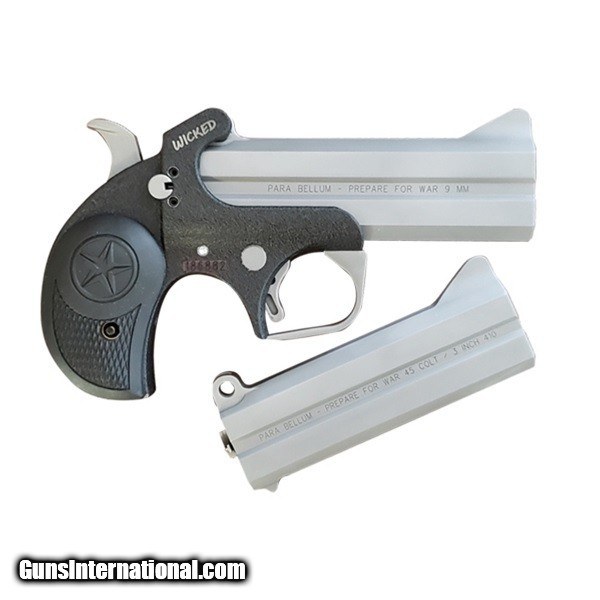 Description: BRAND NEW IN THE BOX AND READY TO SHIP! BUY IT NOW!! Manufacturer: Bond Arms Inc. Model: Wicked Package Combo SKU: BAJW Caliber: 9mm / .410 / .45 Colt Barrel Length: 4.25" Matt Stainless Steel Capacity: 2 Rounds Frame: Black Stainless Steel Grips: Black Rubber Sights: Blade Front, Fixed Rear Overall Length: 5.5" Weight: 30 oz The Bond Arms Wicked is a very special edition gun that you can get for a limited time! In honor of our gun being the FIRST TWO SHOT of the movie John Wick 3, we put together a special package that includes a 9mm Bond Arms with a 4.25" barrel just like the one that John Wick shot in the movie, plus an extra 4.25" 45/410 barrel. STANDARD FEATURES: