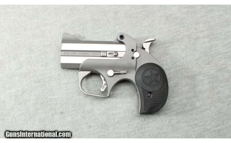 Description: Bond Arms Rowdy 45 Colt/.410. The compact, yet rough-looking, Rowdy is a new type of Bond Arm gun. It's built with a 3-inch barrel chambered for 45/410. It also has a 2nd 3-inch barrel that is chambered in .38 Special/.357 Mag. It has Stainless steel barrels and frame and is compatible with all standard Bond Arms barrels. It has an automatic spent casing extractor, patented rebounding hammer, retracting firing pins, and cross-bolt safety. Includes original box. .45 Colt / 410 Gauge SOLD Chambers: ".45 Colt/.410, .38 Special/357 Mag Metal Condition: Excellent Bore Condition: Bright Barrels: "3 Inch .45 Colt/.410, 3 Inch .38 Special/357 Mag Triggers: Factory Weight: 1 lb 4 oz Sights: Fixed Item Location: La Vista, NE |