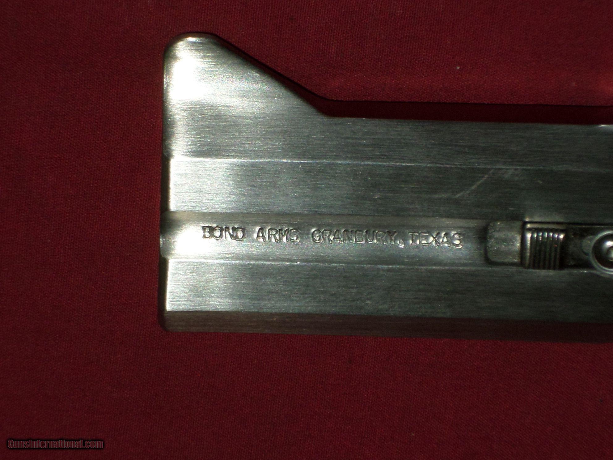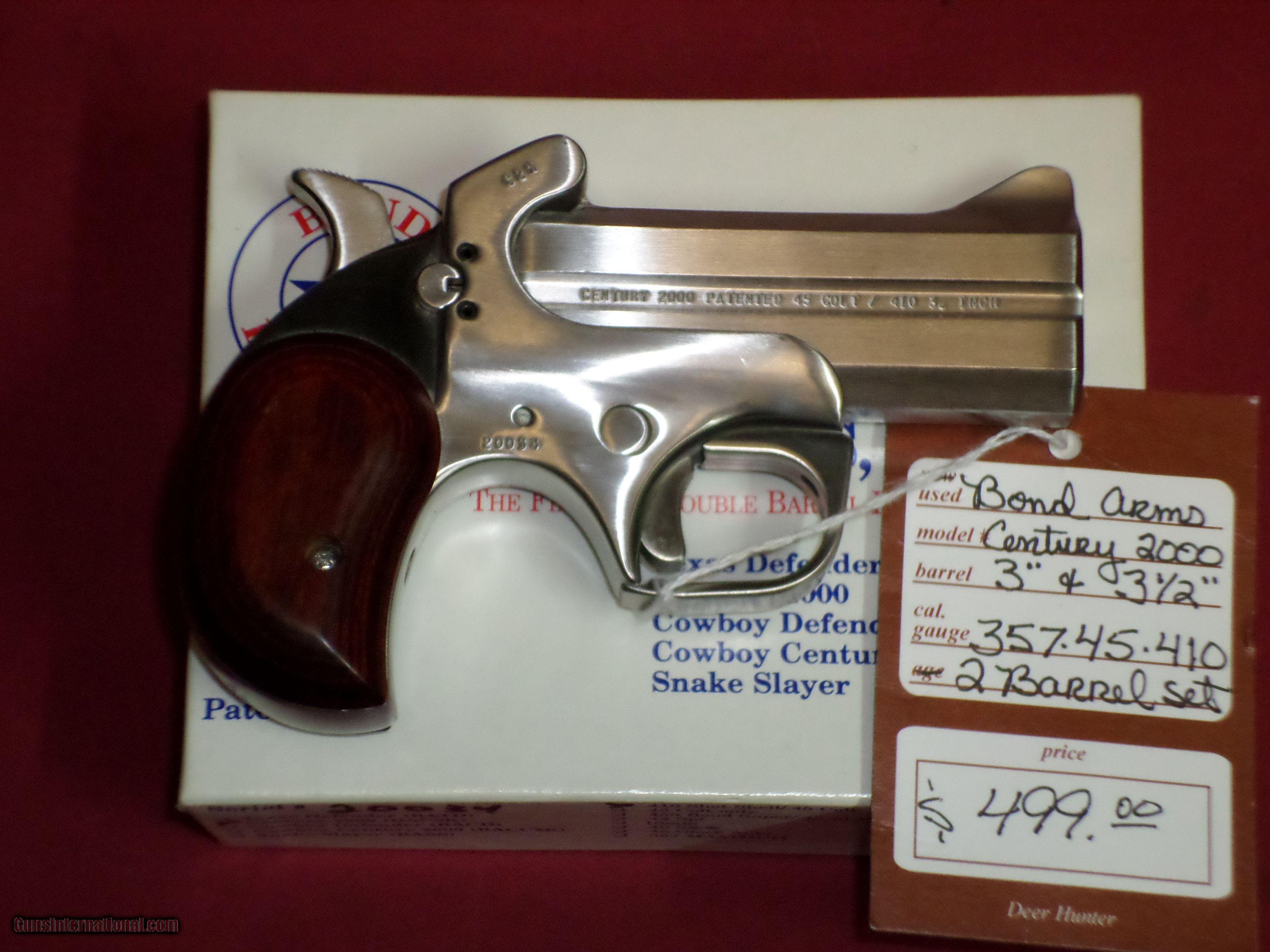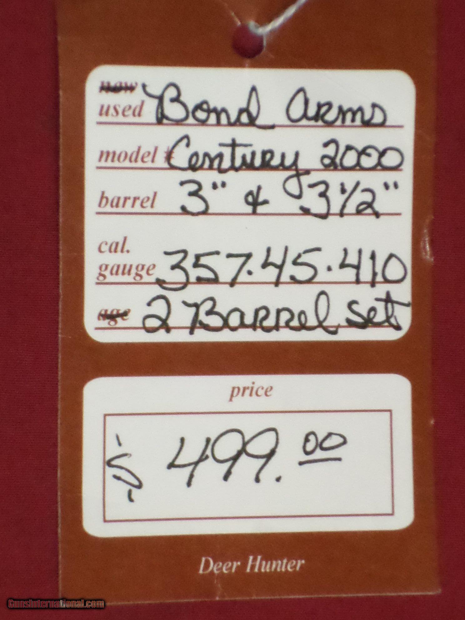 Description: SOLD PENDING For sale, Bond Arms Century 2000, 2 bbl set, .45/.410 ..5", .357 3". Like new in the box. To see more of our inventory, visit deerhunterguns,com We collect 7% sales tax for Florida sales. We accept MC, Visa and Discover, no AmEx. No Sales to California. Like us on Facebook: Deer Hunter Guns SOLD |