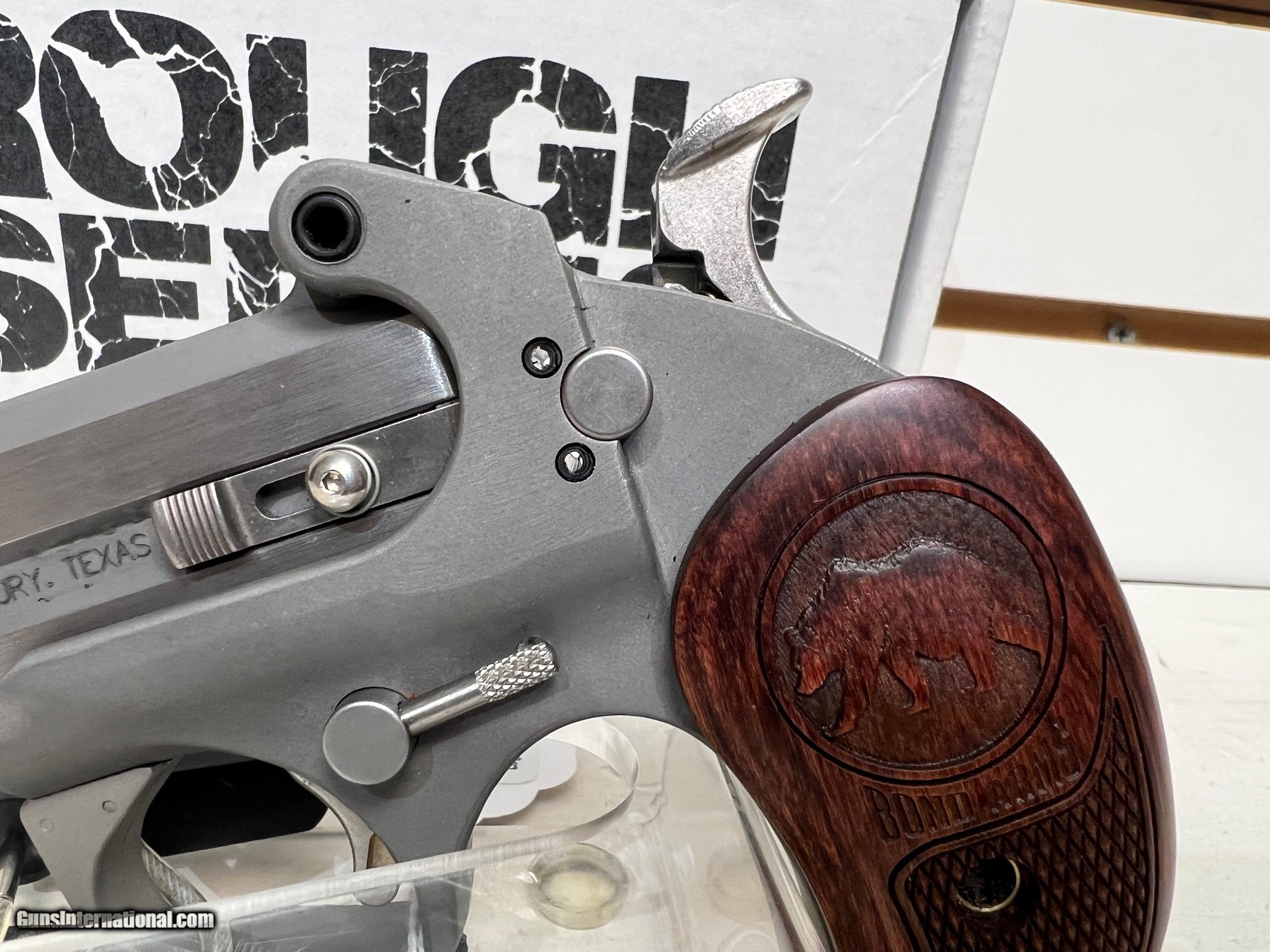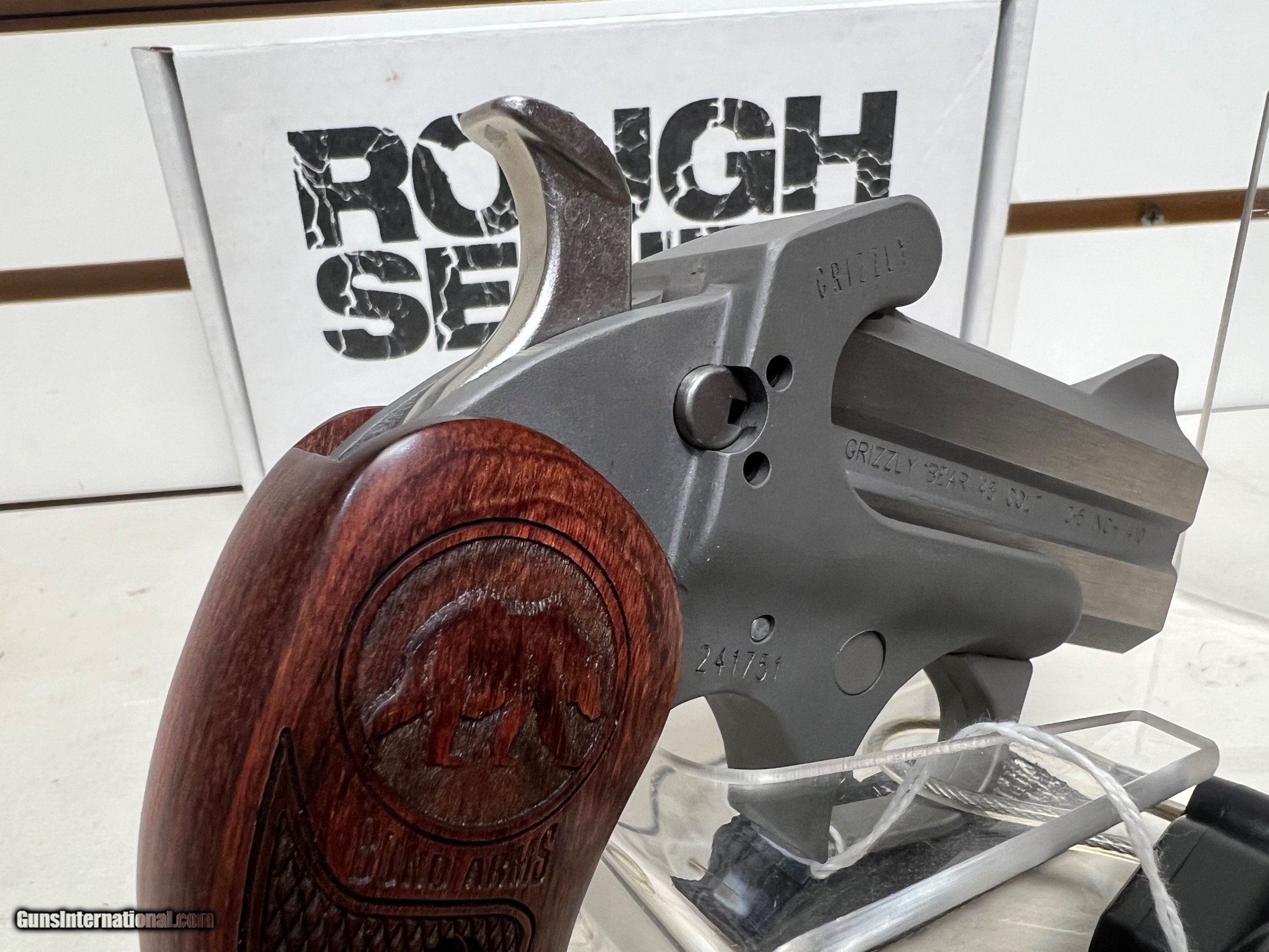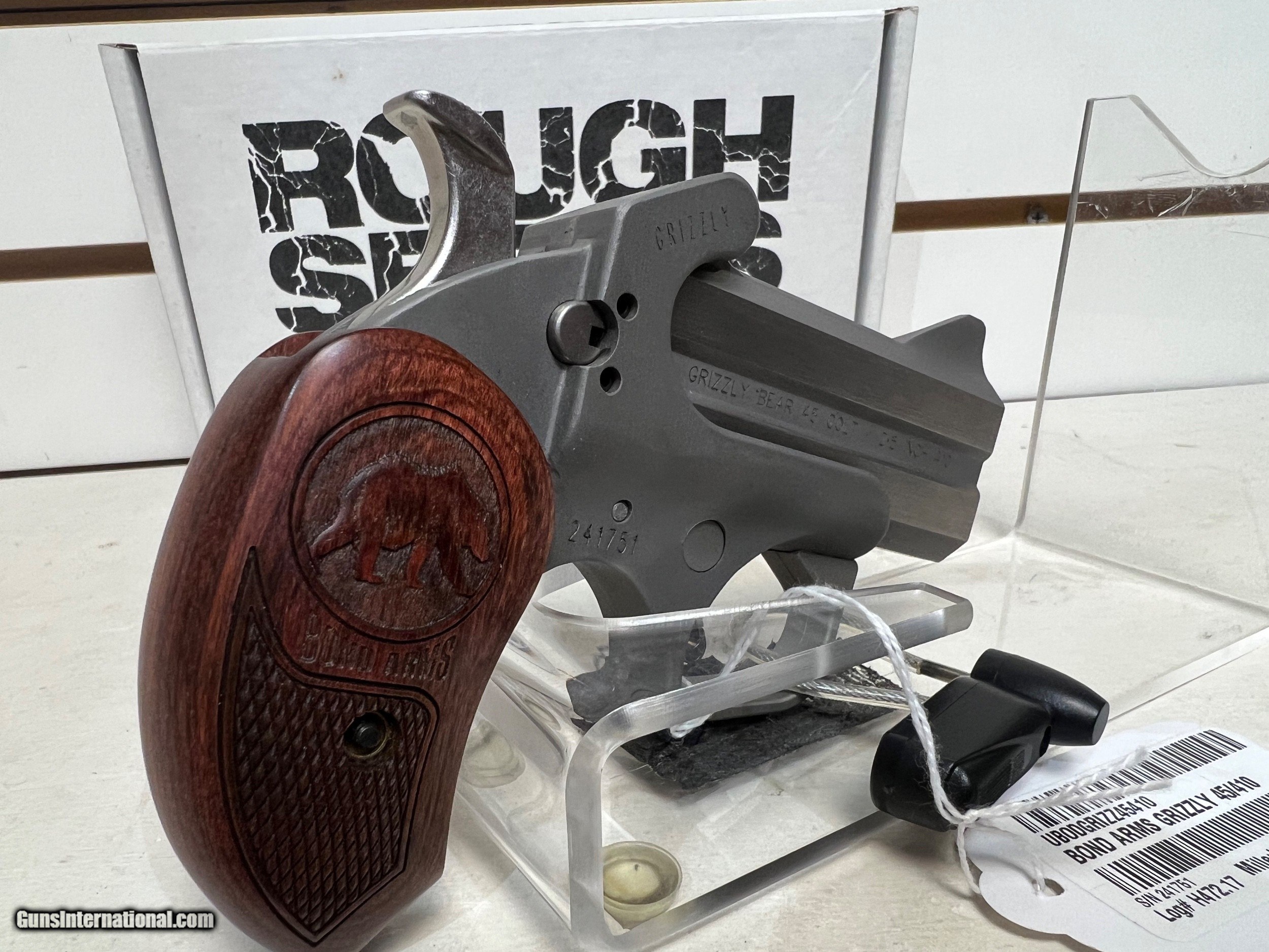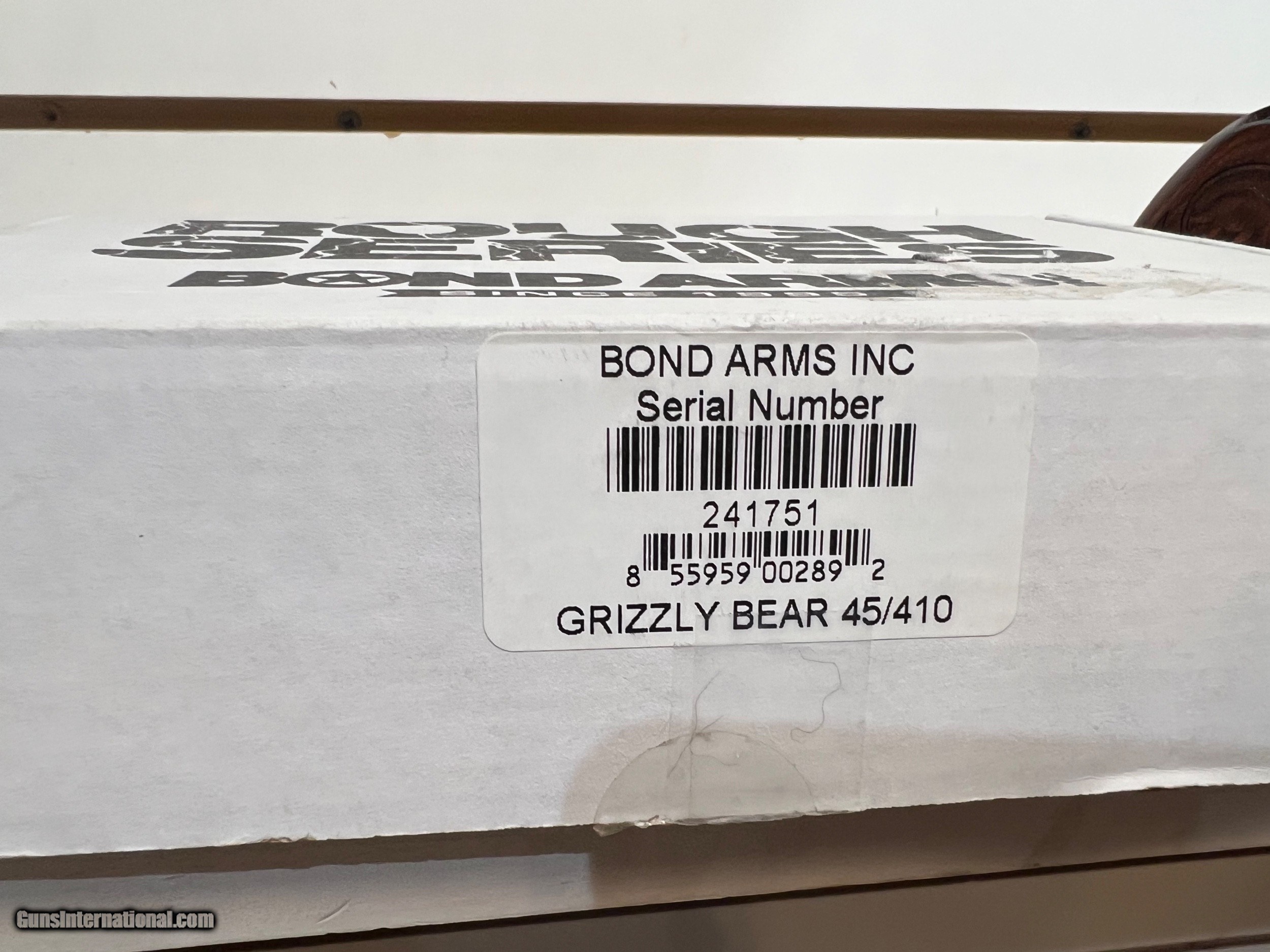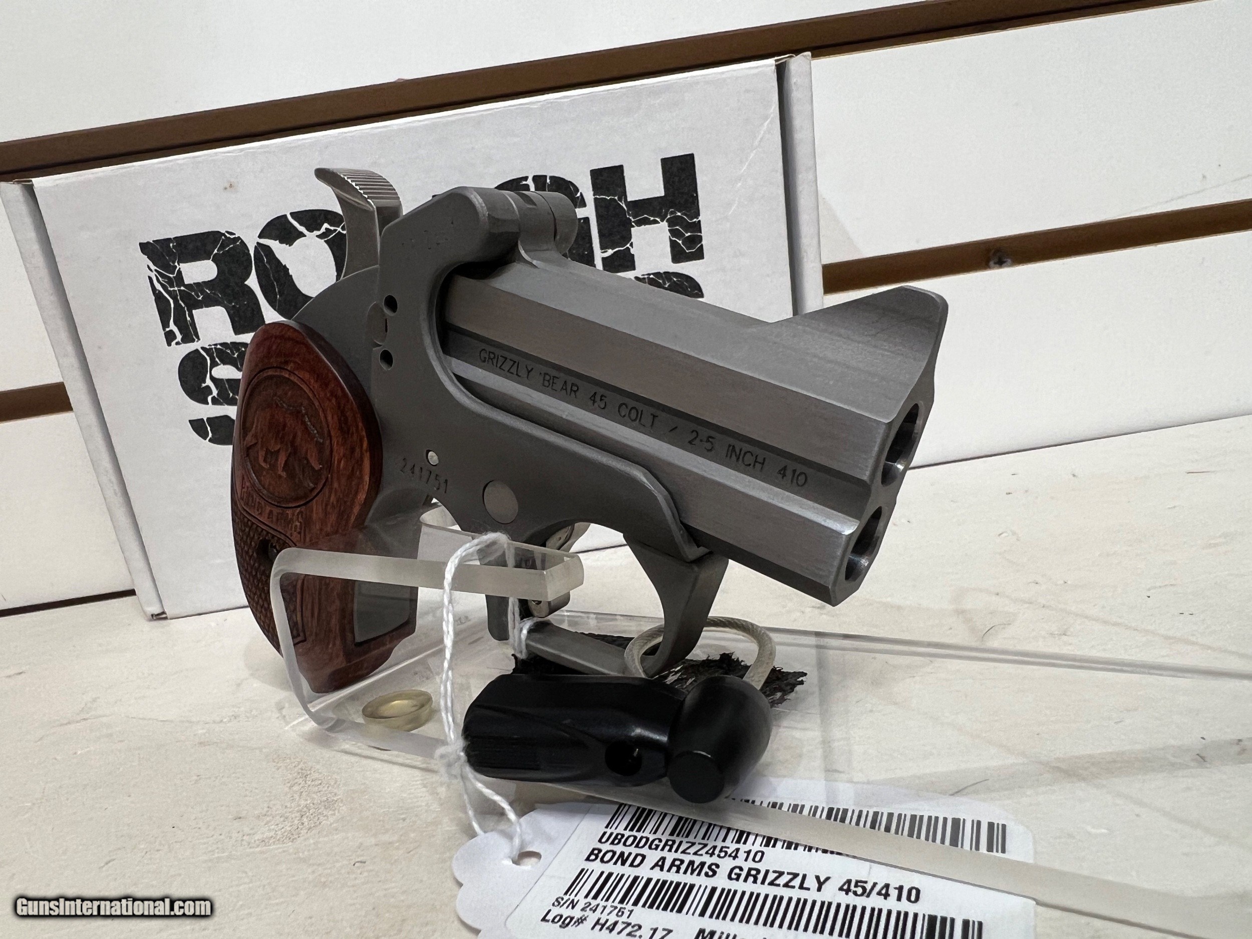 Description: Bond Arms Grizzly 45/410 With Box Model #:BAGR MSRP:$377.00 Caliber.45LC/.410 Barrel Length3" Grip MaterialRosewood Grip SizeExtended SightsFront blade, fixed rear Length5" Weight20 ounces Trigger GuardYes SOLD Manufacturer: Bond Arms Model: Grizzly Serial Number: 241751 Barrel Length: 3 |