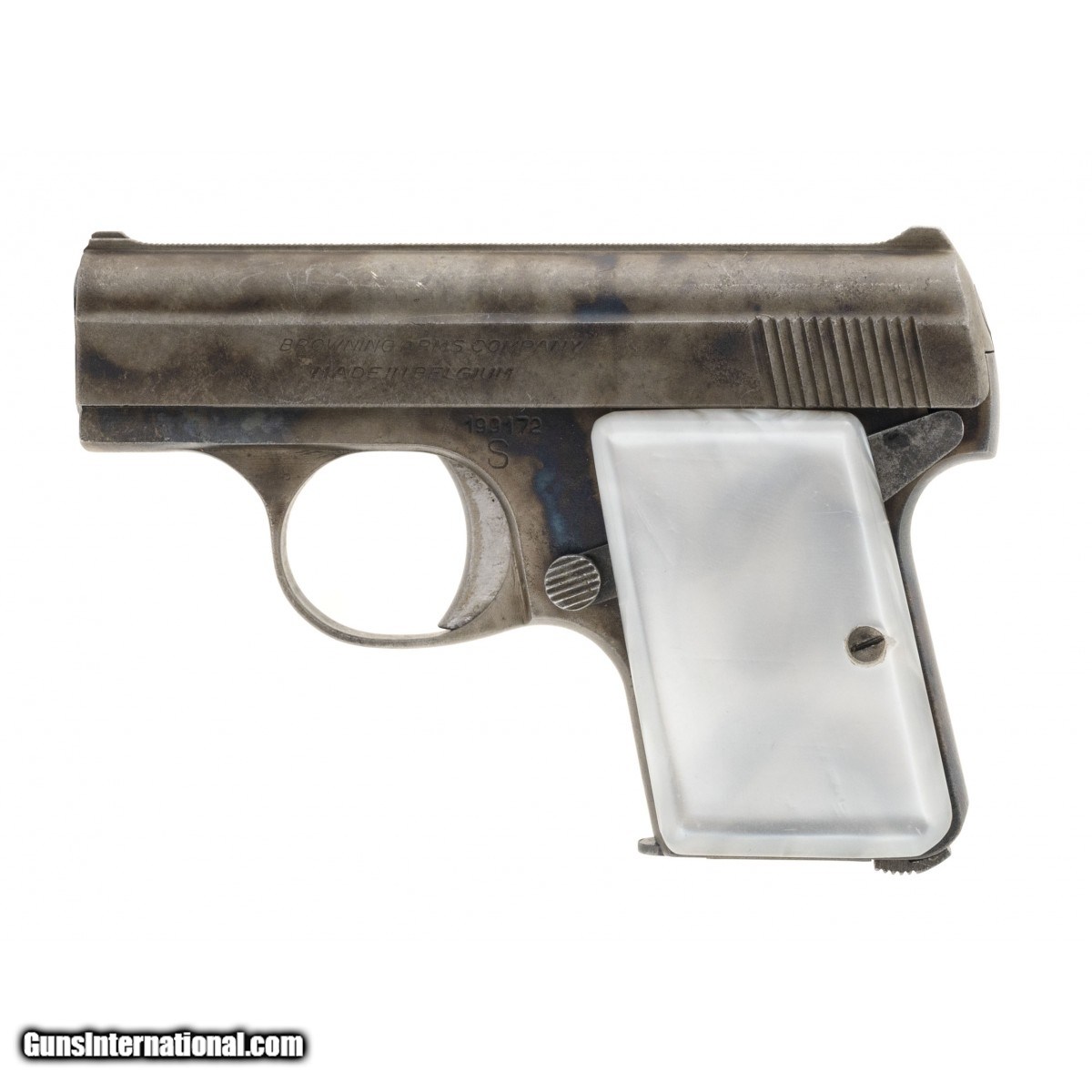 Description: " SN: 199172S. Manufactured circa 1959, .25 ACP with a 2"" barrel. Belgian made pocket pistol with custom case color finish and faux pearl grips. right side shows some light surface pitting. Overall good to very good condition. SOLD |