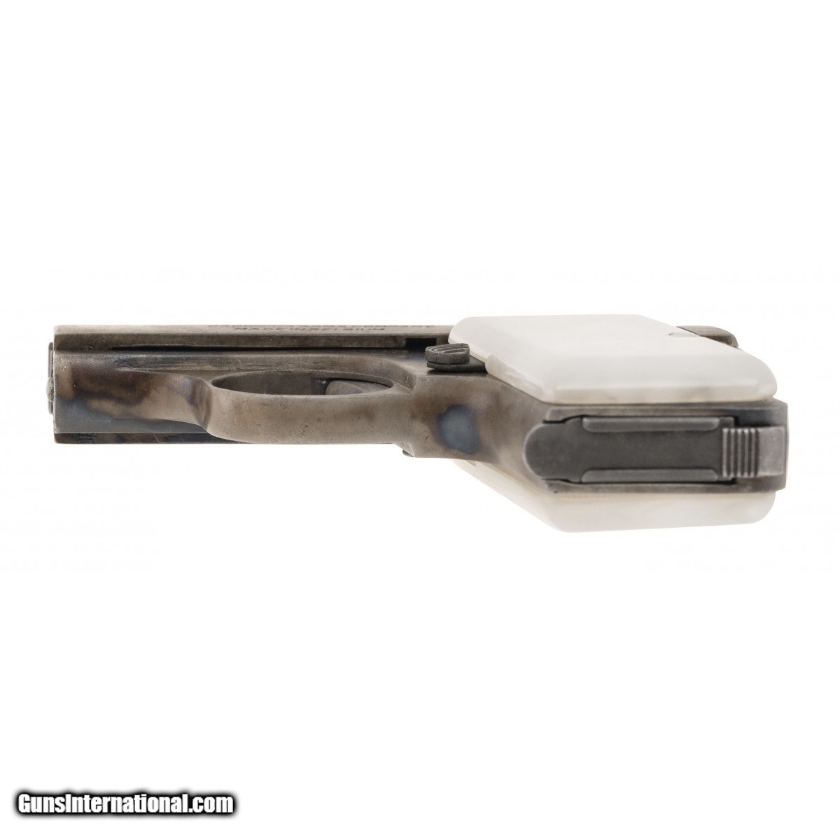 SN: 199172S. Manufactured circa 1959, .25 ACP with a 2"" barrel. Belgian made pocket pistol with custom case color finish and faux pearl grips. right side shows some light surface pitting. Overall good to very good condition.