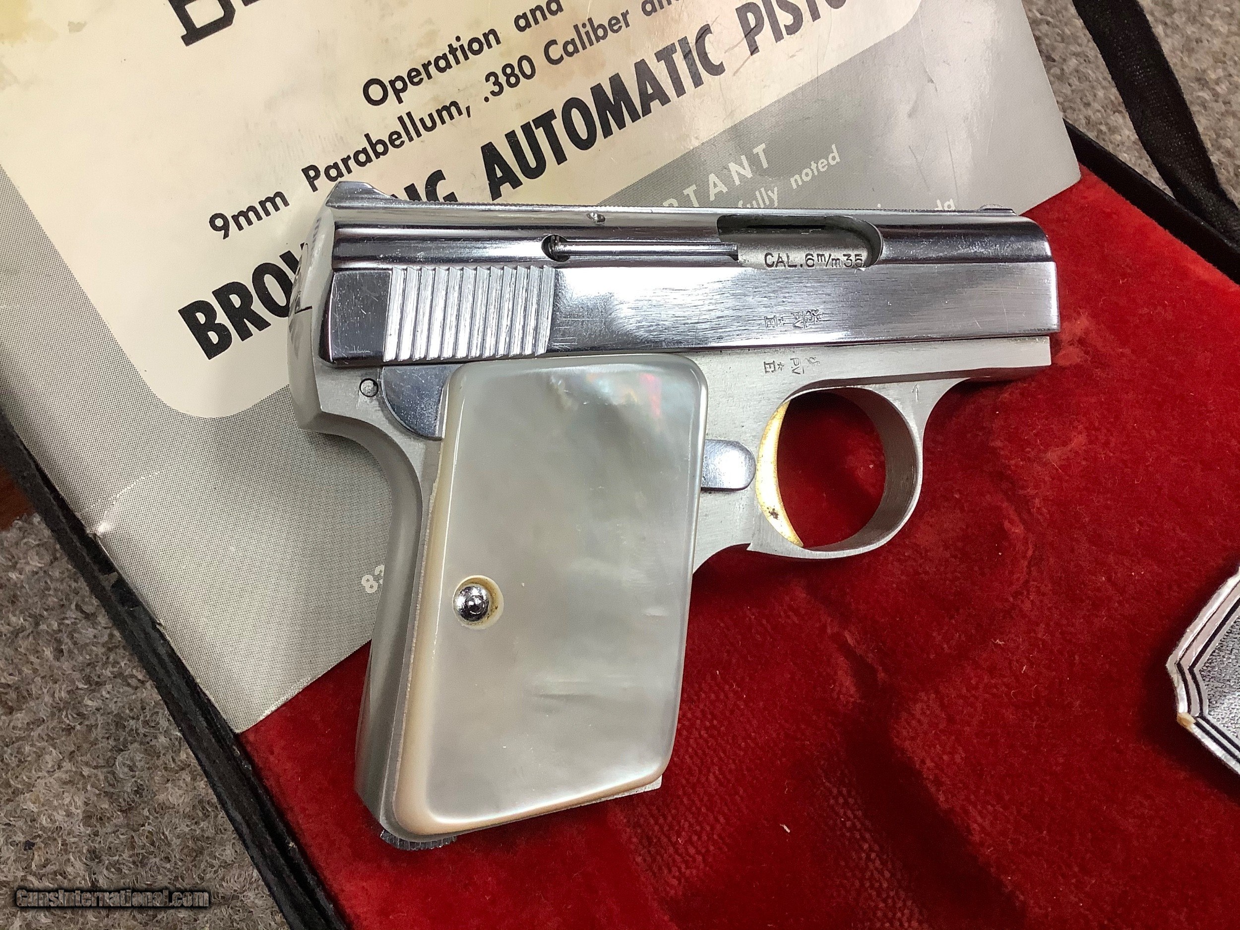 Description: Baby Browning Lite. Chambered in 25ACP (6.35mm). This is a like in the box gun. It has a couple of minor handling marks. I would rate the gun at 99%. It has original mother of pearl grips, no cracks or chips. Serial Number is 208XXX which puts at a 1959 date of manufacture. It comes with original black and red velvet box and papers as well as Original Browning black leather and red velvet pisttol rug. Has one magazine. This gun is pristine and is a fine addition to any collection. Shipping $30 to your FFL cards add 3%. Any Questions please call 561-419-0695 SOLD |