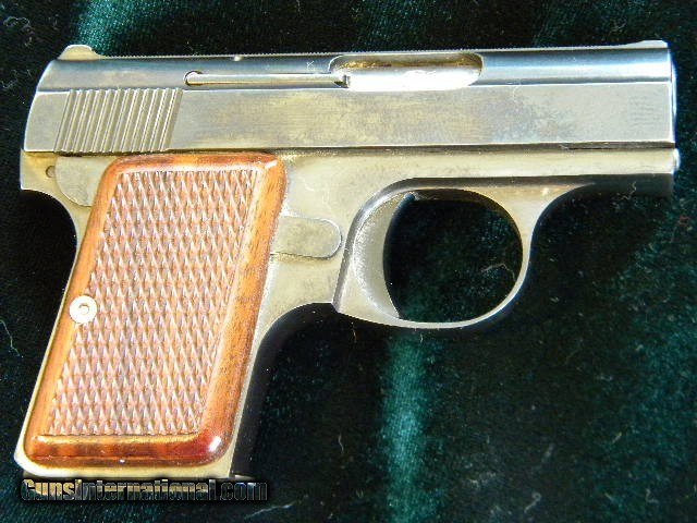 Description: Brownin Baby in overall excellent condition. Bore 100%, Blue 100% Grips 100%. SOLD Curio/Relic: Yes Handgun Caliber: .25 ACP (6.35mm Browning, 6.35×16mmSR) Manufacturer: Browning Model: Baby Serial Number: 448222 Barrel Length: 2.00 Condition: Excellent Metal Condition: Excellent Wood Condition: Excellent Bore Condition: Excellent Action: Single-semi |