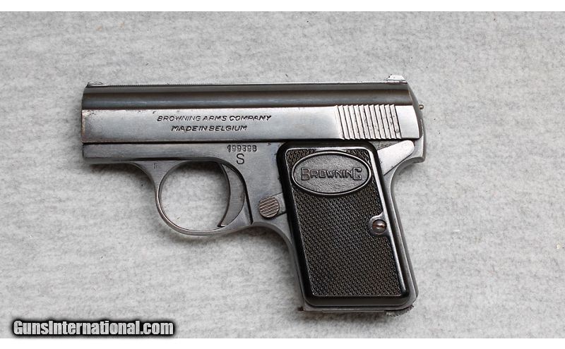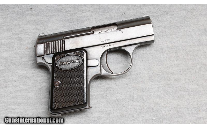 Description: Very good, some finish wear and small scratches, comes with one mag. Classic Browning pocket size semi auto manufactured in Belgium in1959. .25 ACP SOLD Curio/Relic: Yes Chambers: Semi auto Metal Condition: Very good Bore Condition: Bright Barrels: 2 Triggers: Factory Butt Pad: Factory grips Sights: Fixed sights Item Location: La Vista, NE |