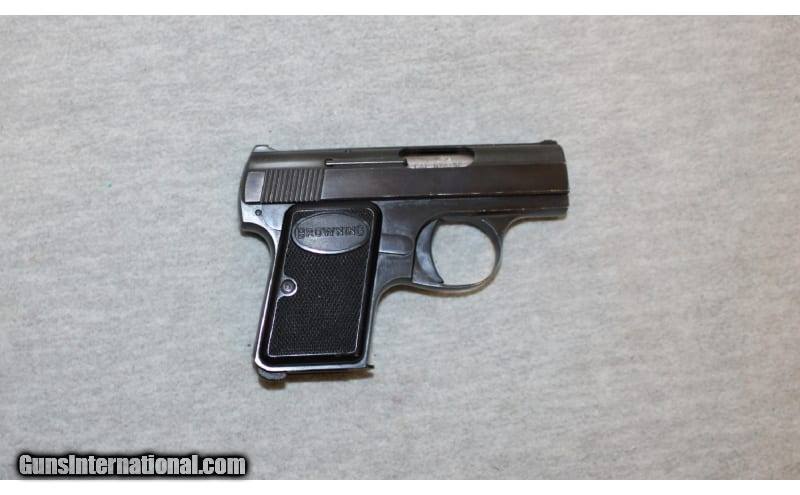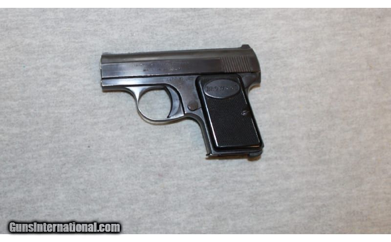 Description: Browning Baby Browning in .25 ACP. This is a small blowback-operated semi-automatic pistol chambered in .25 ACP (6.35x15 mm). The pistol features a six-round magazine capacity and is a striker-fired, single action, blow back mechanism. The manual thumb operated safety locks the slide in the closed position when engaged using side thumb pressure. Manufactured in 1968. Includes 1 magazine. .25 ACP SOLD Metal Condition: Excellent Bore Condition: Bright Triggers: Factory Sights: Fixed Item Location: La Vista, NE |