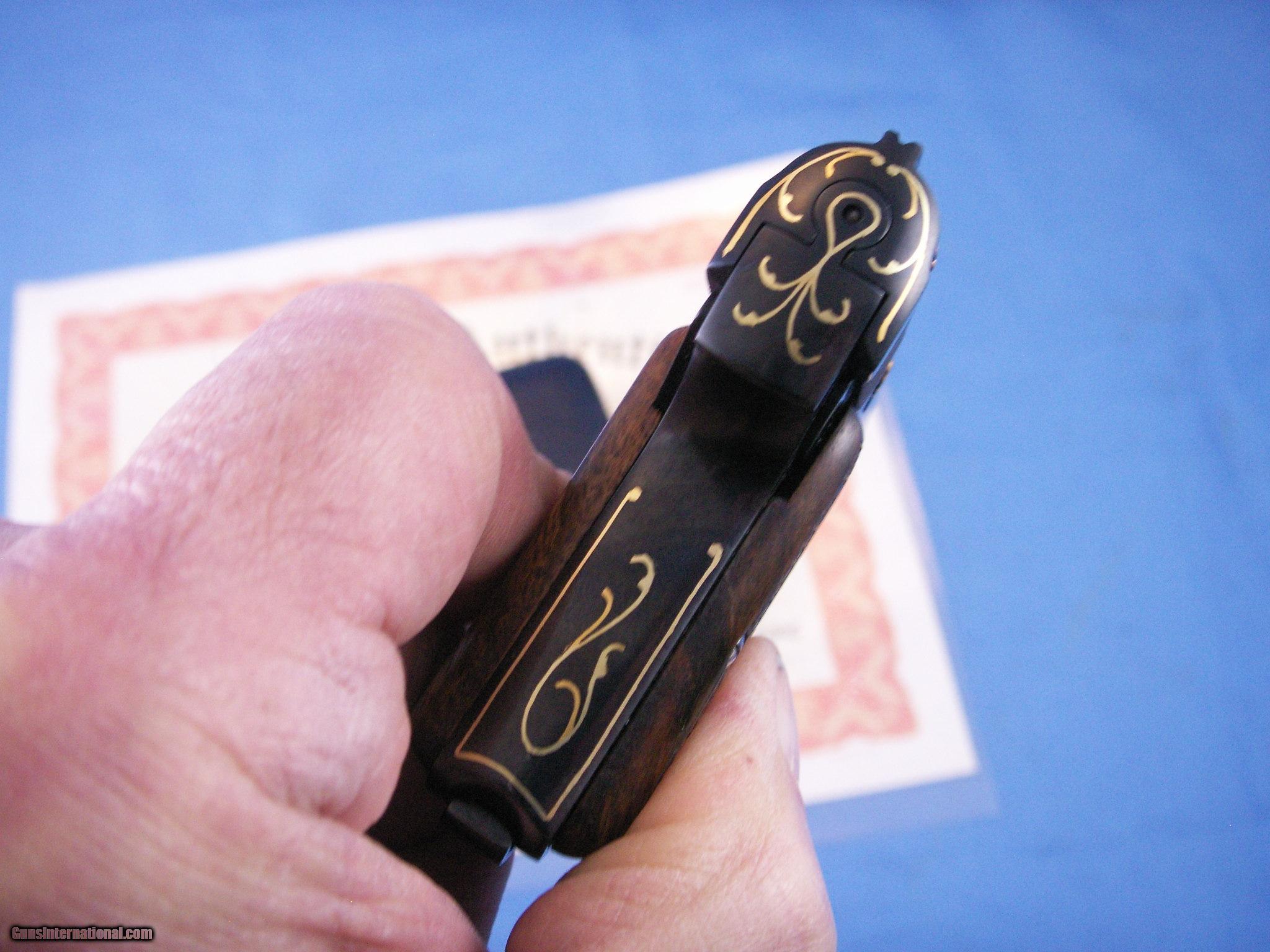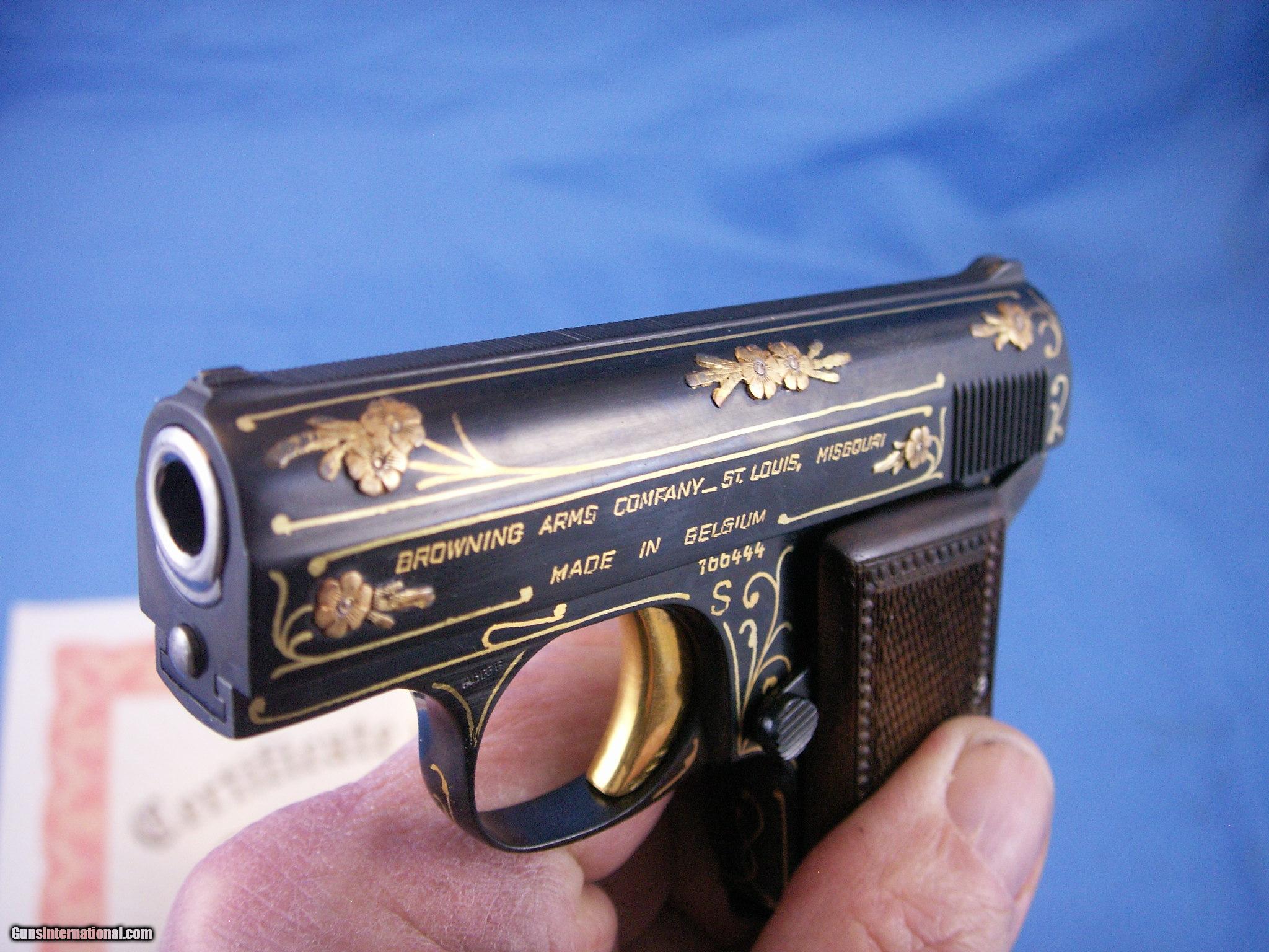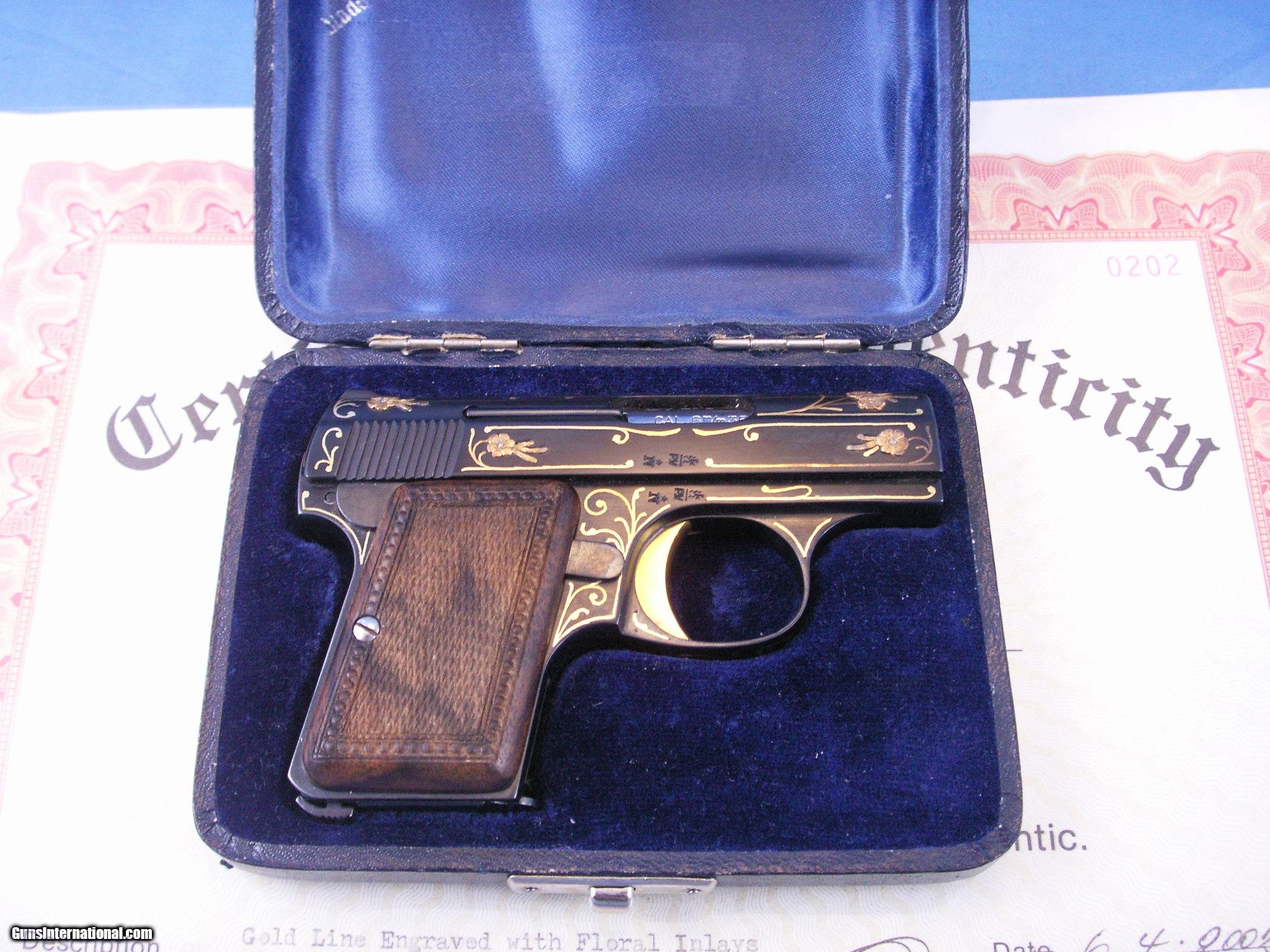 Description: SOLD Pending Funds: Browning "Baby" Belgium manufactured by FN for Browning Arms Co. This 1957 manufactured semi-automatic pistol was engraved and gold inlayed by Browning Master Engraver Angelo Bee in 2002. The gold line engraving is enhanced by the 3 different colored gold floral (9) inlays. The gun is in 6.35 mm (.25 ACP) caliber with a 2" barrel. The gun is new condition and comes in the very rare Blue Browning Presentation case. Accompaning the gun/case is the Certificate of Authenticity signed and dated by Angelo Bee. This beautiful and one of a kind Gold Inlayed Browning is an outstanding example of Europeon craftsmanship and would be a great addition to any collection of fine firearms. SOLD Curio/Relic: Yes |