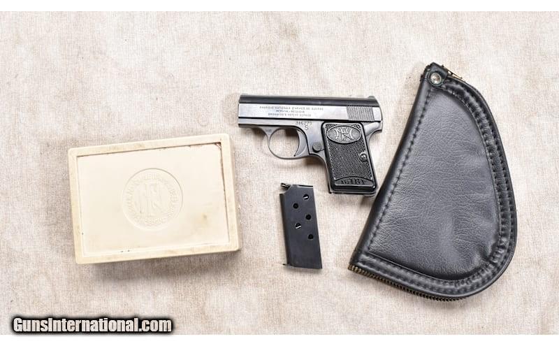 Description: The Browning "Baby" is arguably one of the most copied pistol designs. It is exceedingly tiny and light at 4 inches overall length and 2-3/4" height. It will fit in the tiniest pockets, and was arguably designed for vest pockets when gentlemen wore three-piece suits. This one is in near excellent condition with slight wear on the sharp edges. It comes with the standard kit including factory paper, plastic box, and Browning soft case. 6.35mm (.25ACP). Chambers: 6+1 capacity Metal Condition: Very good. Slight blue wear on some of the sharp edges. Wood Condition: Very good to excellent. Bore Condition: Shiny and bright with good rifling. Triggers: Factory single action only. Butt Pad: Black plastic with "FN" logo at top and "BABY" at the bottom. Weight: 10 Oz Sights: "Fixed, low-profile, post and notch. Item Location: Rogers Price: $1,399.99 Contact Seller |