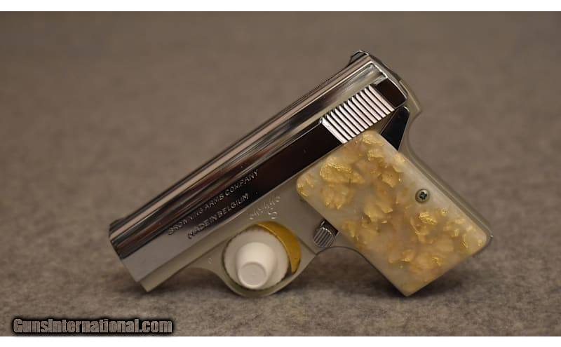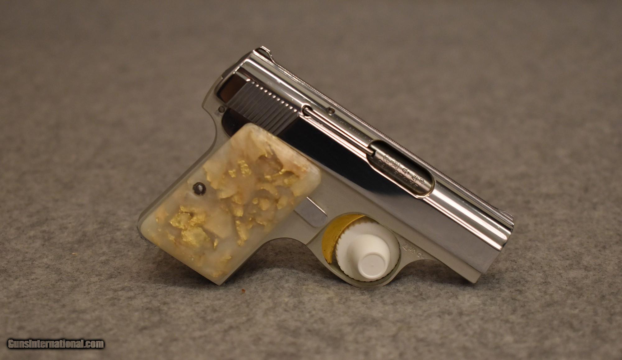 Description: 6.35mm (.25ACP). SOLD Curio/Relic: Yes Chambers: 6.35mm Metal Condition: Excellent Wood Condition: Excellent Bore Condition: Excellent Barrels: 2 Stock Dimensions: Aluminum Butt Pad: Pear Grips Weight: 2 oz Item Location: Garner, NC |