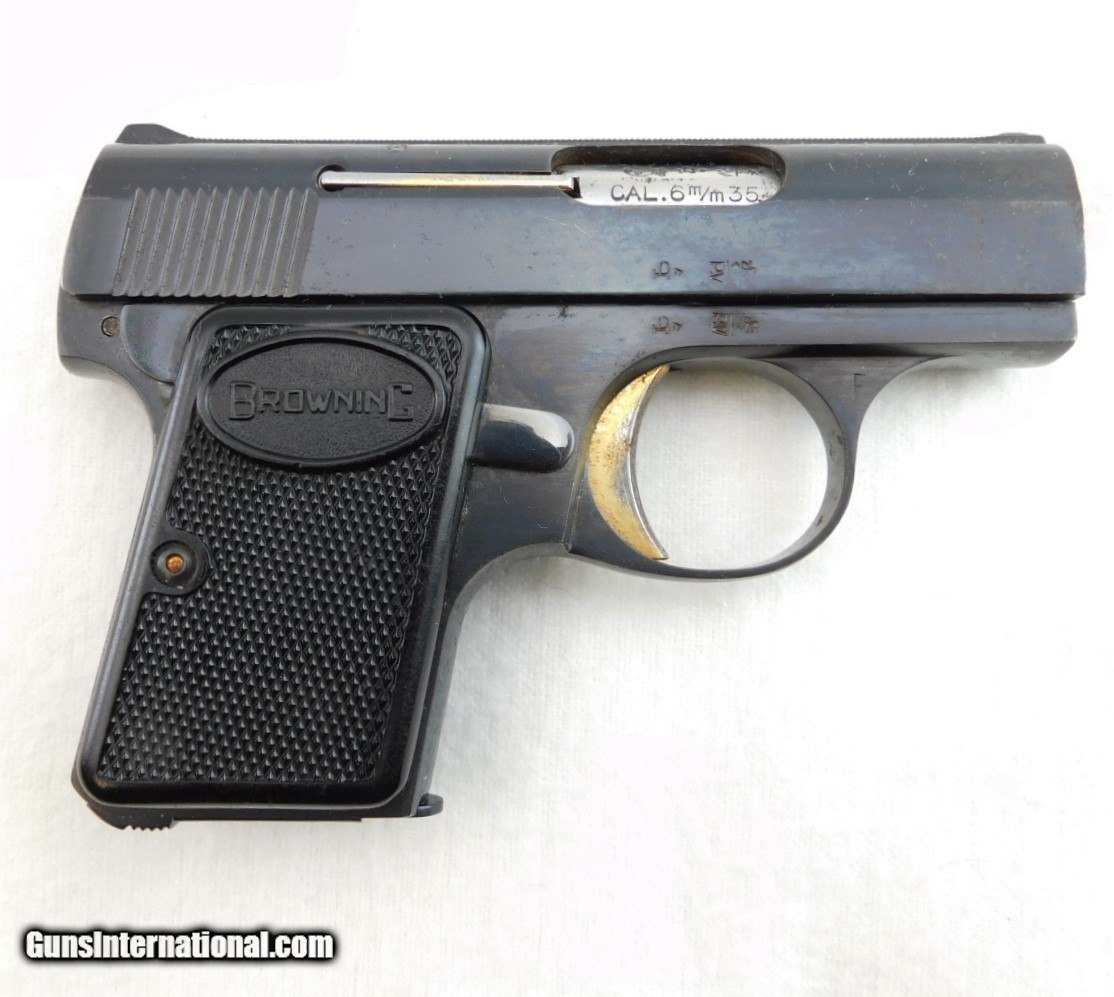 Description: Browning Baby Belgium .25 ACP, 2" bbl, shiny bore, good rifling, blued finish, iron sights, Browning checkered grips, and one 5 round magazine. Add 3% for Credit Card Shipping $25.00 SOLD |