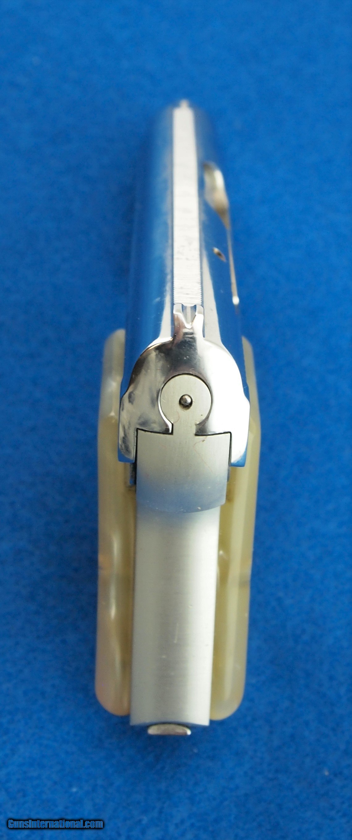 Description: Very Nice Browning Baby Belgium Nickel MFG 1967 .25 ACP WCase, 2" bbl, bright shiny bore, good rifling, Nickel finish, iron sights, pearl grips, original operation manual, original zipper pouch, and one 5 round magazine. What an addition this pistol will be to your collection! Add 3% for Credit Card Shipping $25.00 SOLD |
