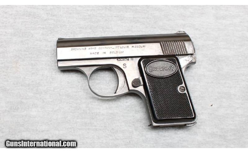 Description: Browning Baby Browning in .25 ACP. This is a small blowback-operated semi-automatic pistol chambered in .25 ACP (6.35x15 mm). The pistol features a six-round magazine capacity and is a striker-fired, single action, blow back mechanism. The manual thumb operated safety locks the slide in the closed position when engaged using side thumb pressure. Manufactured in 1957. 6.35mm (.25ACP) SOLD Metal Condition: Very good with minor surface rust on the back left frame and on the barrel in the location of the ejection port. Bore Condition: Bright Barrels: 2 Inch Triggers: Factory Butt Pad: Factory grips Sights: Fixed sights Item Location: La Vista, NE |