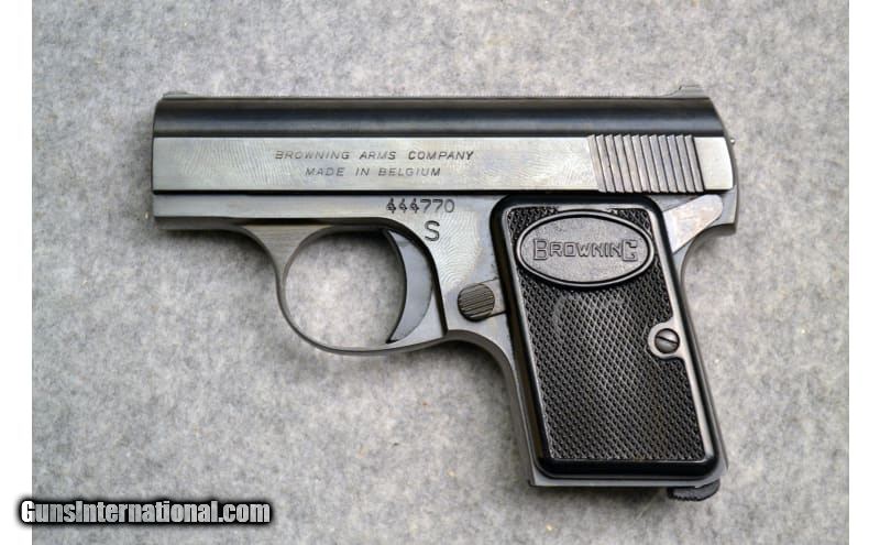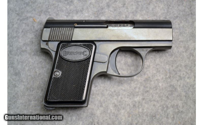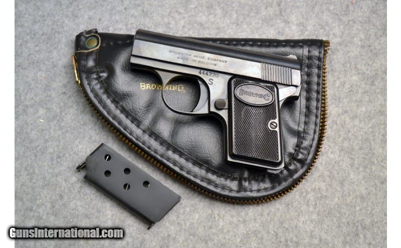 Description: This Baby Browning 6.35mm/.25 ACP is in very good condition for its age. Made in Belgium. Includes a soft case and one magazine. 6.35mm (.25ACP). SOLD Curio/Relic: Yes Barrels: 2 Weight: .5 lb Item Location: christiana |
