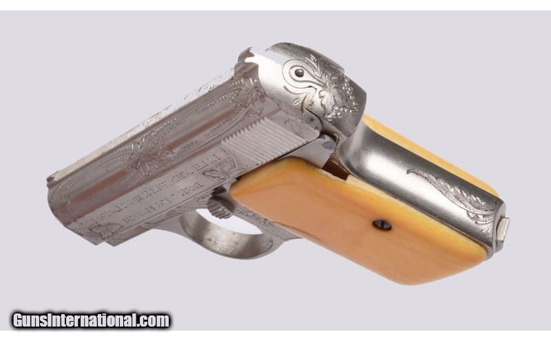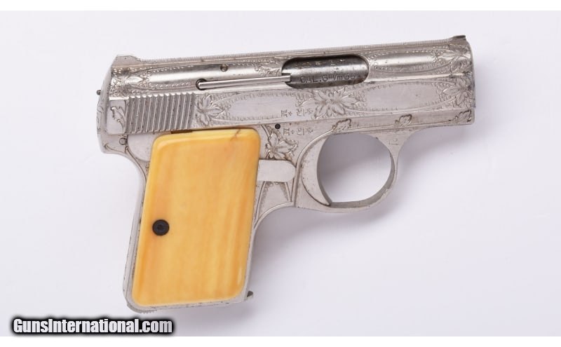 Description: Mid 50s production piece with custom foliate and border engraving, aged grips panels. Finish shows some flaking and spotting, appears to function with very good bore 6.35mm (.25ACP). SOLD Curio/Relic: Yes Metal Condition: Engraved Nickel Bore Condition: Very Good Barrels: 2 Inch Weight: 10 Ozs. Sights: Fixed Item Location: Buda, TX |