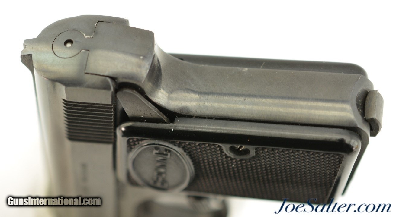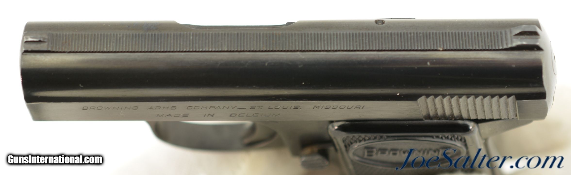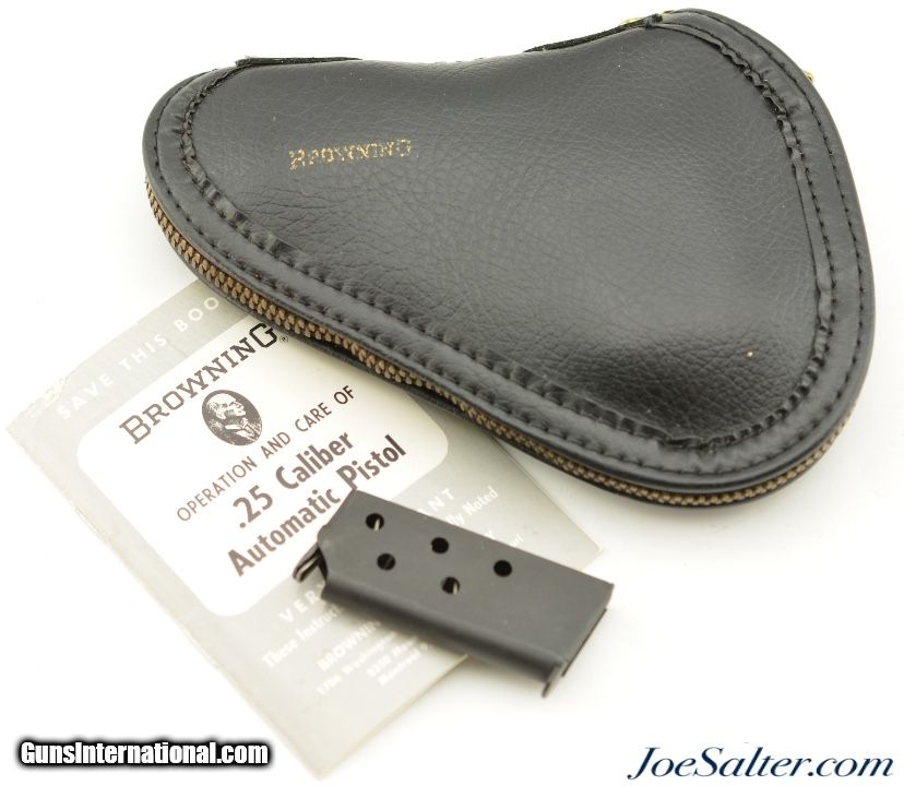 Description: Serial #139644, .25 ACP, 2 inch barrel with a bright, excellent bore. This is the "Baby" model semi-automatic pistol manufactured in Belgium by FN and imported under the Browning Arms Company name manufactured between 1954-58. In excellent plus condition the slide and frame show virtually all, 98-99% original blue finish with only faint handling and storage marks and slight wear on the leading high edges. It comes with two original 6 shot, FN marked magazines in an original leather Browning case and an original owners manual. An early, very high condition "Baby" Browning pocket pistol. FFL or C&R; Don't forget about Free 100% Guaranteed shipping & Insurance for orders over $500 and no CC fees. ; SOLD Curio/Relic: Yes |