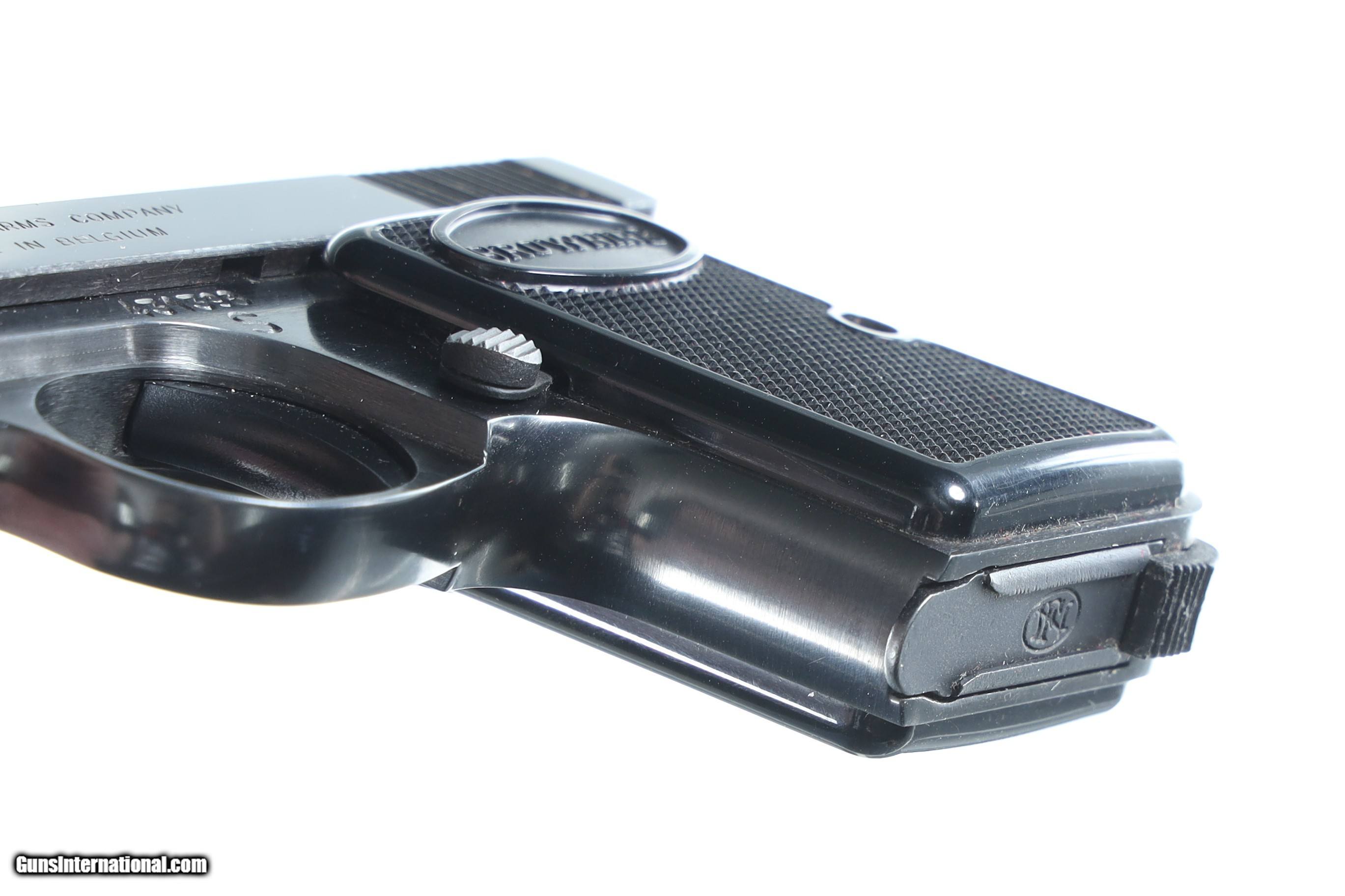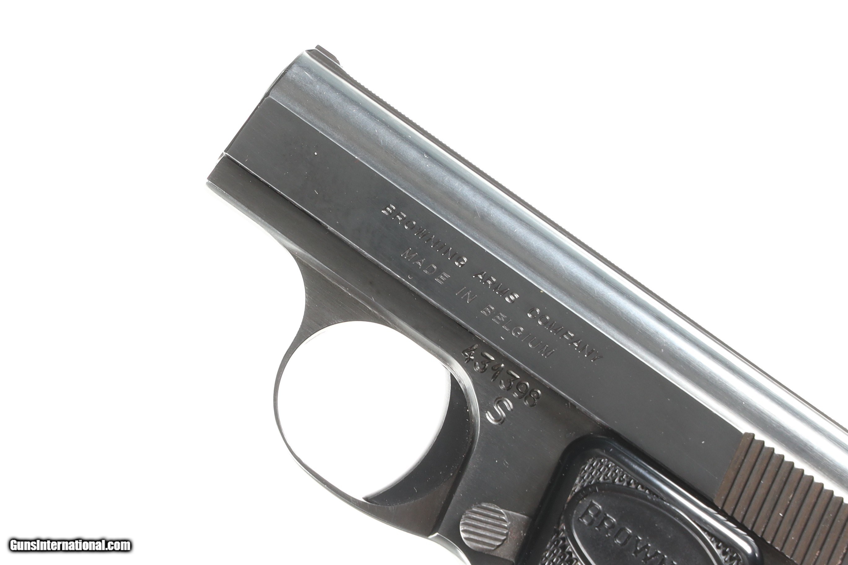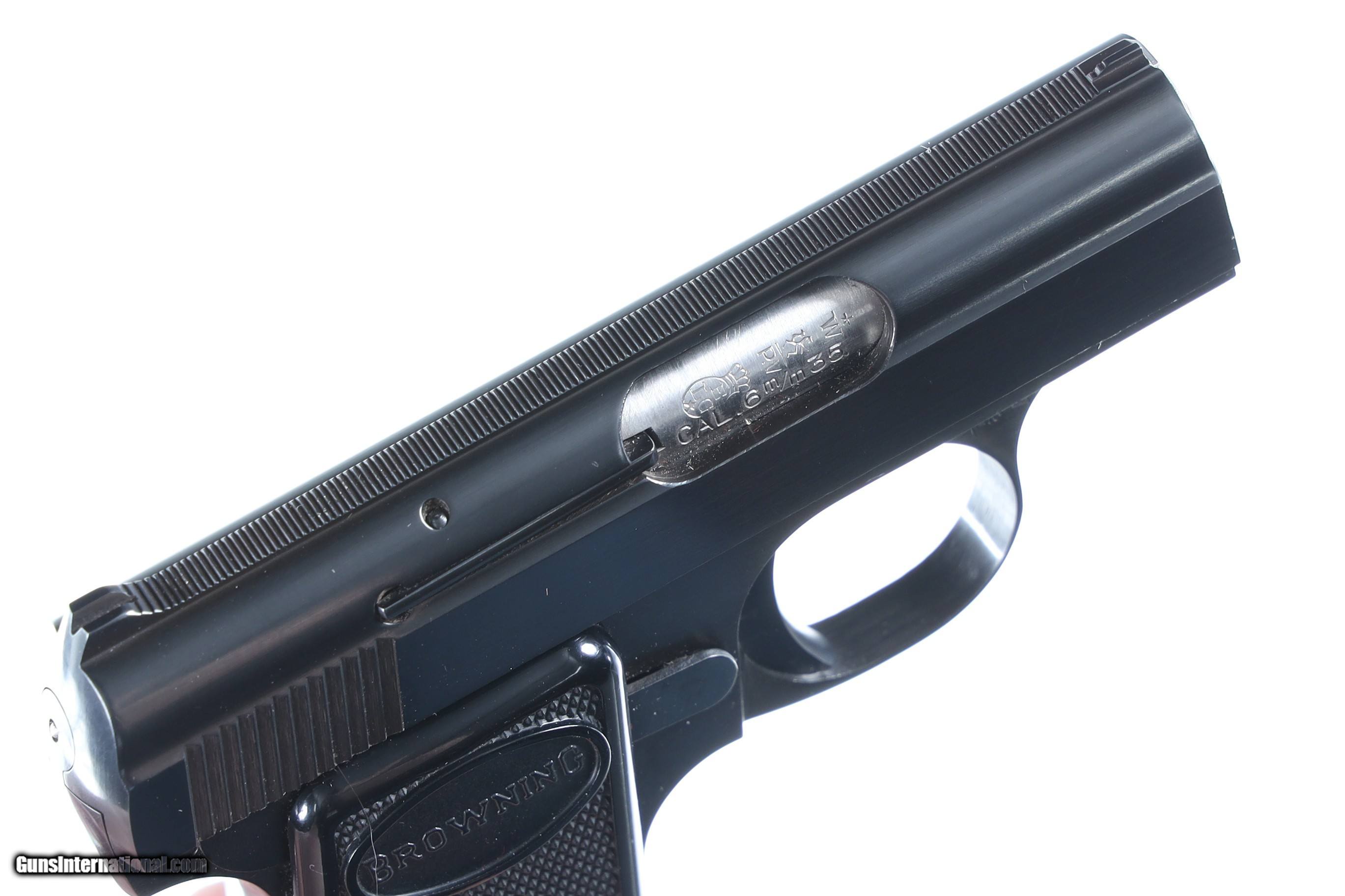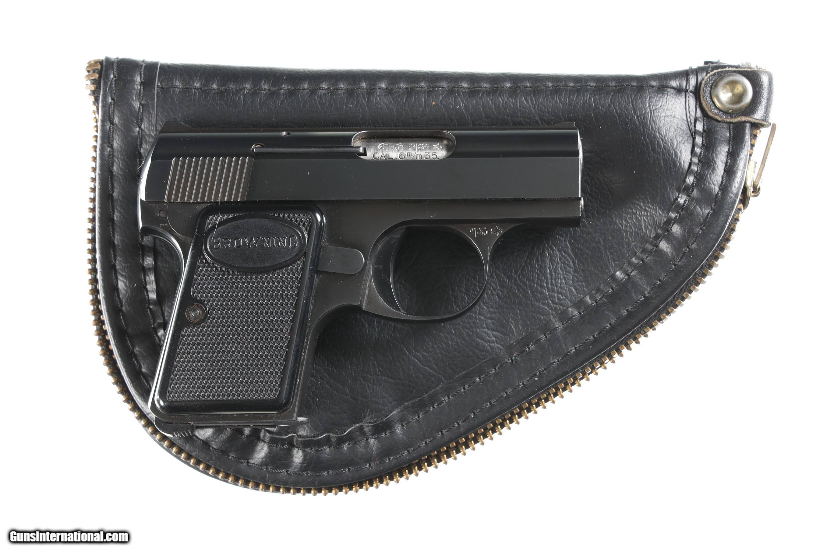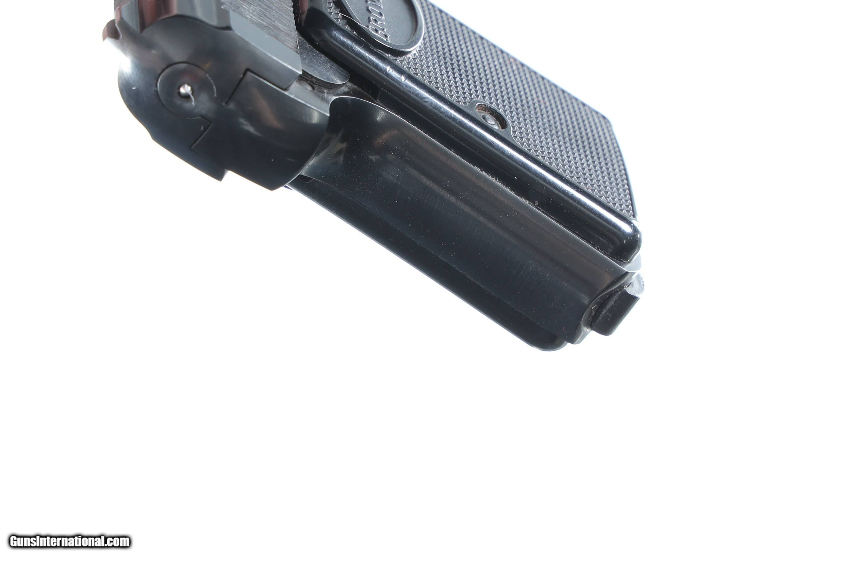 Description: Belgian produced Browning Baby .25 automatic pocket pistol. Blue finished with checkered Browning marked grips. Belgian proofs with Browning Arms marking on left side of frame. mfg, 1968 with 2" Bbl, Proper FN marked magazine and comes in correct Browning marked black zipper case. Condition, Excelllent plus with pistol retaining 99% of its blue finish with only losses from safety being operated trigger plate operation. Bore is brilliant bright. Grips are perfect and zipper case is excellent. mechanically excellent. C&R • Free Shipping, No Credit Card Fees. • Lay-a-way available for this firearm. • 1/3 Down, a 1/3 in 30 Days, 1/3 in 60 Days. SOLD Curio/Relic: Yes Handgun Caliber: .25 ACP (6.35mm Browning, 6.35×16mmSR) Manufacturer: Browning Model: Baby Serial Number: 431398 Barrel Length: 2 |