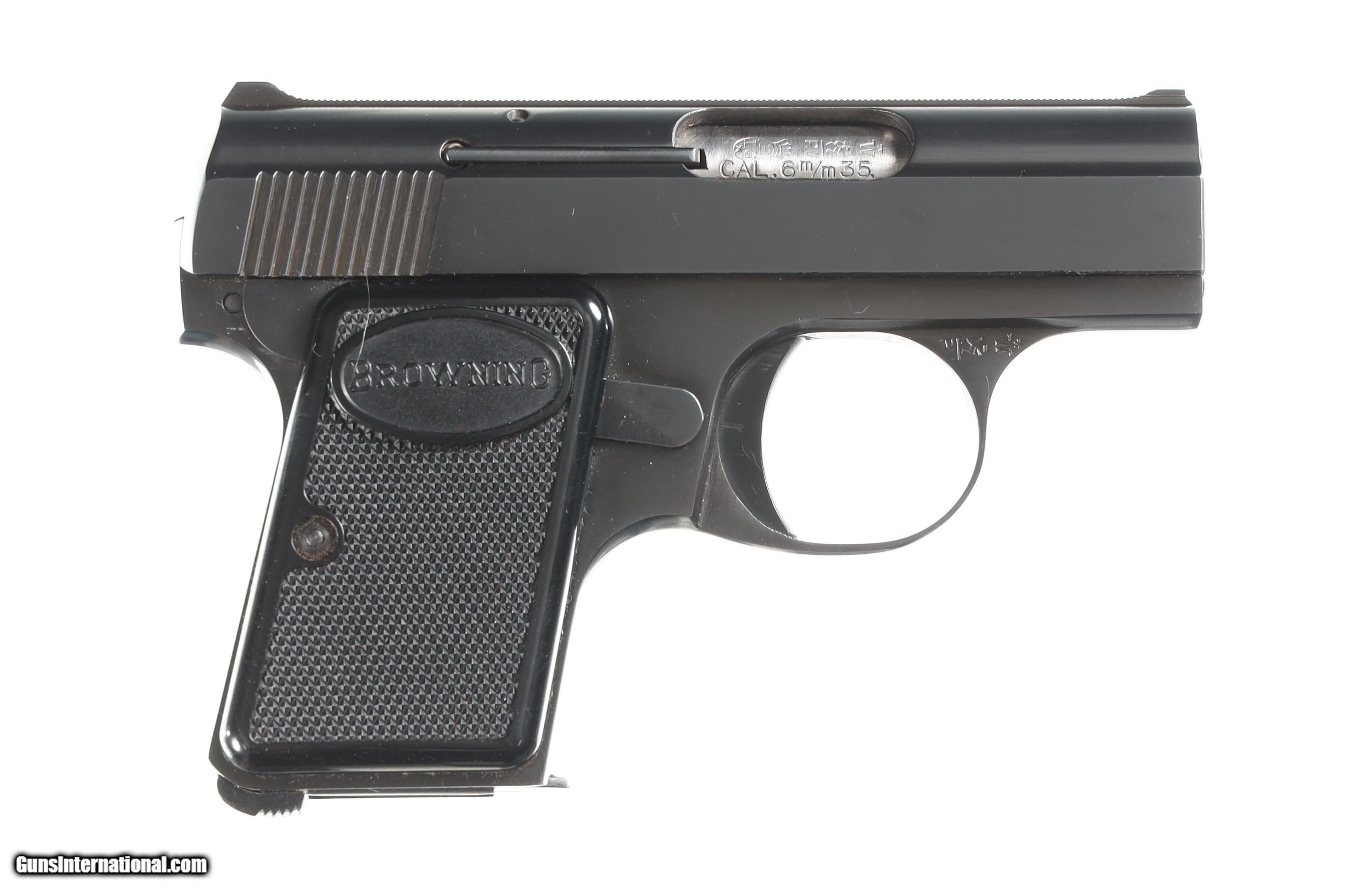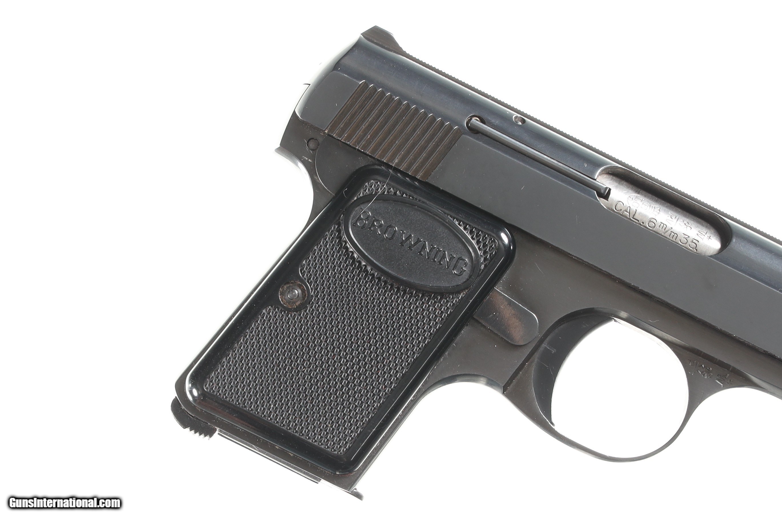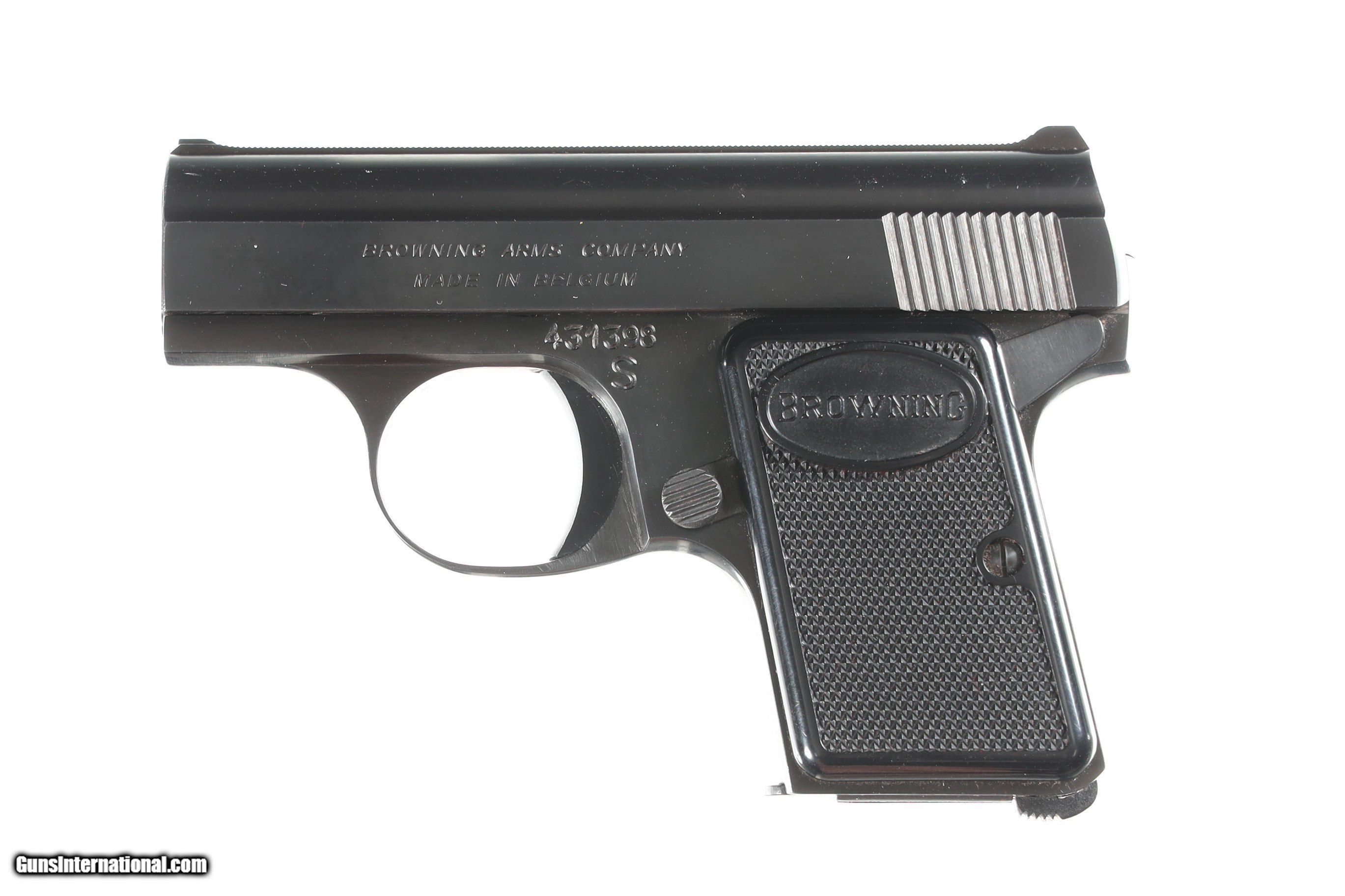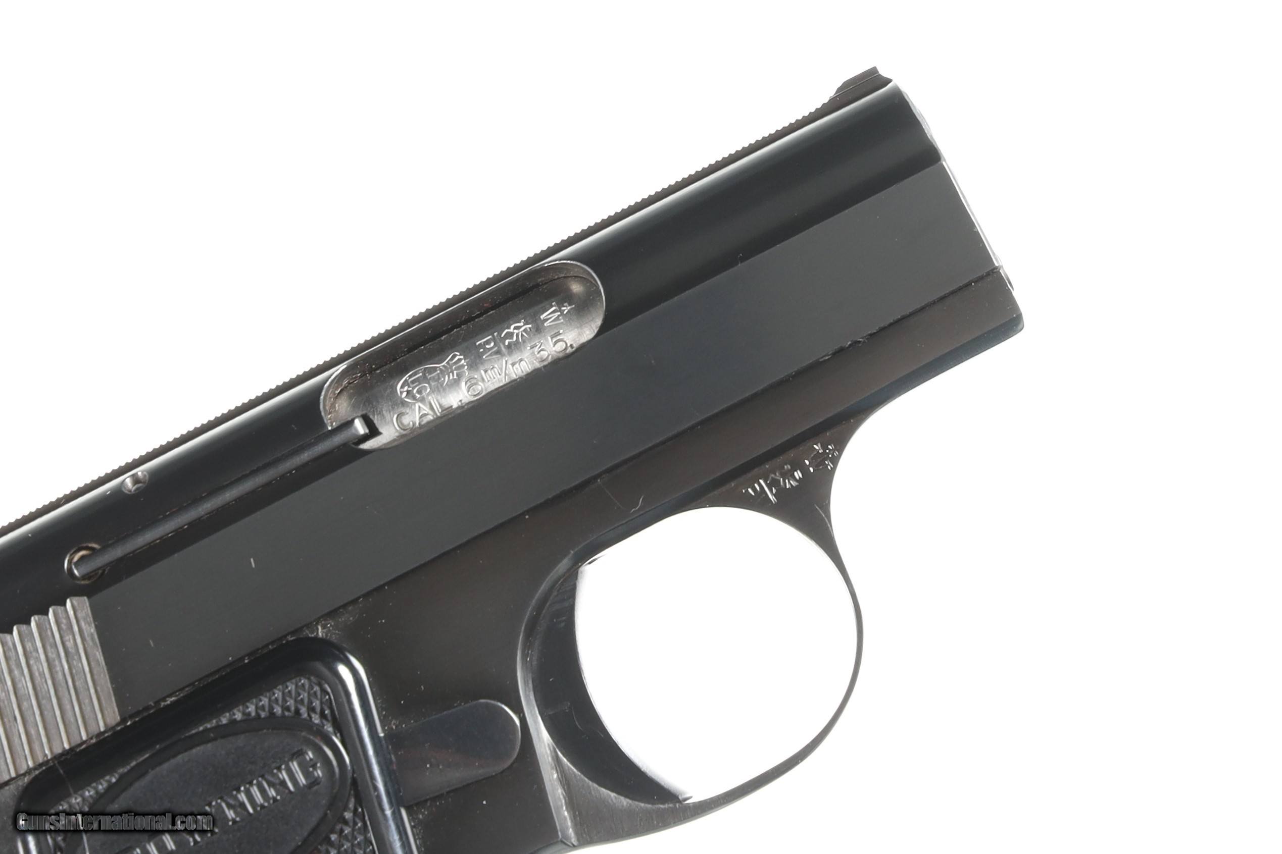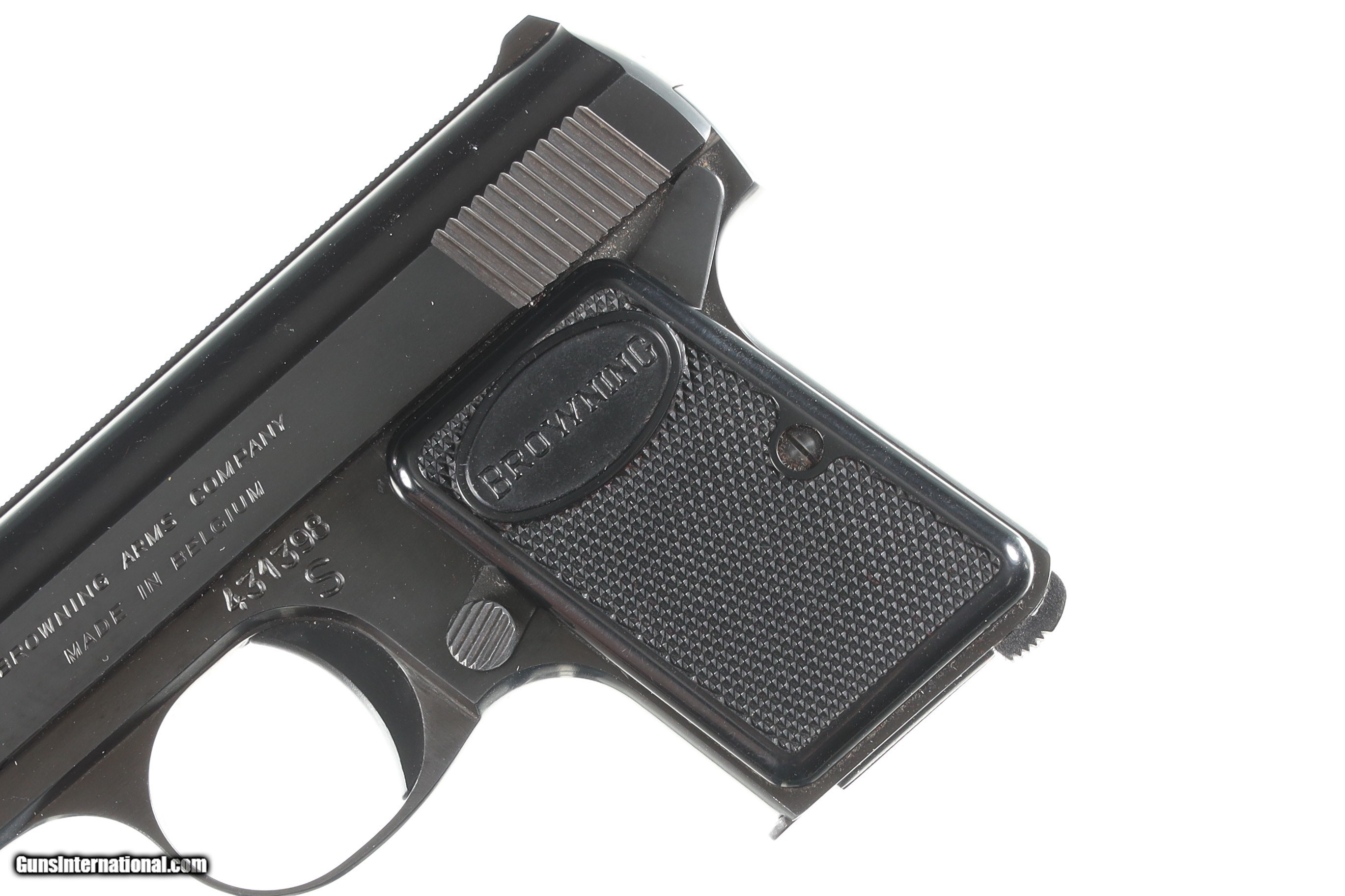 Description: Belgian produced Browning Baby .25 automatic pocket pistol. Blue finished with checkered Browning marked grips. Belgian proofs with Browning Arms marking on left side of frame. mfg, 1968 with 2" Bbl, Proper FN marked magazine and comes in correct Browning marked black zipper case. Condition, Excelllent plus with pistol retaining 99% of its blue finish with only losses from safety being operated trigger plate operation. Bore is brilliant bright. Grips are perfect and zipper case is excellent. mechanically excellent. C&R • Free Shipping, No Credit Card Fees. • Lay-a-way available for this firearm. • 1/3 Down, a 1/3 in 30 Days, 1/3 in 60 Days. SOLD Curio/Relic: Yes Handgun Caliber: .25 ACP (6.35mm Browning, 6.35×16mmSR) Manufacturer: Browning Model: Baby Serial Number: 431398 Barrel Length: 2 |