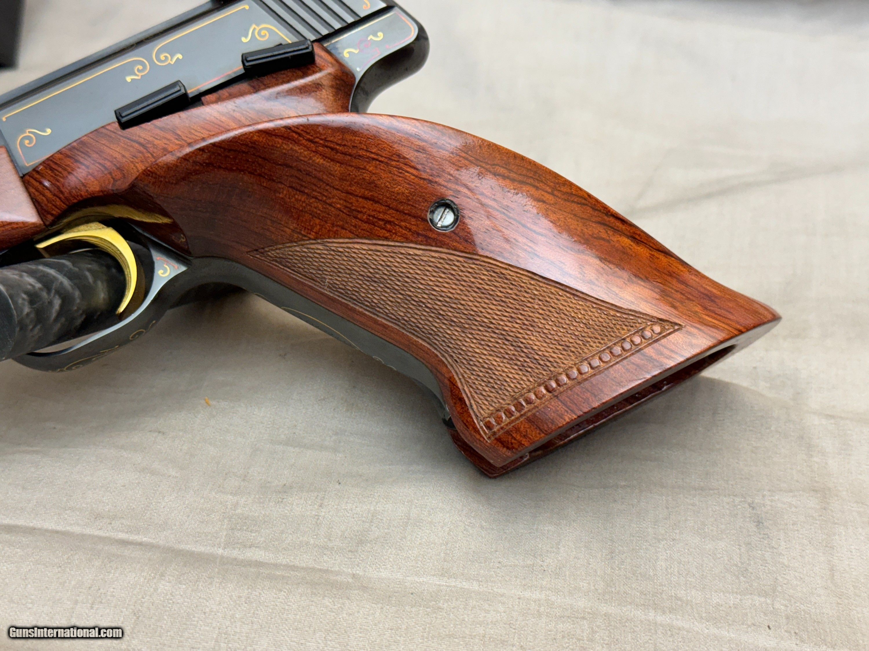 Description: Up for sale is a very nice and fairly scarce Gold Line Belgium Browning Medalist Target Pistol. These pistols were the highest production grade available for the .22 Pistols until the early 1970s and very few were produced. They feature very tasteful flush gold inlays throughout the barrel, slide, and frame, as well as a special carved border checkered grip. Another feature of this specific example is the "dish" sight which was only available in 1962 and part of 1963. These are not easy to come by and this is a fairly nice example! This specific example is in excellent condition. There are a few very faint marks in the metal and one notable ding in the rear palm area of the grip. I would consider it to be in the 97-98% range for condition, the case and tools are also excellent without any egregious flaws! Vintage firearms are a passion of mine. I am more than happy to provide any insight or info that I can regarding vintage Brownings or any other collectible firearms. Do not hesitate to call/text me at 402-314-2729 even if it is not about the gun I have for sale! Love talking with people who have an appreciation for them, sharing my knowledge, and learning more when I can. Lots of dishonest sellers out there, be careful when collecting or investing. I provide a 5 day inspection period to ensure you are happy with everything and that I was accurate in my description and photographs. I hope to find good homes where these collectible pieces will be appreciated and enjoyed. Shipping is a flat $100 to lower 48 (PRIORITY MAIL, INSURED FOR THE VALUE OF THE GUN). It will be well packaged and cared for. Licensed dealer in the state of Nebraska SOLD Curio/Relic: Yes Handgun Caliber: .22 Long Rifle Manufacturer: Browning Model: Medalist |