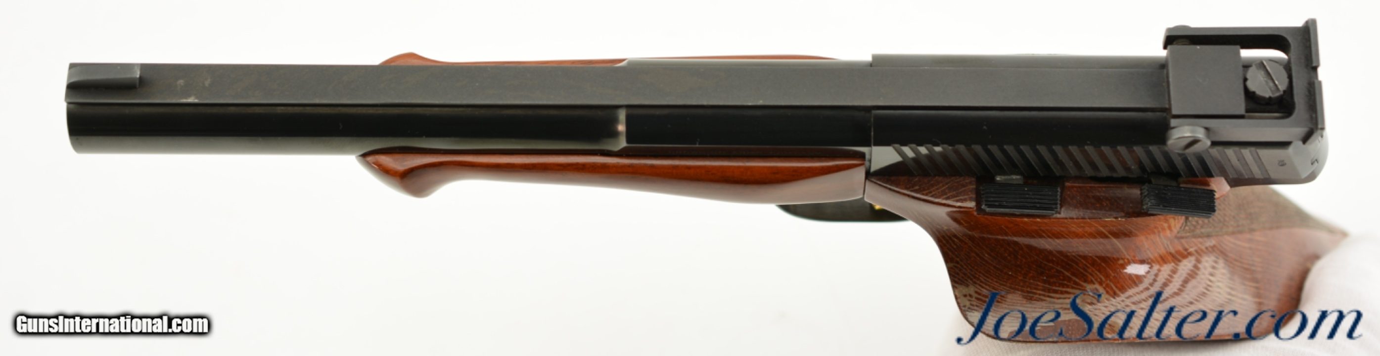 Description: Serial #39703T71, .22 LR, 6 ¾ inch vent rib barrel with a bright, excellent bore. This is a Belgian made Browning Medallist semi-automatic pistol manufactured in 1971. In excellent condition the barrel and frame retains 96-98% of the original blue finish with very minor use and handling marks. The rosewood target grips with right hand thumbrest is solid with surface marks, small contusions and crazing in the high gloss varnish. The separate forearm piece remains in excellent condition. It comes with one original 10 round magazine. FFL or C&R SOLD Curio/Relic: Yes |