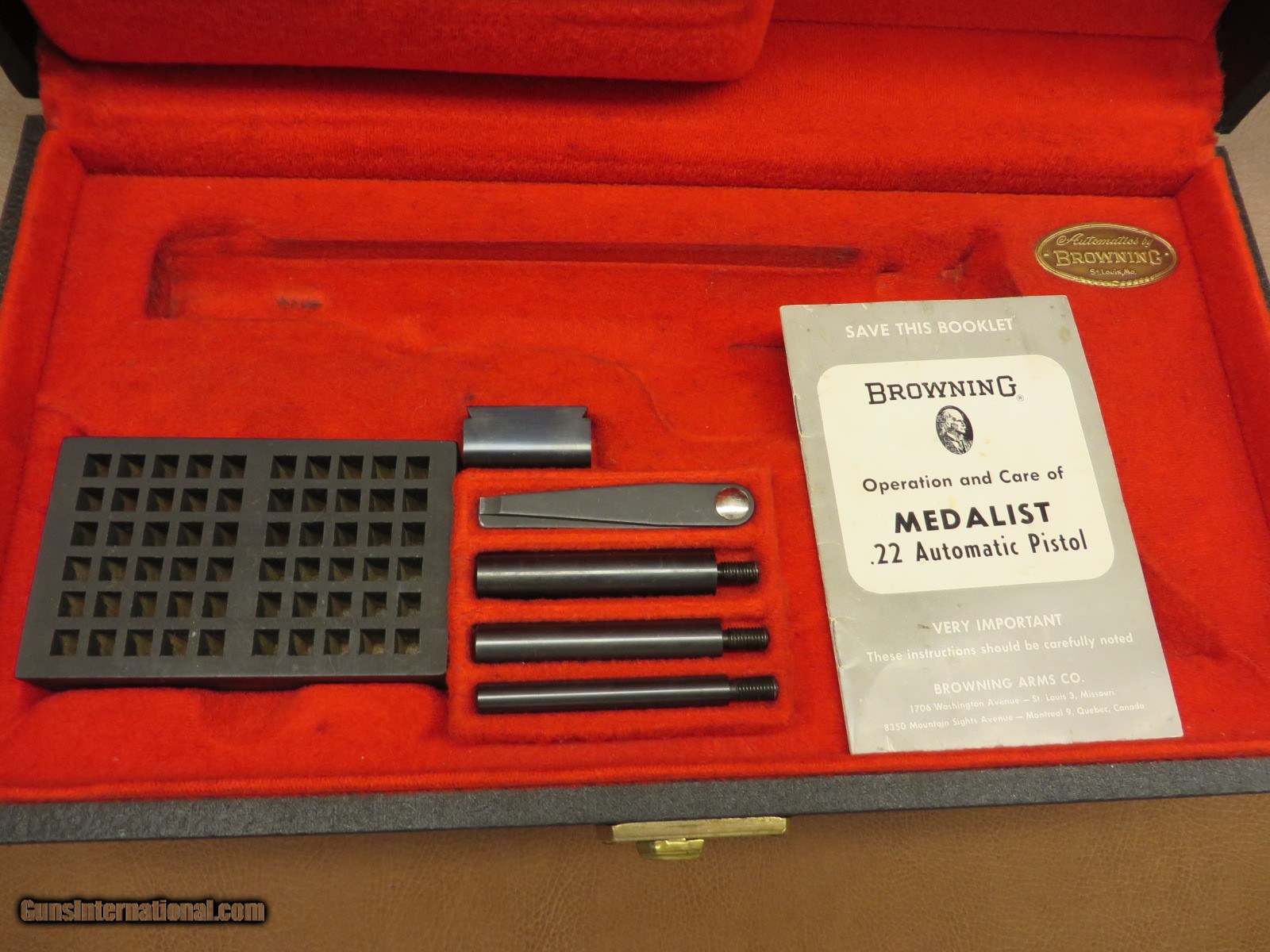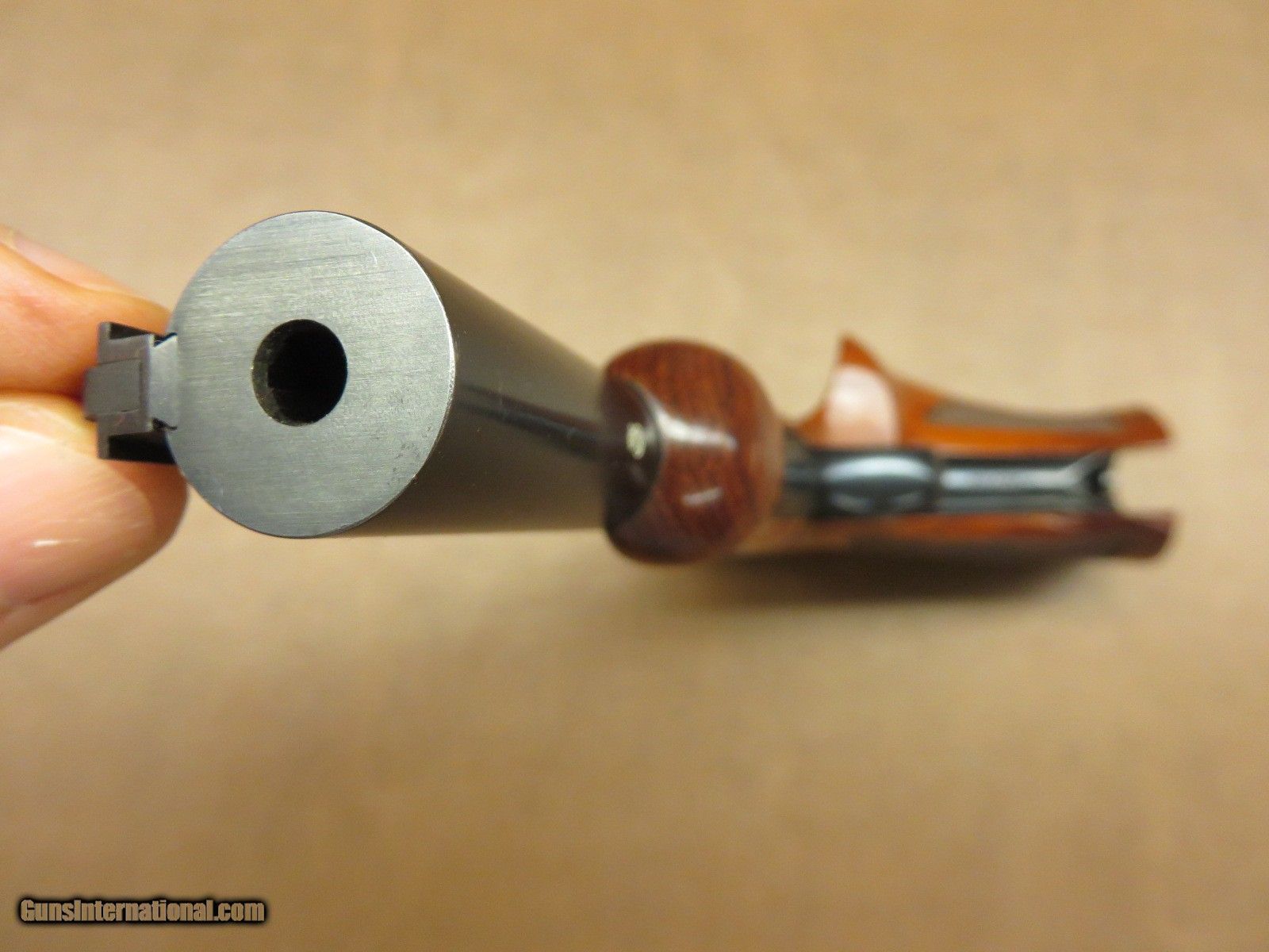 Description: .22 Long Rifle target pistol has 6 3/4 inch heavy vent rib barrel with adjustable sights. High gloss checkered walnut schnabel forend and thumbrest grips. Gold trigger. T3 date code from 1963. One factory magazine. All in 98-99% condition in original presentation case with papers, weights, tools, and ammo tray. SOLD |