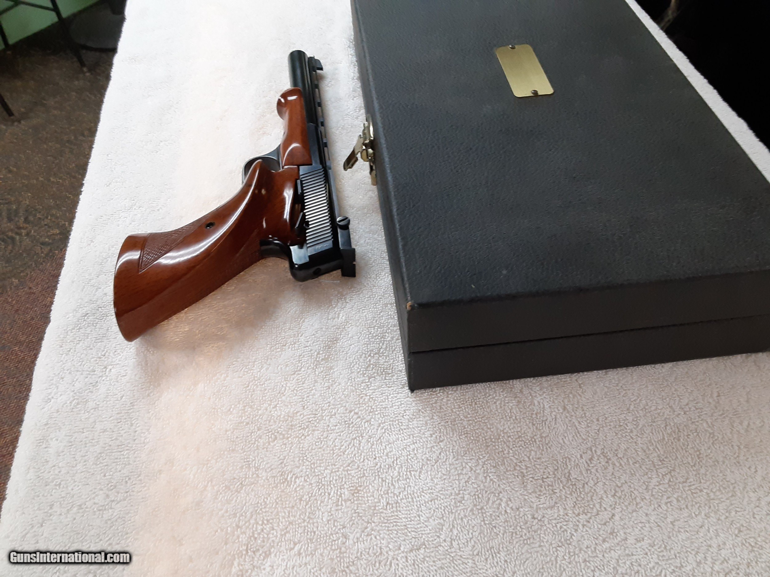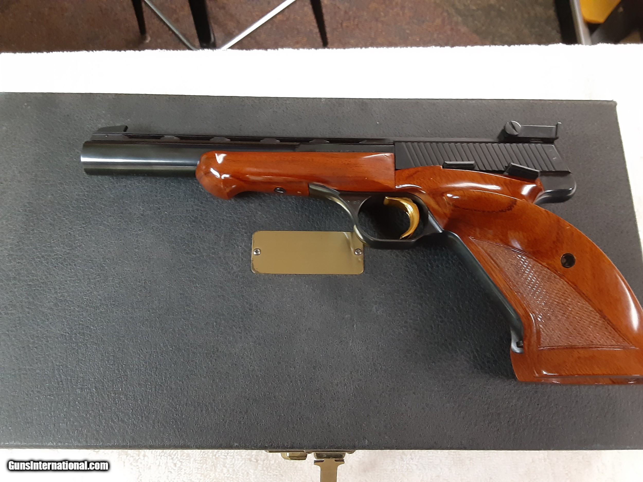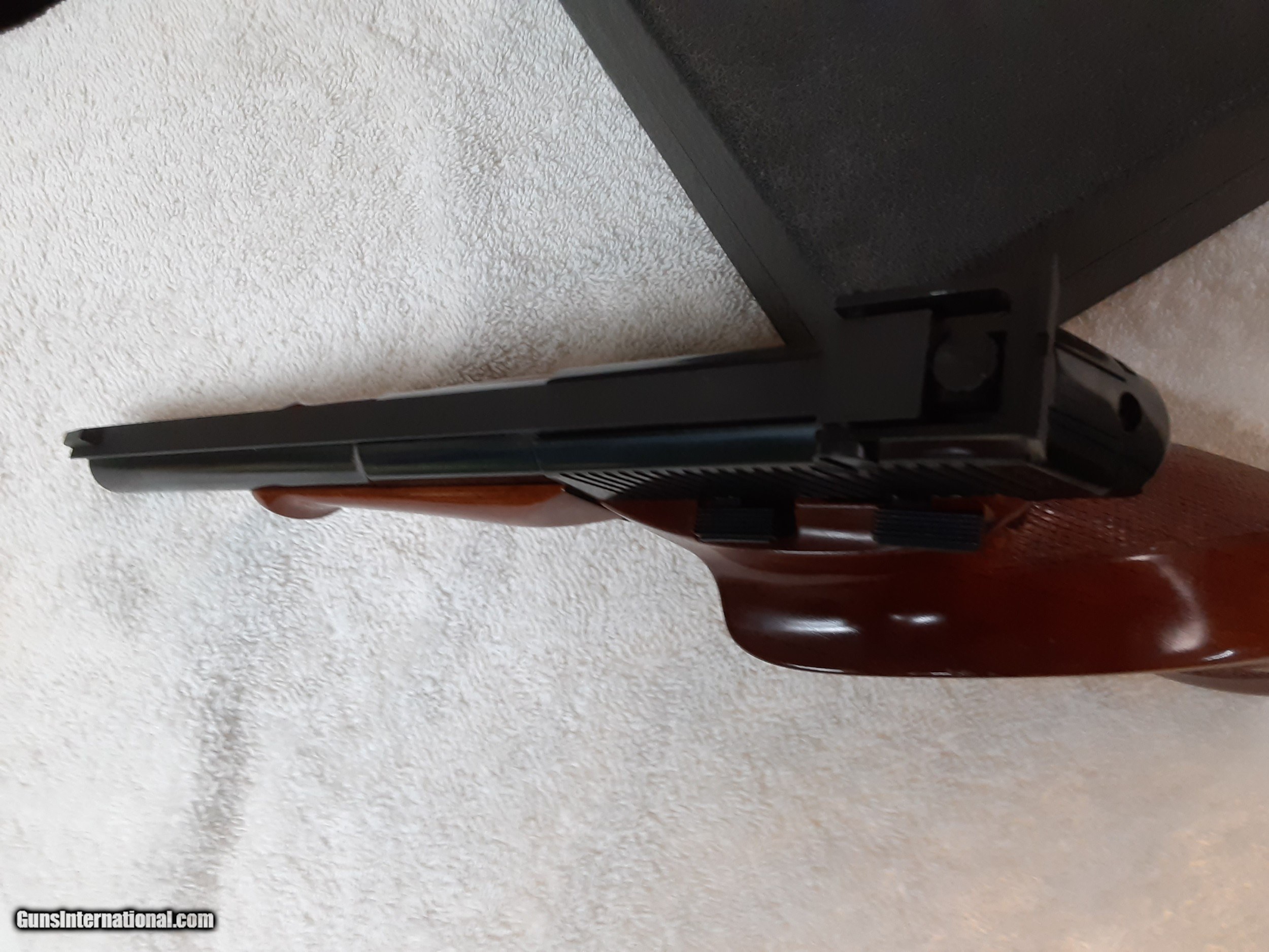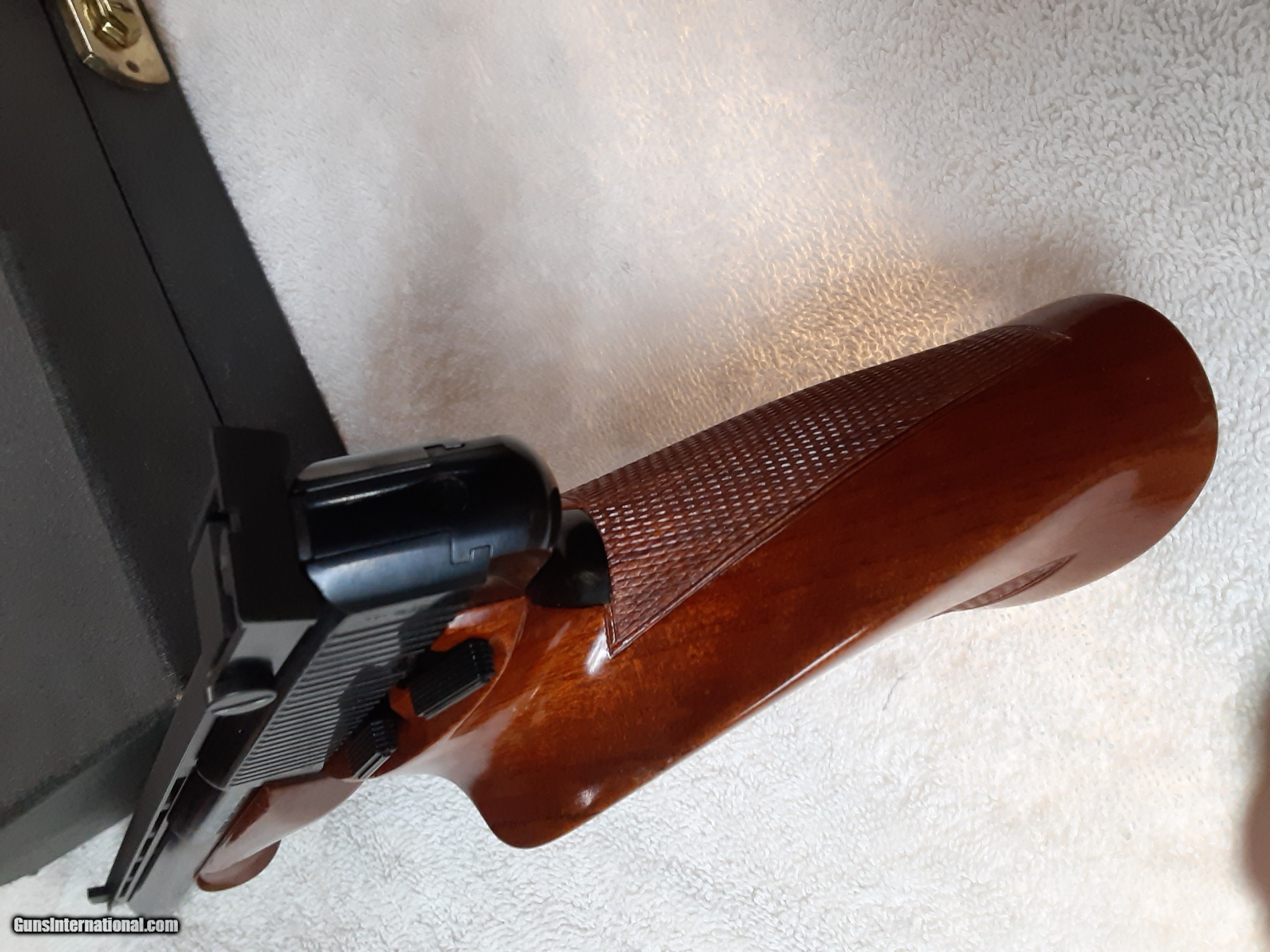Description: Browning medalist competition pistol, excellent condition, complete kit. All the bits are here, including the round holder, manual, weights and the keys in the original envelope.Adjustable sight. I havent seen a more complete original kit for sale anywhere. 1375.00, 50.00 shipping. SOLD Handgun Caliber: .22 Long Rifle Manufacturer: browning Model: medalist Serial Number: 103826T8 Barrel Length: 6.75 inch Bore: excellent Condition: excellent Metal Condition: excellent Wood Condition: excellent Bore Condition: excellent Action: automatic Stock: wood Finish: blued Sights: adjustable Case: original |