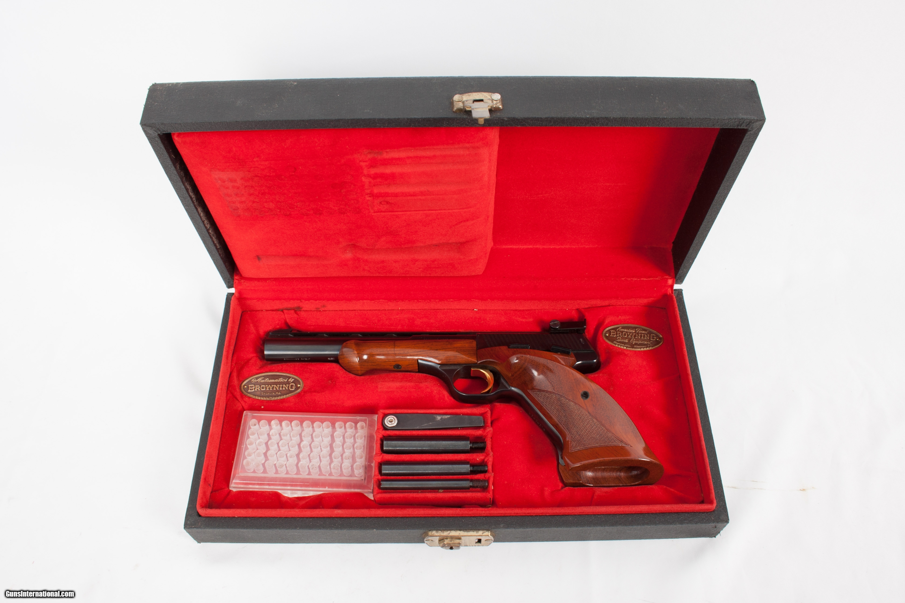 BROWNING MEDALIST CHAMBERED IN 22LR WITH A 6.75 INCH BARREL COMES WITH DISPLAY CASE 3 BARREL WEIGHTS AND TOOL AND ACETATE MUNITIONS HOLDER. THIS GUN IS IN EXCELLENT CONDITION AND IS COVERED BY DURY'S LIFETIME WARRANTY.
