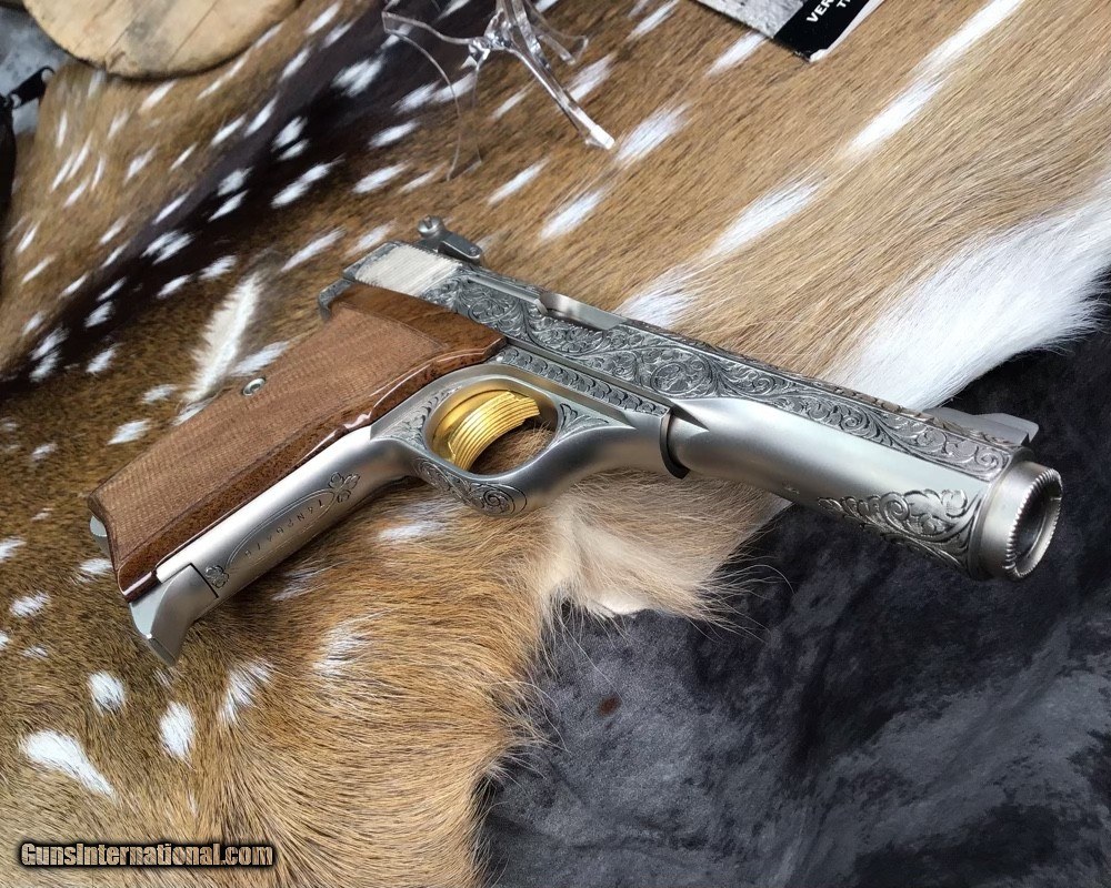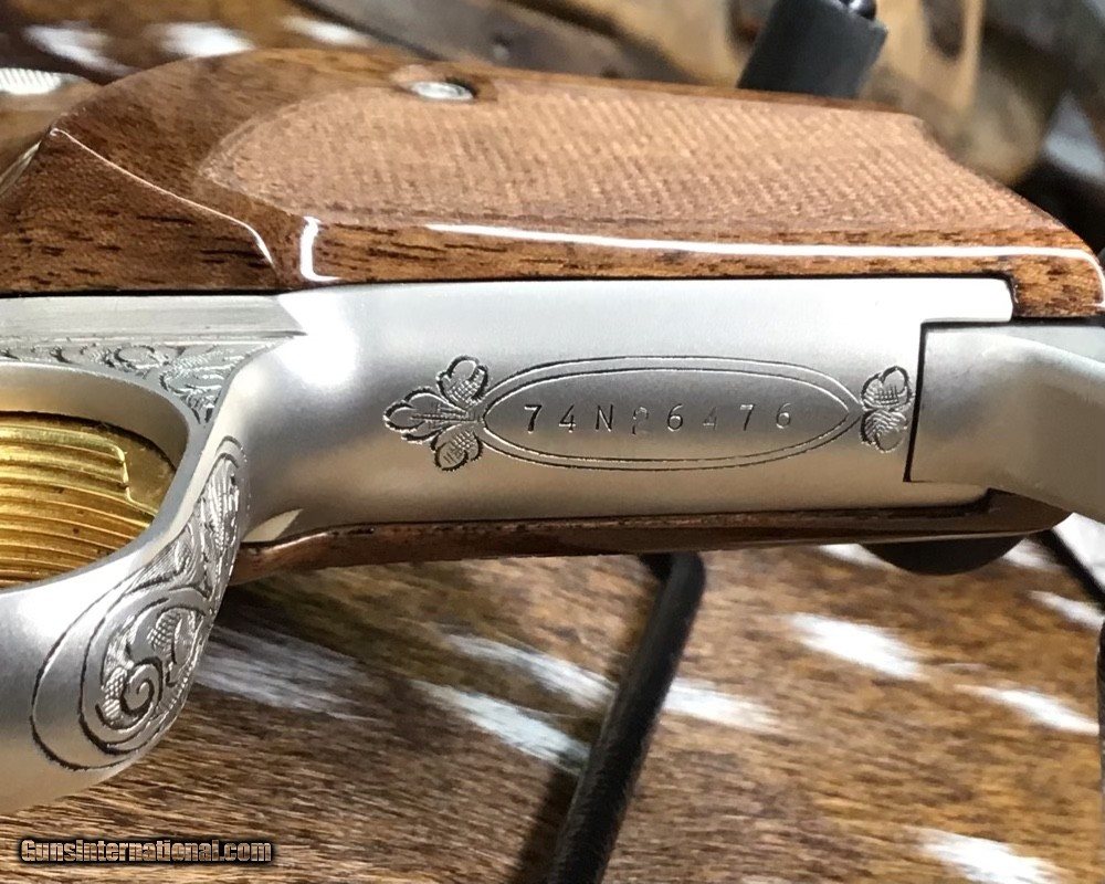Description: Browning Renaissance factory engraved 1910/22 Auto pistol chambered in .380 acp. Excellent condition with one magazine in factory pouch and manual . Exquisite hand engraving from Belgium factory wearing high gloss checkered grips and Gold trigger. This model 1910/22 is a very low production Renaissance engraved model and hard to find. Gun appears to be unfired since factory. A beautiful addition to your Browning collection. Add 3% if paying with credit card. Free shipping for US veterans and retired LEO. God Bless America from a proud American, and a Viet Nam Vet , thankful for our freedoms.. paid for by the Blood ,Sweat and Tears of our brave men and women in uniform. Ten Below Firearms is a Veteran owned and operated business. We specialize in out of production models of high quality firearms. We love to ship! We ship to all states where legal, just give us a call! Handguns normally ship for $35 and Long guns for $45 up to $75 for extra length long guns. That's 2-3 day USPS Priority shipping, Delivery conformation and with tracking number. Optional Postal insurance is additional $1.70 per $100 and highly recommended. We are OPEN BY APPOINTMENT ONLY FOR IN PERSON VISITS, We trade, sometimes. Layaway:If needed we offer a 60 day layaway program. Terms, 1/3 of purchase price down, 1/3 due in 30 days, and the final third to include card fees and shipping due at 60 days. Funds are non transferable and non refundable .Layaway is not available on negotiated prices. SOLD Handgun Caliber: .380 ACP (9x17mm Browning Short) Manufacturer: Belgium Browning Model: 1910/22 Serial Number: 74N26476 Barrel Length: 4.4 inch Condition: Excellent Metal Condition: Excellent Wood Condition: Excellent Bore Condition: Excellent Action: Semi auto Triggers: Gold Finish: Coin Sights: Adjustable Manufacture Date: 1974 Engraving: Renaissance Extras: Manual Case: Browning Pouch Item Location: MN |