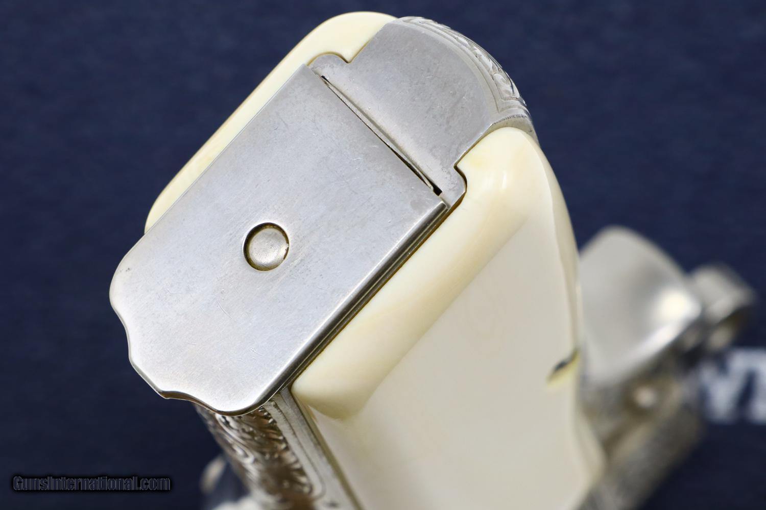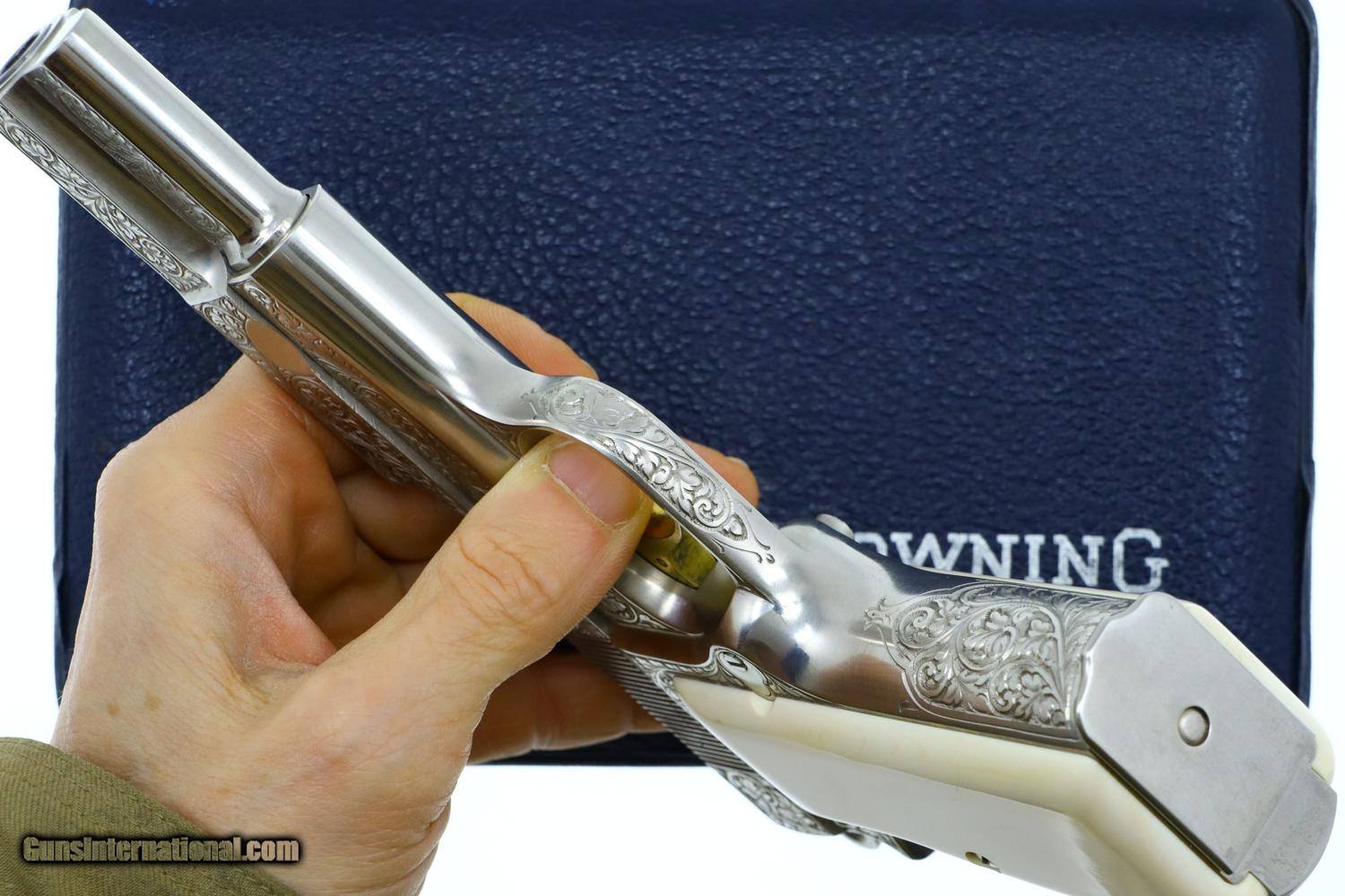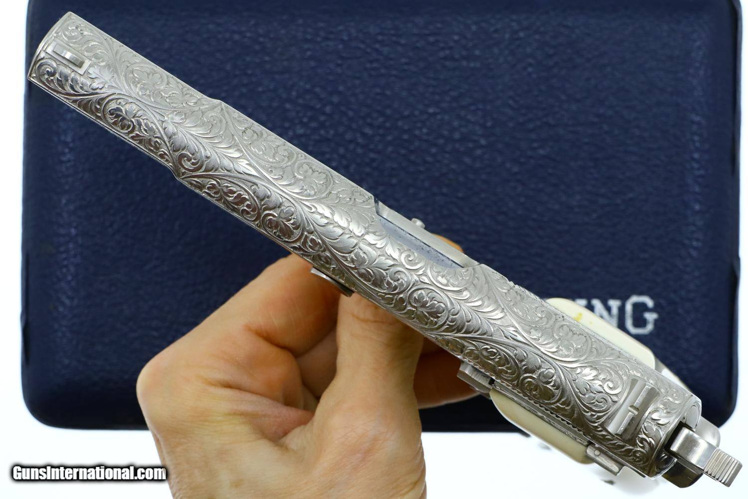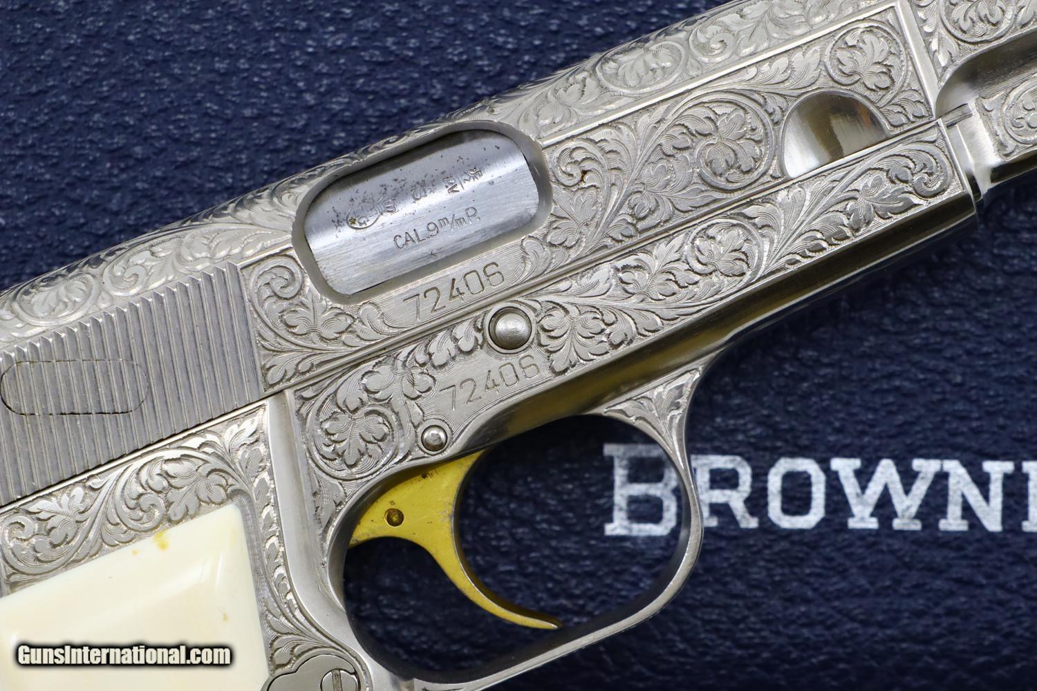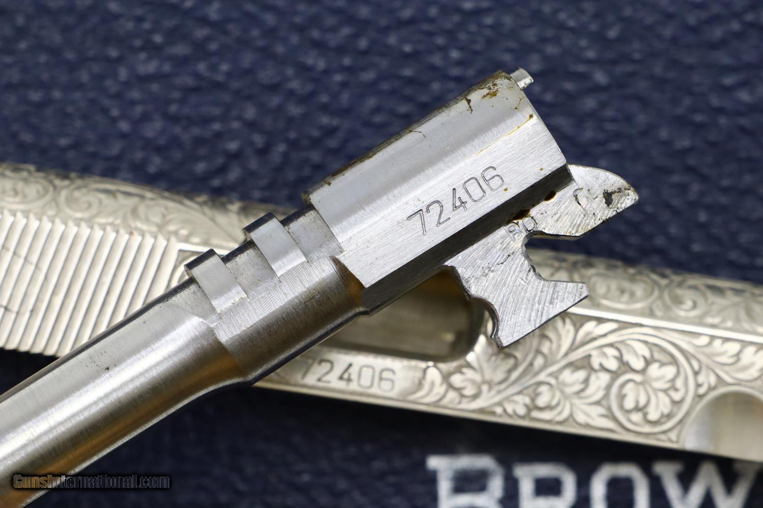 Description: Earliest configuration of the Browning Renaissance High Power in 9mmP with the coin finish, thumb print slide, and internal extractor. Usual two line BAC/St Louis address on left side of slide with caliber on exposed barrel hood. Standard Belgian proofs. Fully matching barrel, slide, and frame. Extensive Renaissance style engraving over most surfaces with gold plated trigger, replacement faux ivory grips (early Pearlite grips were prone to shrinkage and discoloration) and correct coin finished magazine. Complete with early blue, leather bound, Browning case, lid lined in silk, base in velvet. Synopsis: Spectacular Browning, FN, Renaissance High Power, Early, Coin Finish, Factory Cased. An absolutely fantastic Renaissance HP, factory cased, from about 70 years ago! Condition: Excellent+ original bright coin finish with trace flaking of gold plate on trigger. Comparable condition grips and magazine. Mirror bore. Perfect manual mechanics. Excellent case, lid and base with depressions from pistol, but negligible staining and no discernible tears. An absolutely fantastic Renaissance HP, factory cased, from about 70 years ago! ~~Insured shipping fee of $155; most packages shipped using FedEx 2nd Day.~~ SOLD Manufacturer: Browning Serial Number: 72406 Caliber Info: 9mmP |