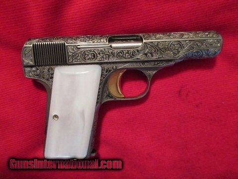Description: Belguim Browning Original 3 gun set Custom upgraded to Renaissance by former Browning Master Engraver Ron Reimer in his characteristic deep relief engraving . Set sold in 1967 . .25 Baby Browning , .380 , and 9MM High Power . SOLD |