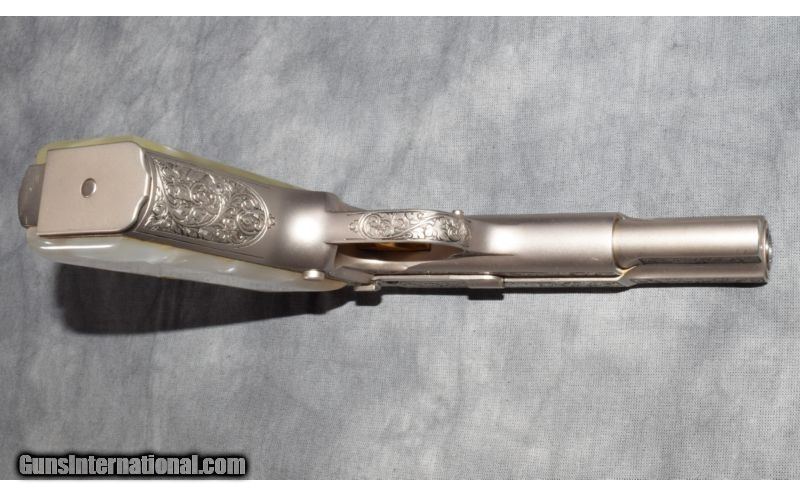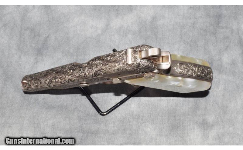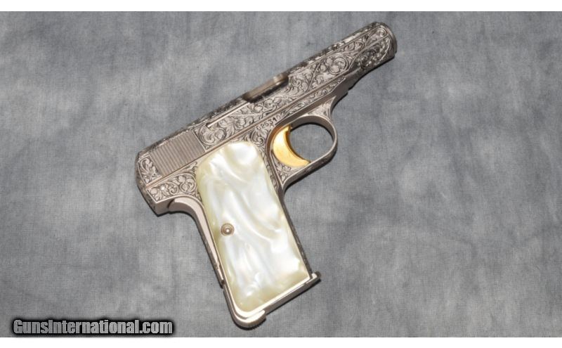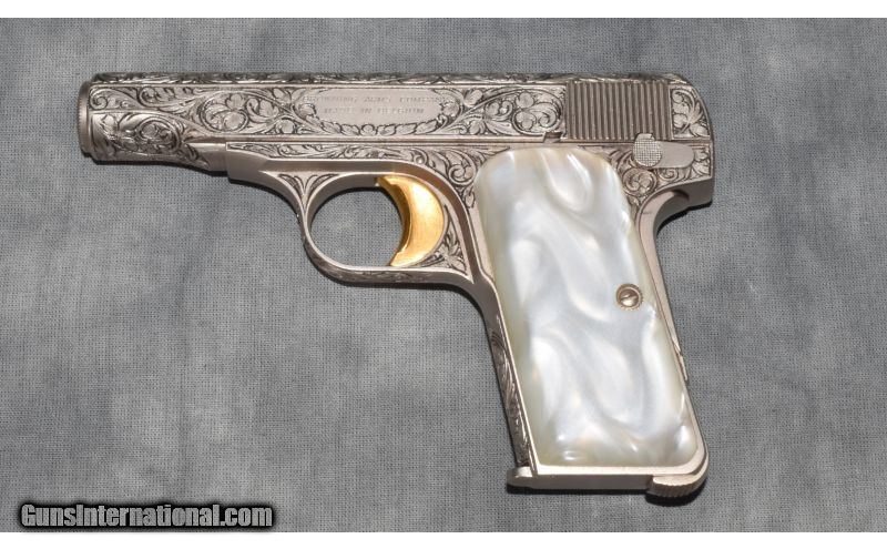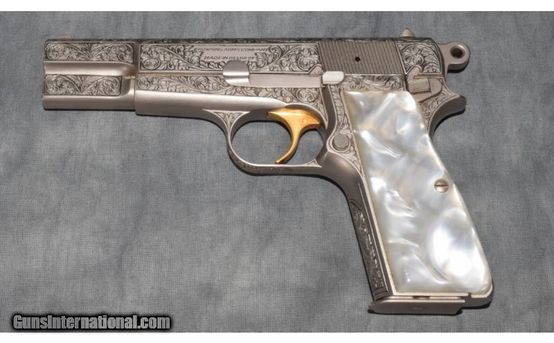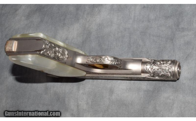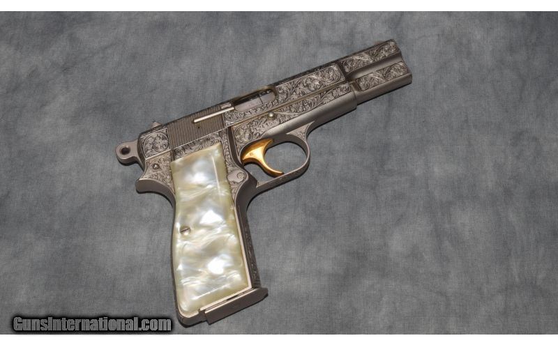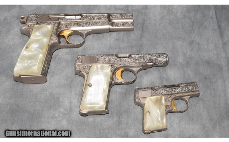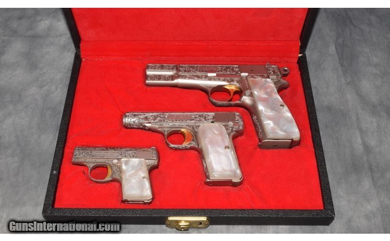 Description: Browning Renaissance 3 Pistol Set Made in Belgium. The set is made up of a 9mm Hi-Power, a Model 1955 380ACP, and a Baby Browning 25ACP. The pistols are in Excellent condition with a clean bore and sharp rifling. The pistols in this set are finished in the early coin finish, and each features 95% coverage in fine floral and scroll engraving with gold washed triggers, smooth synthetic pearl grips, standard marking, and Belgian Proofs. With a fitted black leatherette case holding all three pistols. These sets are very rare and desirable, and would be the centerpiece of any Browning collection.Sold only as the 3 gun set, will not brake up the set. SOLD Manufacturer: 1968 Caliber Info: 9mm, 380 Auto, 25 Auto Metal Condition: Excellent - very minor handling Bore Condition: Excellent - bright with deep rifiling Barrels: 4.5" , 3.5" , 2.5 Triggers: Single Action Only Stock Dimensions: 7.5", 6", 4 Sights: All three have Fixed Iron Extras: Factory Display case Item Location: Chesterfield, MI |