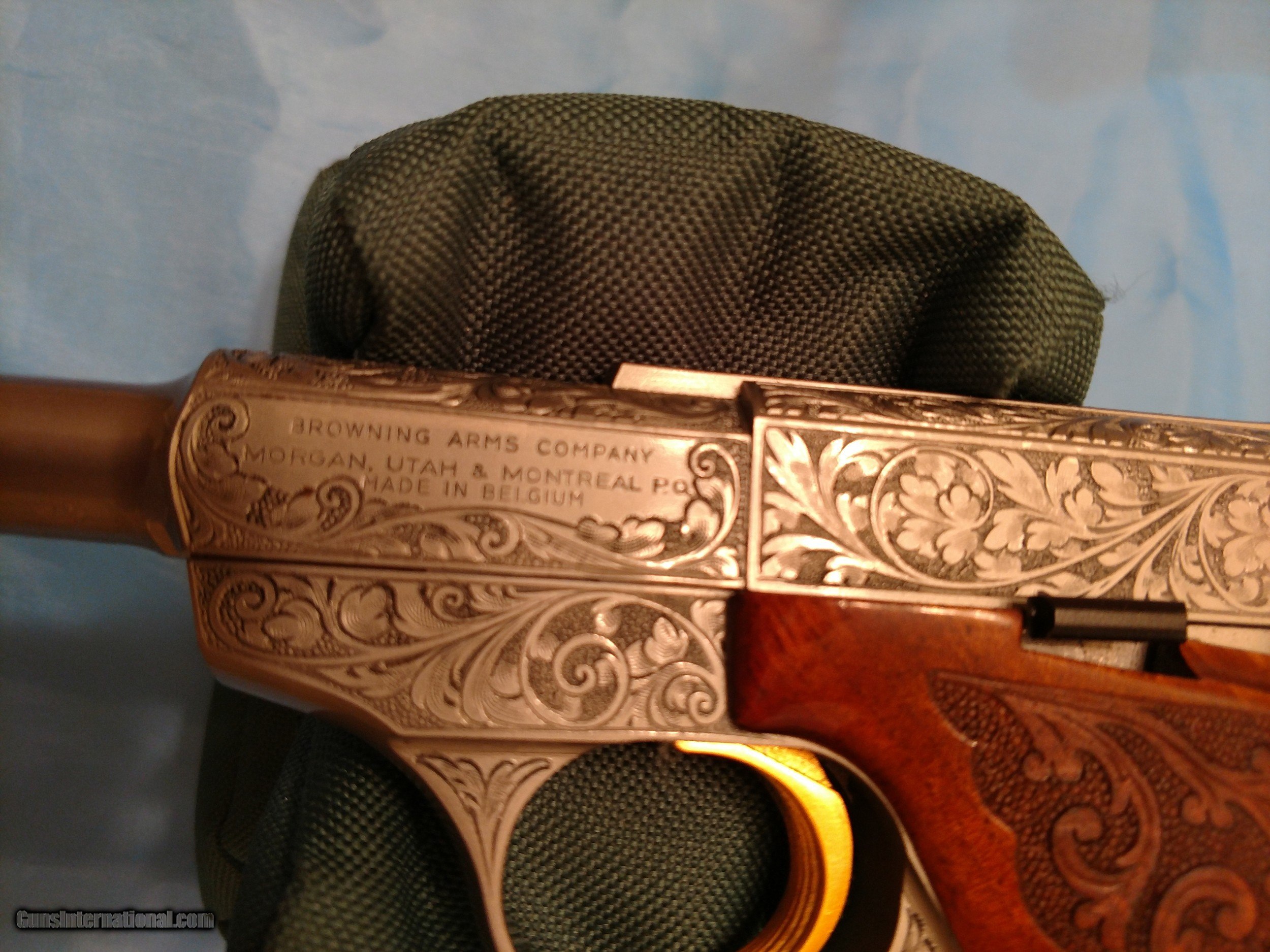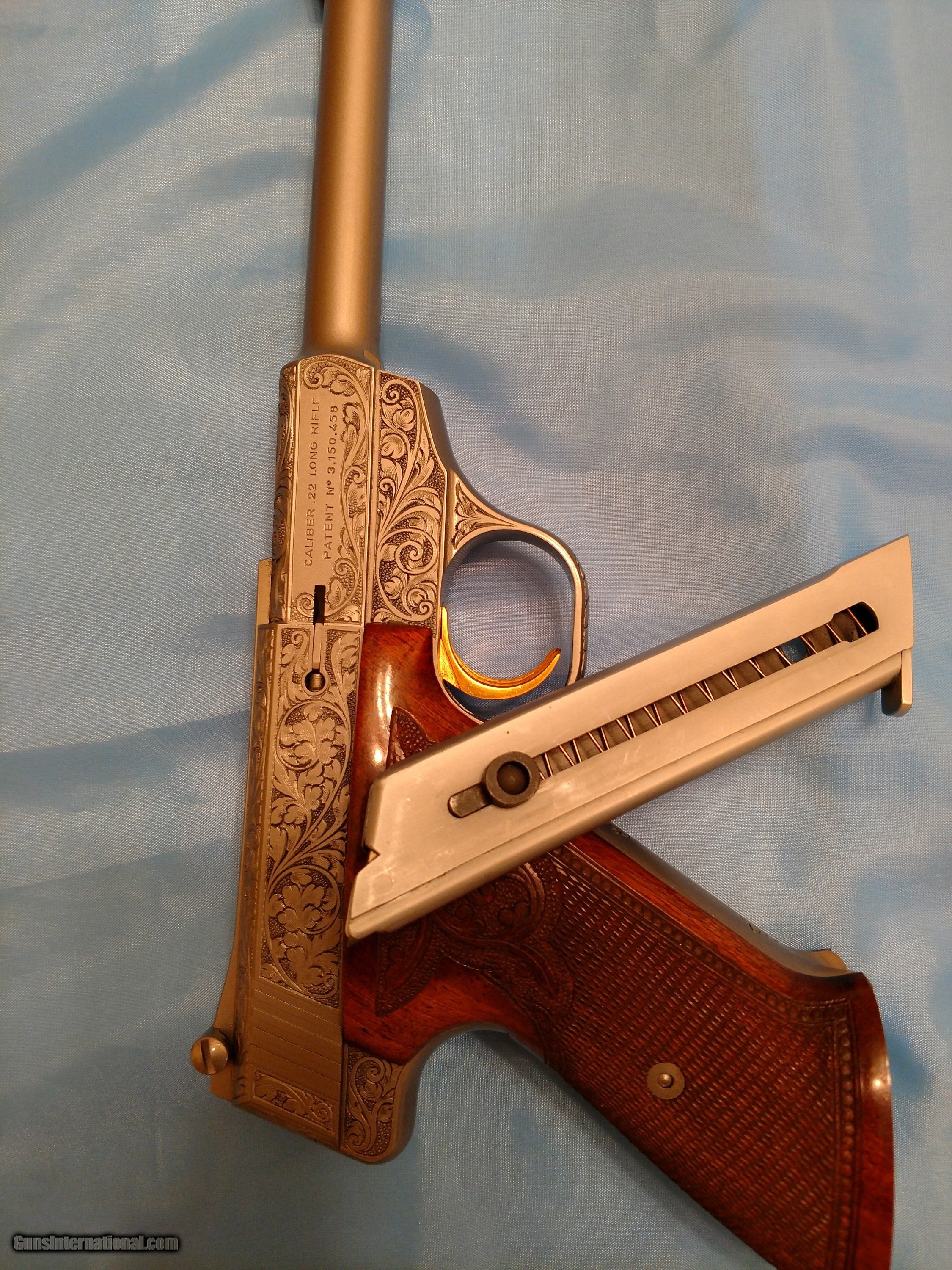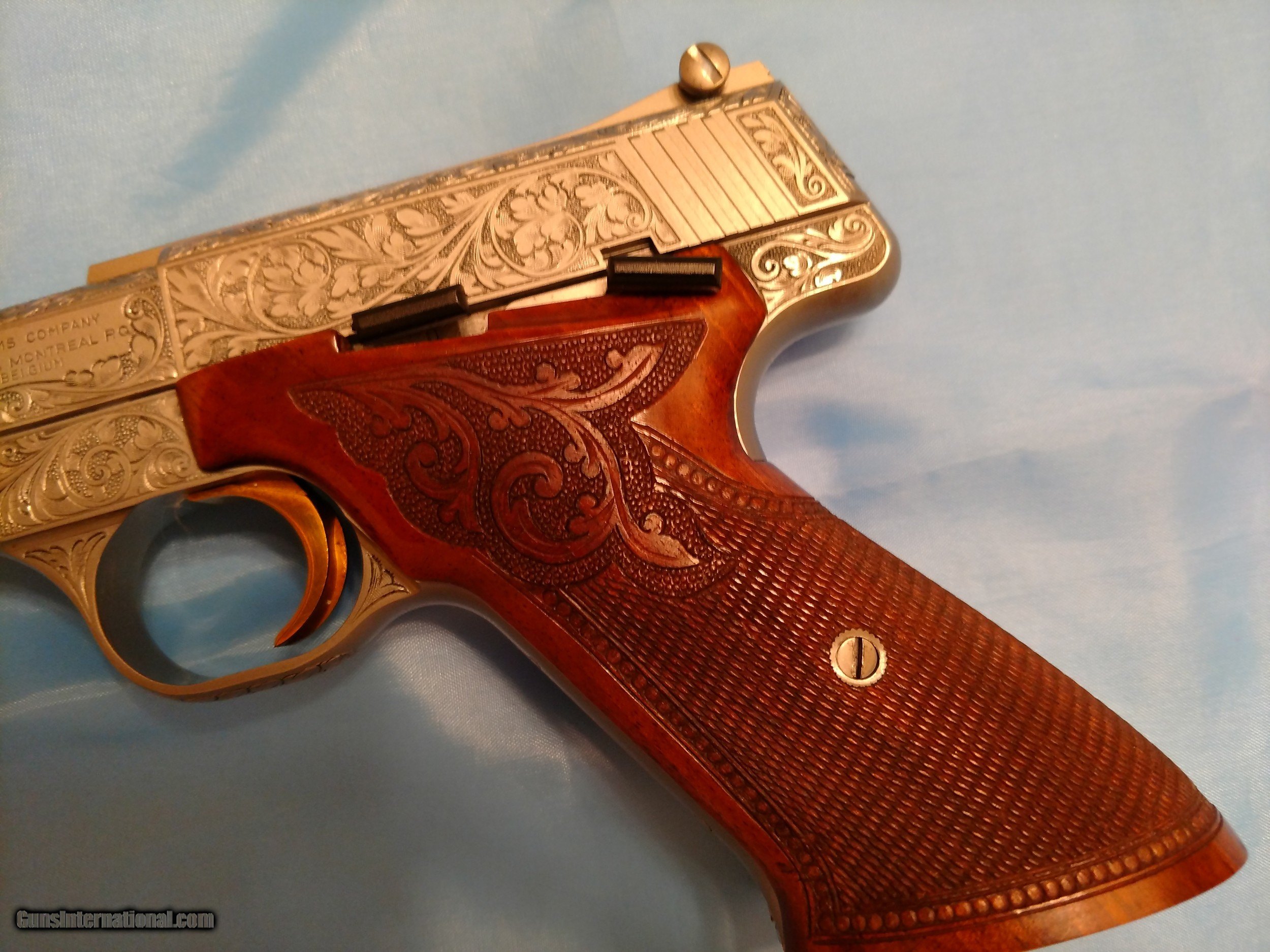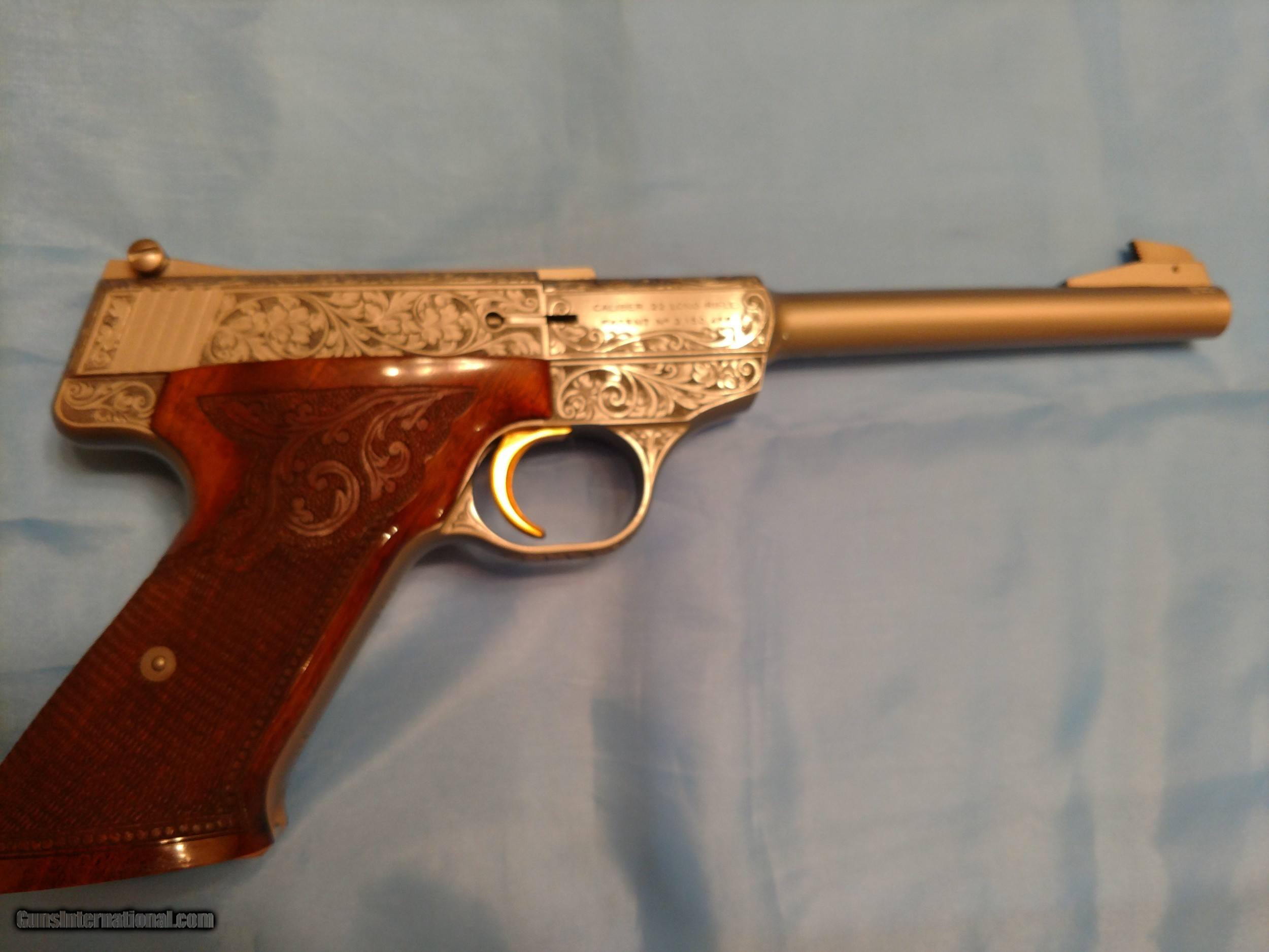 Description: BROWNING RENAISSANCE CHALLENGER, .22 semi-automatic pistol, one of only 473 made, factory engraved with luxurious satin nickel finish with sensational checkered /scrolled floral carved walnut one piece grip with bead pattern borders, adjustable rear sight, gold trigger, 6 3/4" barrel, weighs 38 ounces, length 11 7/16" 10-shot magazine, factory original Browning operator's manual PLUS factory original Browning fleece-lined pouch. There is no evidence whatsoever that this pistol has ever been fired. The. serial number is 58819U73. The price is $4500 including FedEx shipping to your FFL dealer in your area. Please call me at 318-780-4242 if you are interested. MADE IN BELGIUM!! SOLD! SOLD Manufacturer: Browning, FN Model: Renaissance Challenger Serial Number: 58819U73 Barrel Length: 6 3/4 Condition: Flawless Wood Condition: Flawless Bore Condition: Flawless Triggers: Gold Weight: 38 ounces Sights: open target, adjustable Manufacture Date: 1973 Engraving: yes Case: Soft, zipper Item Location: Shreveport, Louisiana |