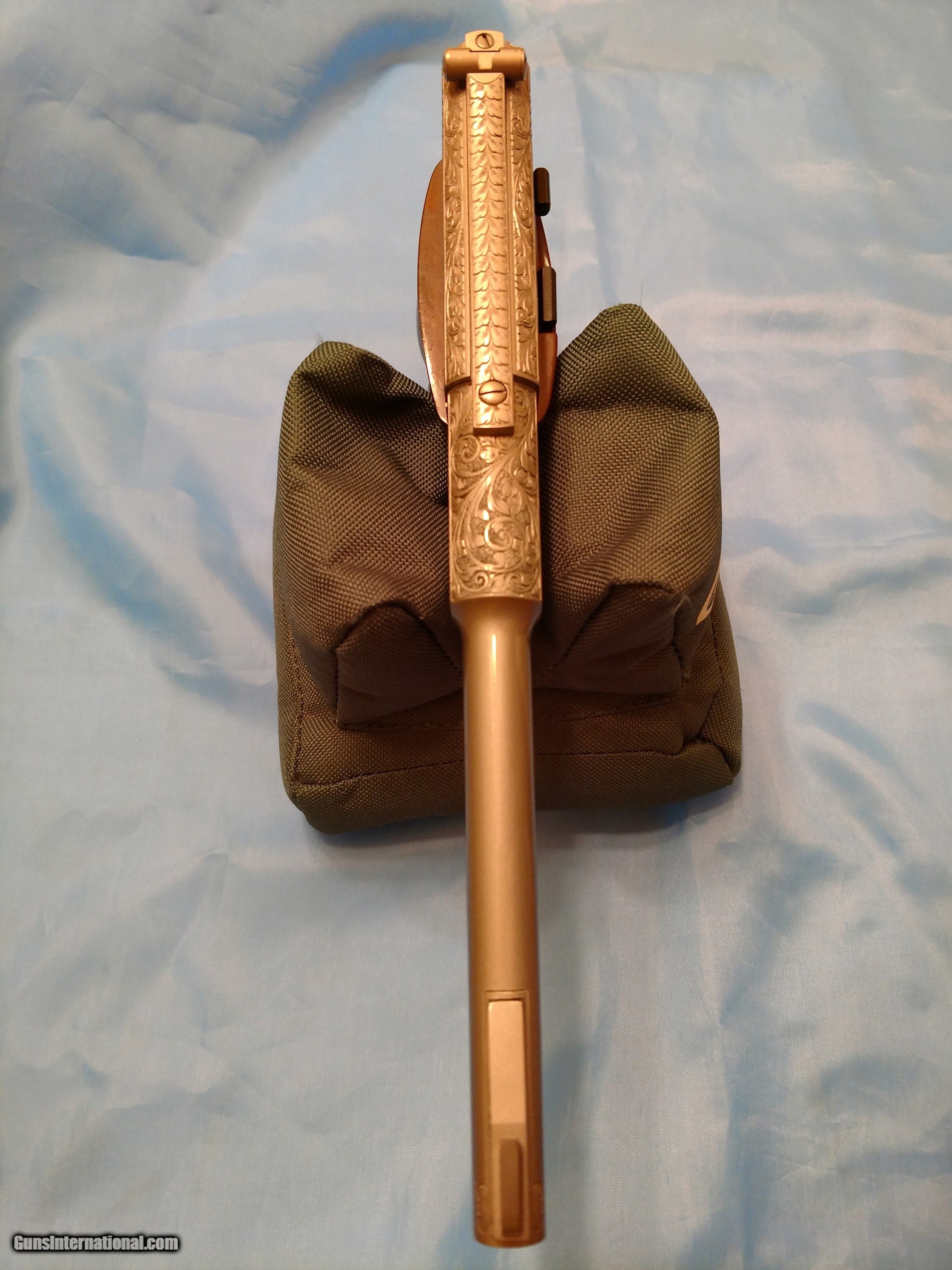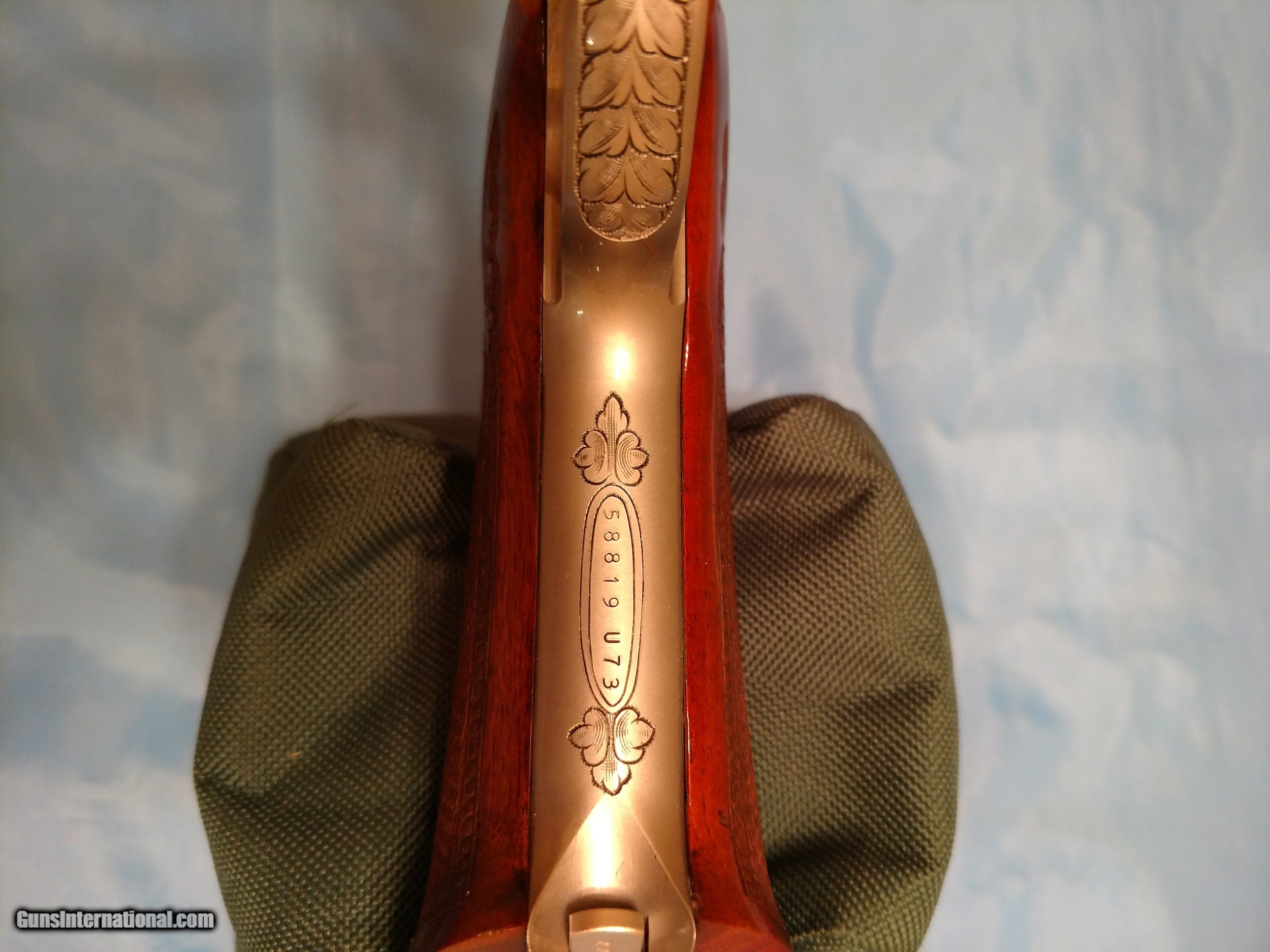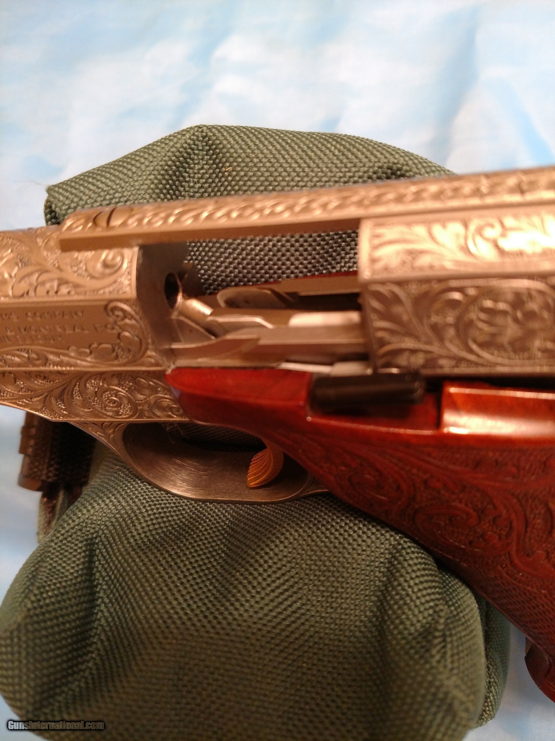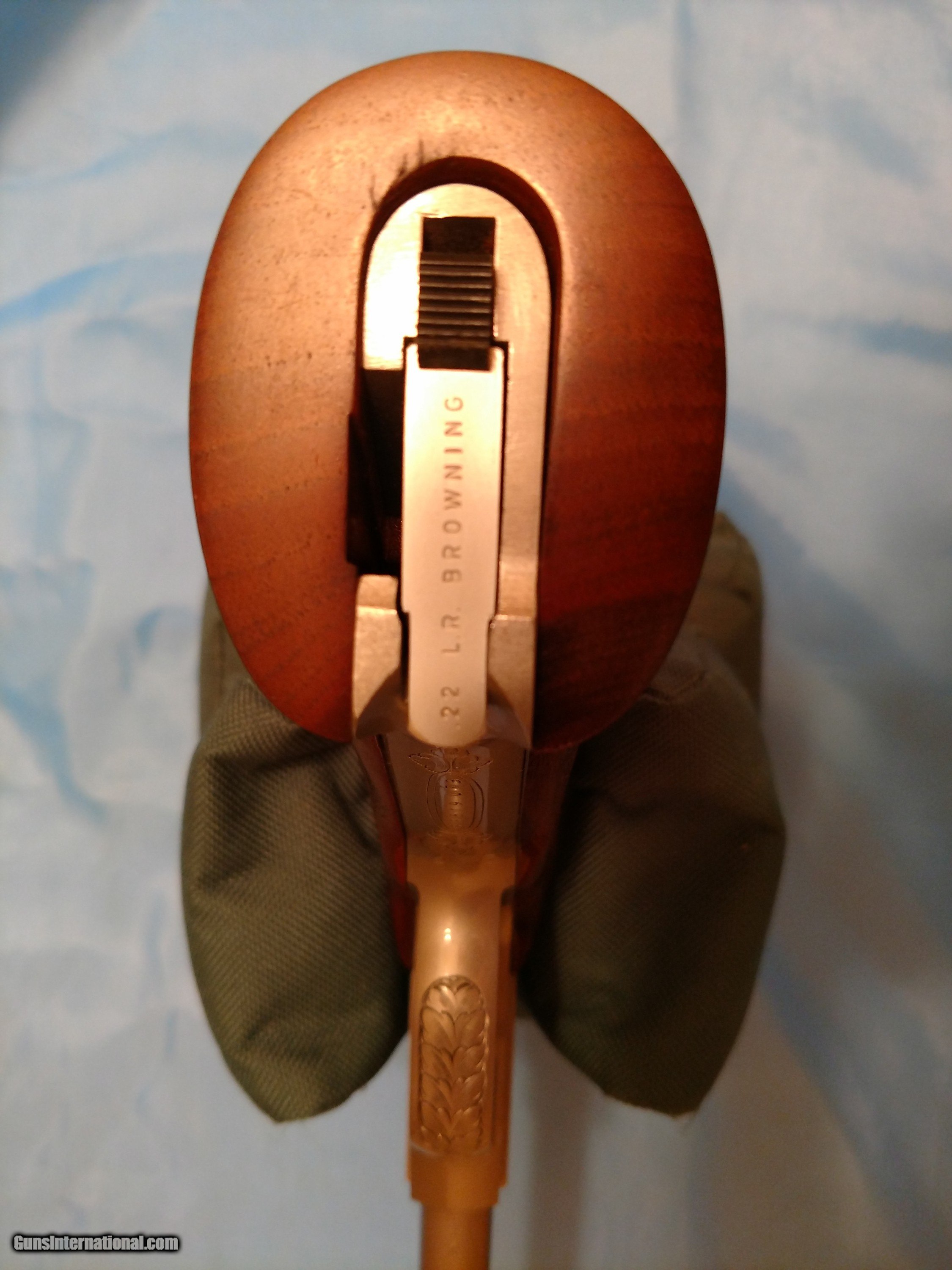 Description: BROWNING RENAISSANCE CHALLENGER, .22 semi-automatic pistol, one of only 473 made, factory engraved with luxurious satin nickel finish with sensational checkered /scrolled floral carved walnut one piece grip with bead pattern borders, adjustable rear sight, gold trigger, 6 3/4" barrel, weighs 38 ounces, length 11 7/16" 10-shot magazine, factory original Browning operator's manual PLUS factory original Browning fleece-lined pouch. There is no evidence whatsoever that this pistol has ever been fired. The. serial number is 58819U73. The price is $4500 including FedEx shipping to your FFL dealer in your area. Please call me at 318-780-4242 if you are interested. MADE IN BELGIUM!! SOLD! SOLD Manufacturer: Browning, FN Model: Renaissance Challenger Serial Number: 58819U73 Barrel Length: 6 3/4 Condition: Flawless Wood Condition: Flawless Bore Condition: Flawless Triggers: Gold Weight: 38 ounces Sights: open target, adjustable Manufacture Date: 1973 Engraving: yes Case: Soft, zipper Item Location: Shreveport, Louisiana |