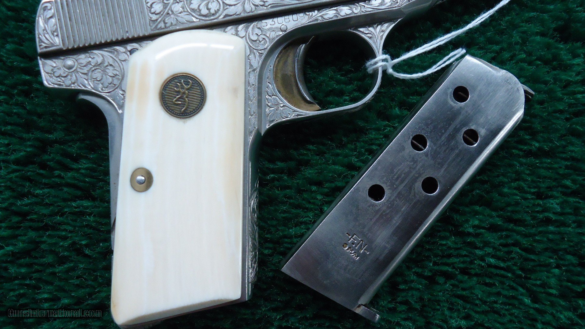 Description: This beautifully engraved pistol is finished win a coin satin that is semi-bright. A fairly early gun made in about 1955. Shows very little wear. The gold gilded trigger has flaked but still shows traces of gold. Ivory grips have the Browning emblems. Comes complete in a Navy Blue Browning case that shows some edge wear. A beautiful little Browning! Leroy Merz Antique Firearms specializes in antique and vintage Winchesters and other fine American firearms. Since 1965 Mr. Merz has taken part in the world of firearms and has been a contributor to many well known reference books. Just recently we mailed the 129th edition of our privately-published catalog. We have hundreds of additional guns in every price range at our home online. Search for Merz Antiques in google. SOLD Curio/Relic: Yes |