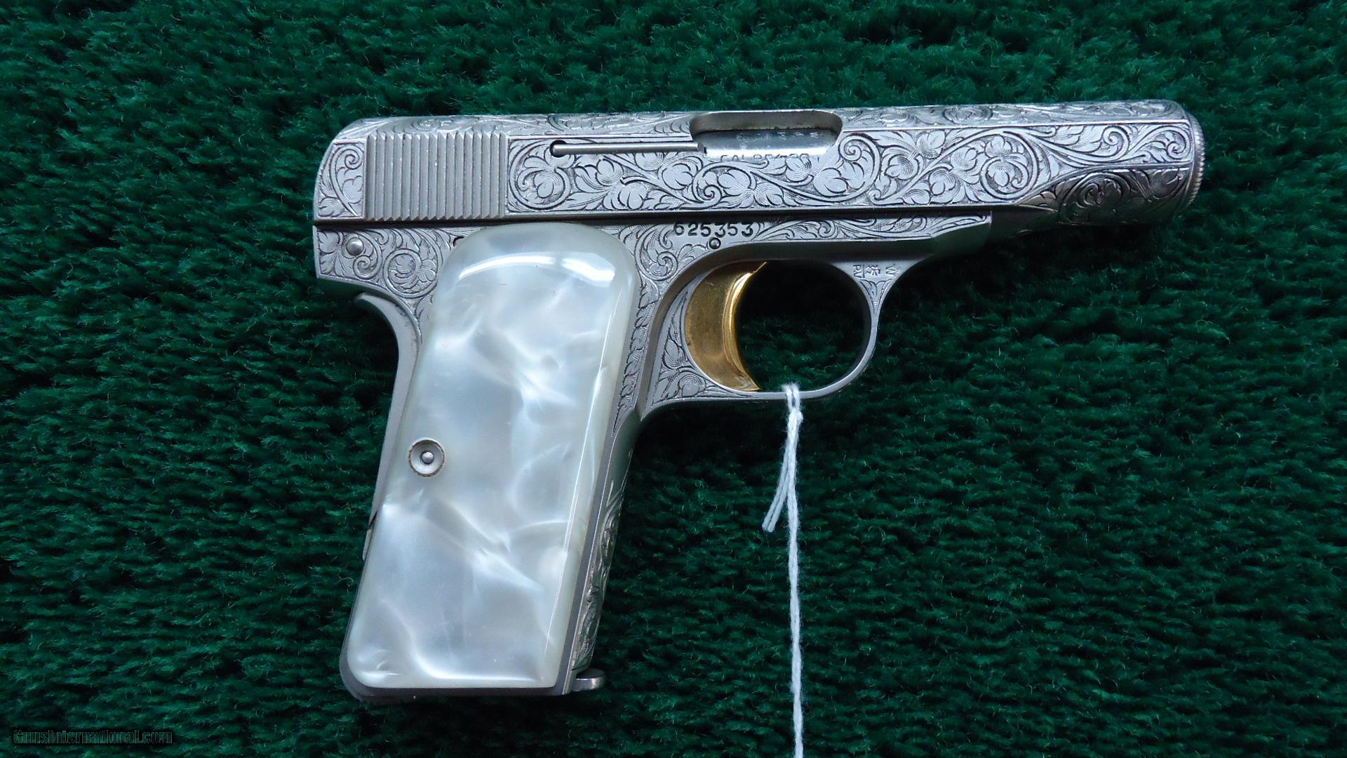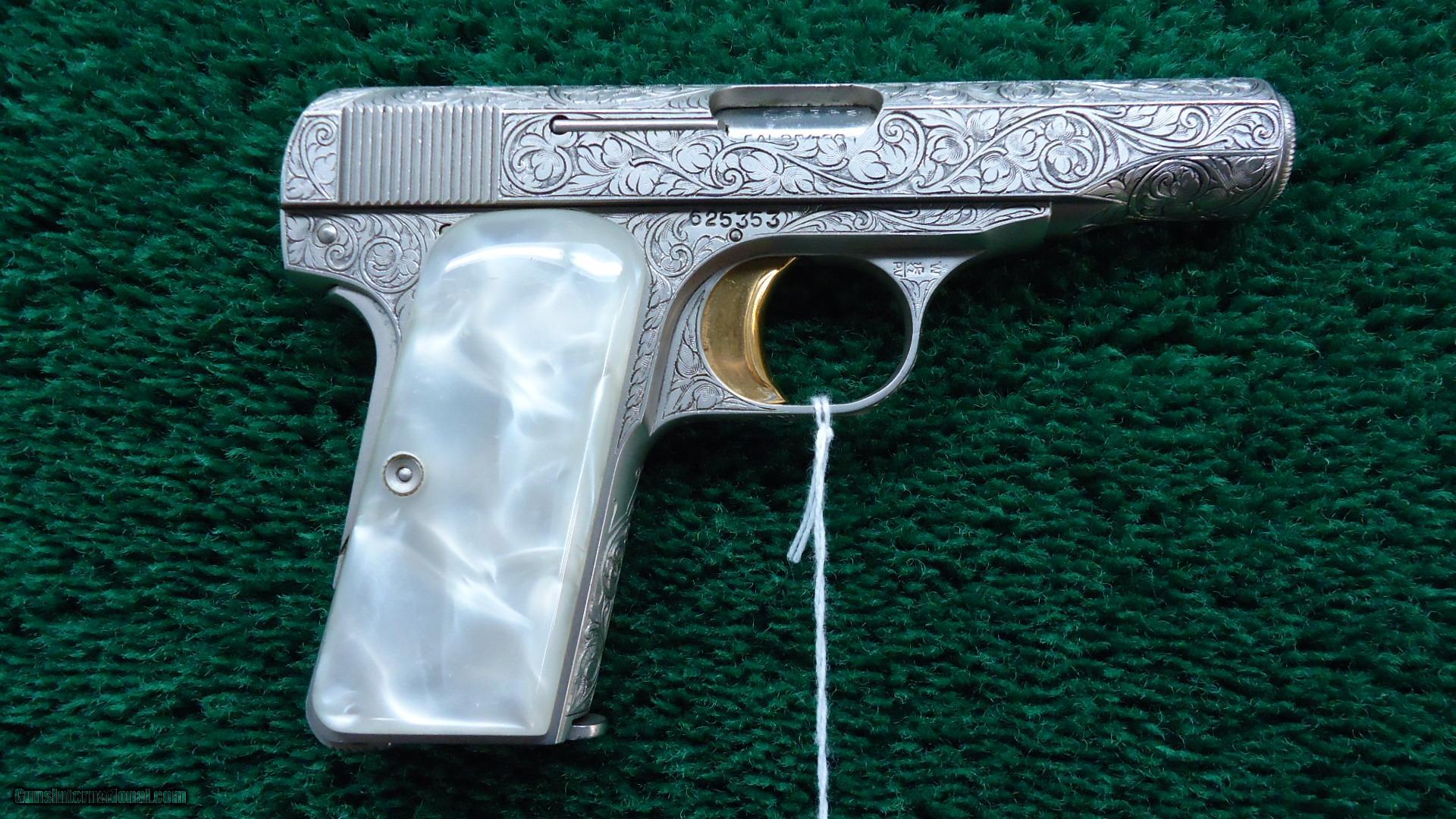 Description: Cal 380 ACP. 3-1/4" bbl, gold trigger and fixed sights. Full coverage engraving in beautiful floral and vine pattern. Nickel finish. Imitation pearl grips. This beauty is in NICE condition! Leroy Merz Antique Firearms specializes in antique and vintage Winchesters and other fine American firearms. Since 1965 Mr. Merz has taken part in the world of firearms and has been a contributor to many well known reference books. Just recently we mailed the 127th edition of our privately-published catalog. We have hundreds of additional guns in every price range at our home online. Search for Merz Antiques in google. SOLD Curio/Relic: Yes |