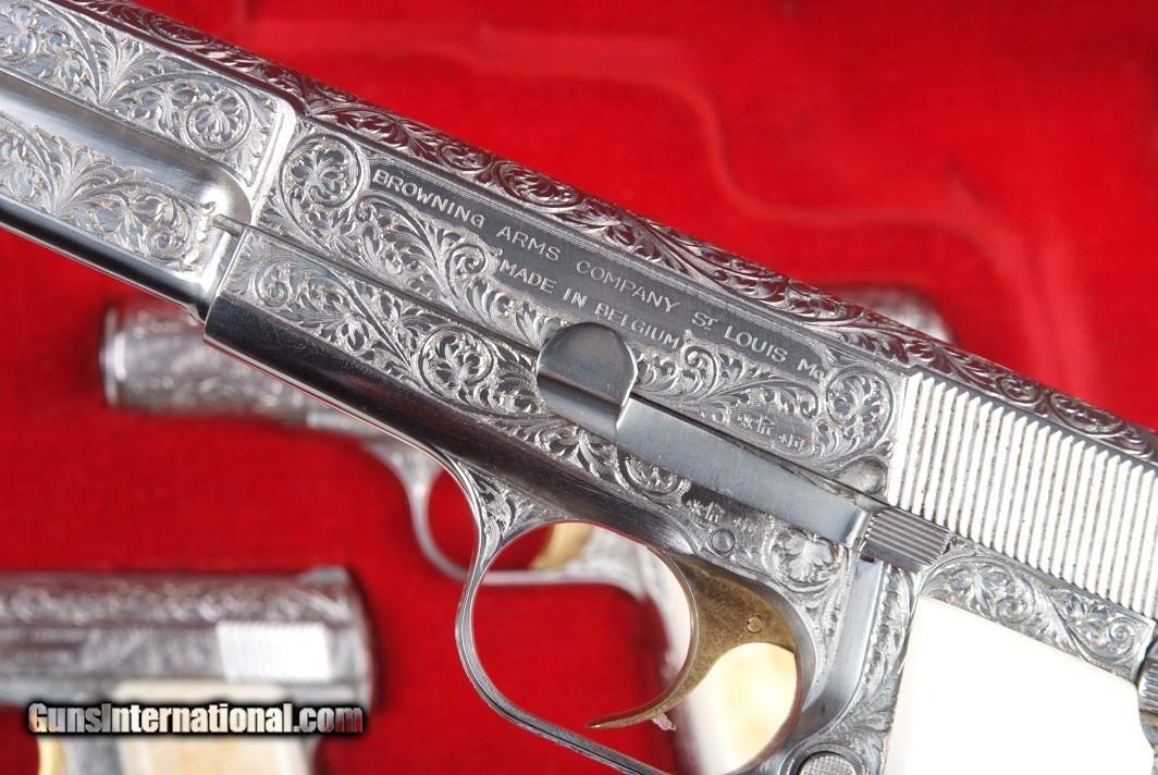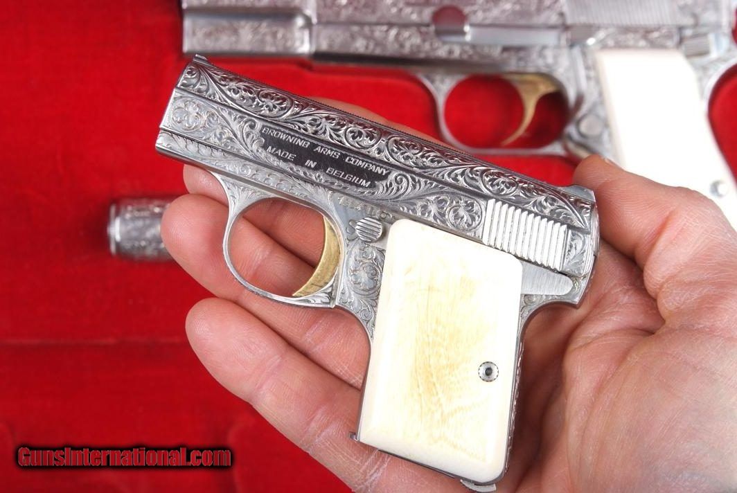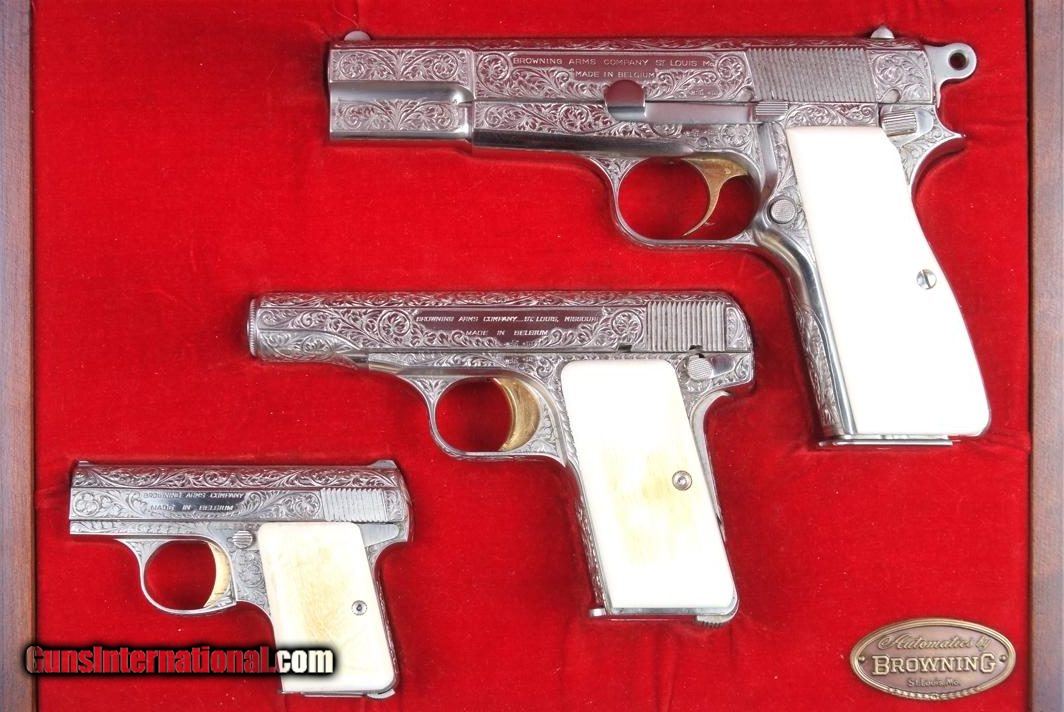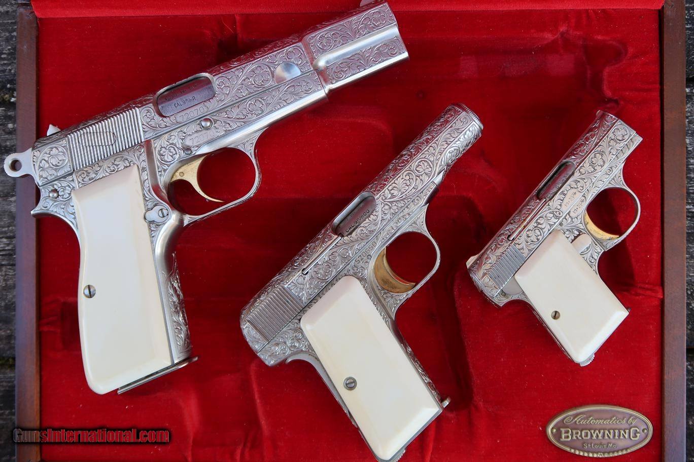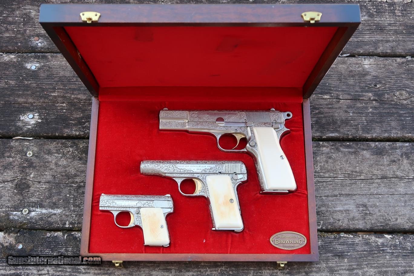 Fabulous early FN/Browning Renaissance Coin Finished set in early wood red lined case. FN/Browning High Power, #72070, 9mmP, with fixed sights, thumb print slide, internal extractor, with full coverage vine-scroll engraving. Gold plated trigger. Replacement ivory grips. Correct magazine with button release floorplate; FN/Browning 1910 #520650, 9mm (.380ACP), with full coverage vine-scroll engraving. Gold plated trigger. Replacement ivory grips. Correct magazine marked 9mm on the right side; FN/Browning Baby, # 130470, 6.35mm (.25ACP), with full coverage vine-scroll engraving. Gold Plated Trigger. Replacement Ivory Grips. Fitted in original wood Browning case with red lining, velvet base compartmentalized for each of the three pistols. Brass fittings. An absolutely fantastic Coin Finished Set with upgraded ivory grips. Sure to please the most advanced FN/Browning collector. Might even be a nice Valentine's gift for you-know-who!!!!!!