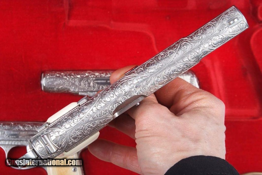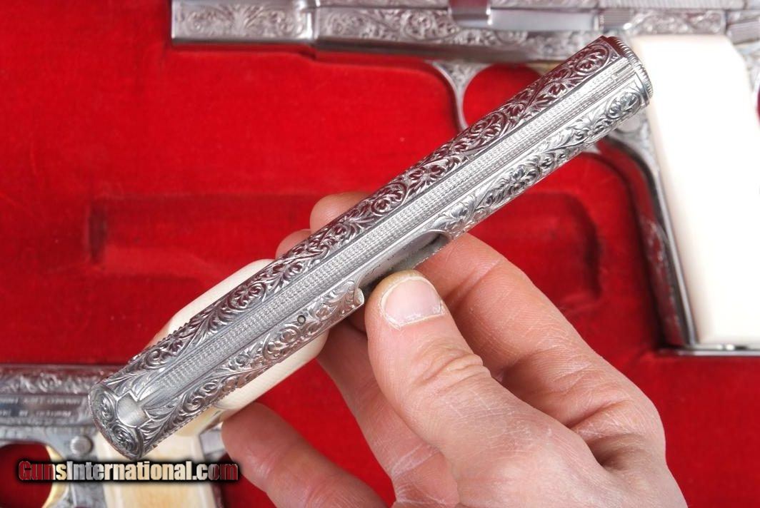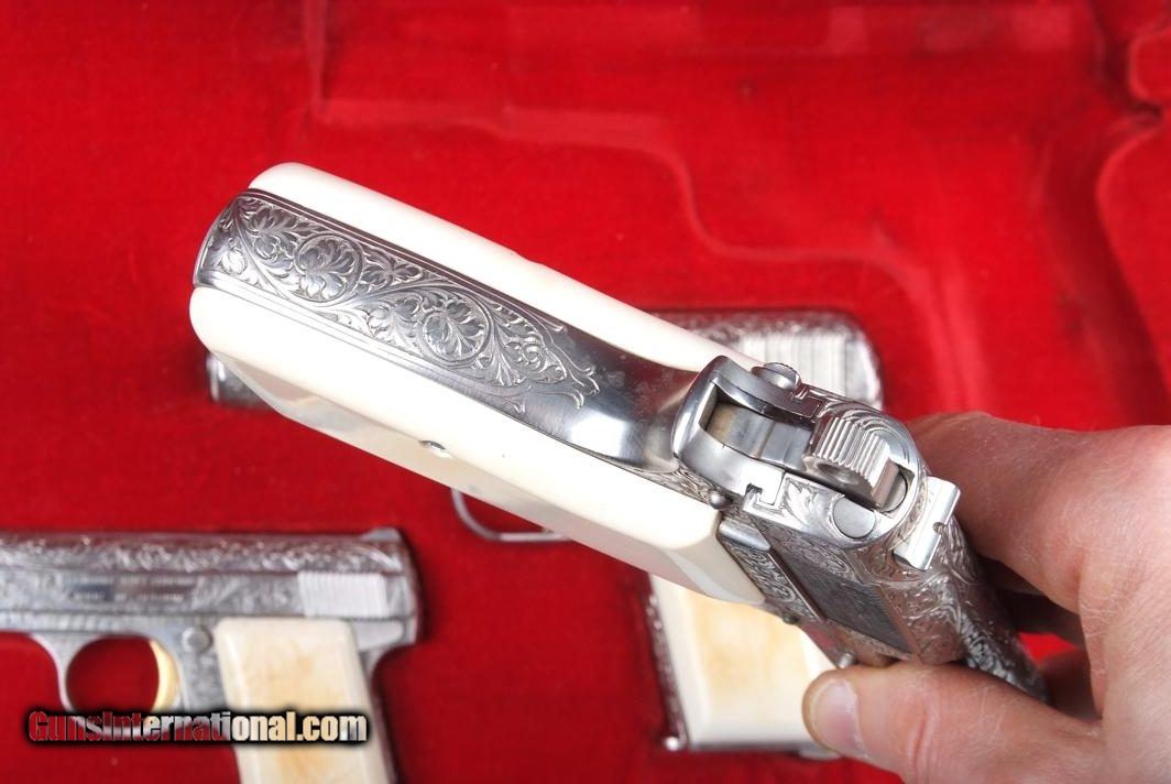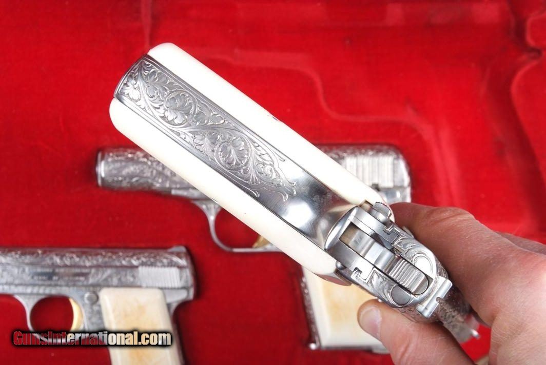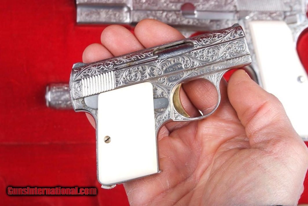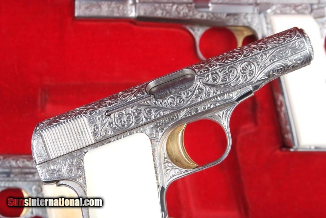 Fabulous early FN/Browning Renaissance Coin Finished set in early wood red lined case. FN/Browning High Power, #72070, 9mmP, with fixed sights, thumb print slide, internal extractor, with full coverage vine-scroll engraving. Gold plated trigger. Replacement ivory grips. Correct magazine with button release floorplate; FN/Browning 1910 #520650, 9mm (.380ACP), with full coverage vine-scroll engraving. Gold plated trigger. Replacement ivory grips. Correct magazine marked 9mm on the right side; FN/Browning Baby, # 130470, 6.35mm (.25ACP), with full coverage vine-scroll engraving. Gold Plated Trigger. Replacement Ivory Grips. Fitted in original wood Browning case with red lining, velvet base compartmentalized for each of the three pistols. Brass fittings. An absolutely fantastic Coin Finished Set with upgraded ivory grips. Sure to please the most advanced FN/Browning collector. Might even be a nice Valentine's gift for you-know-who!!!!!!