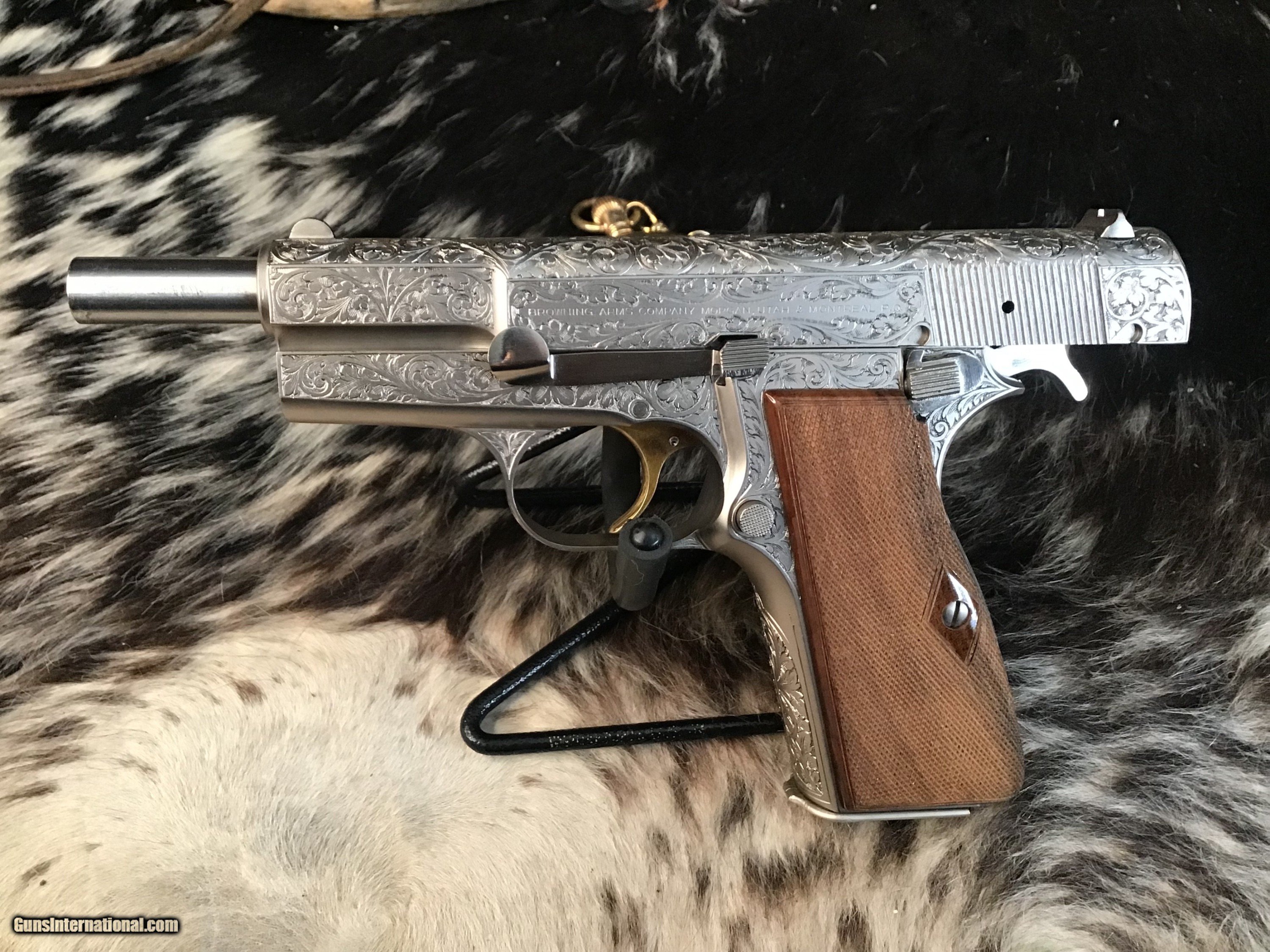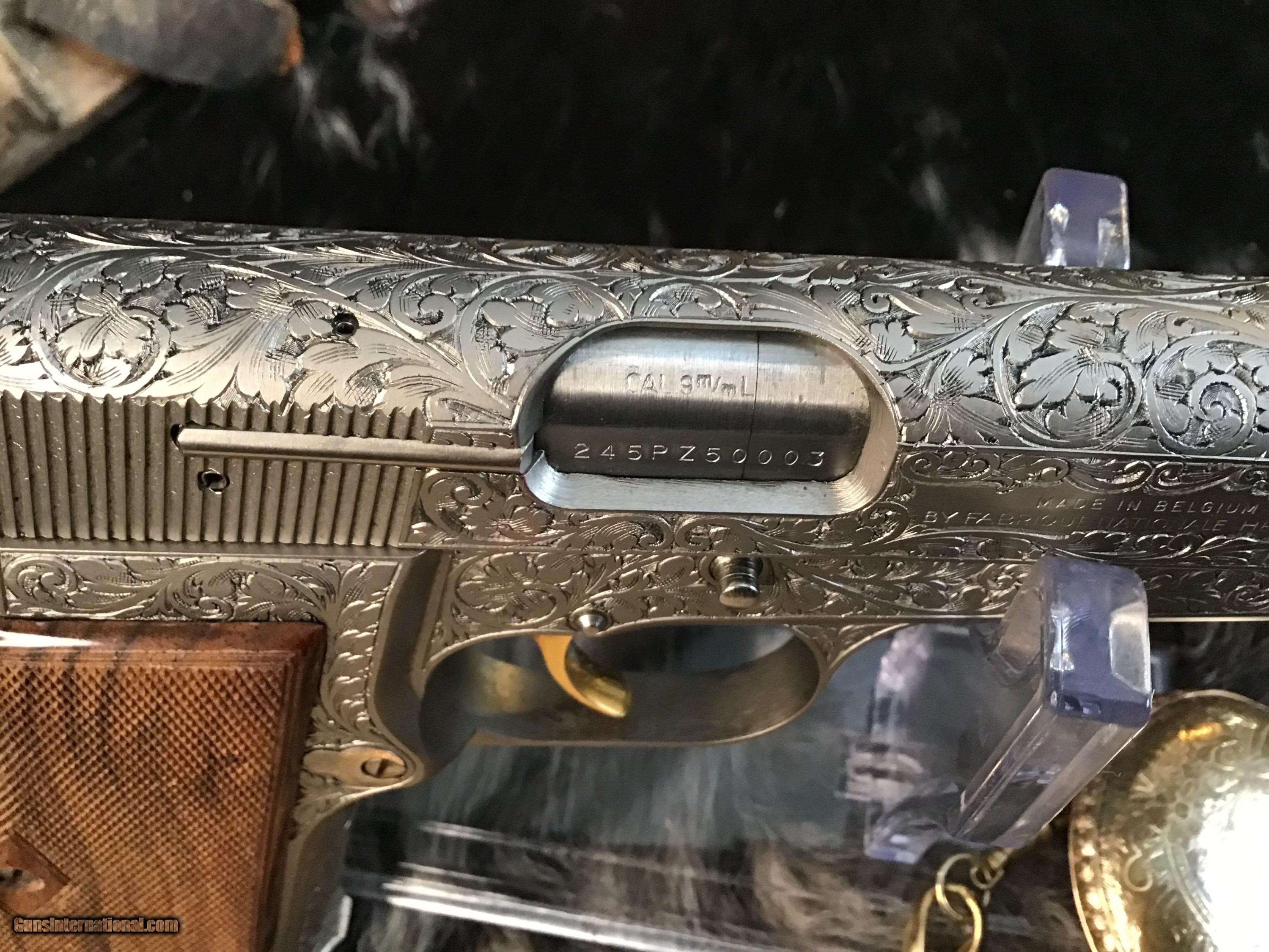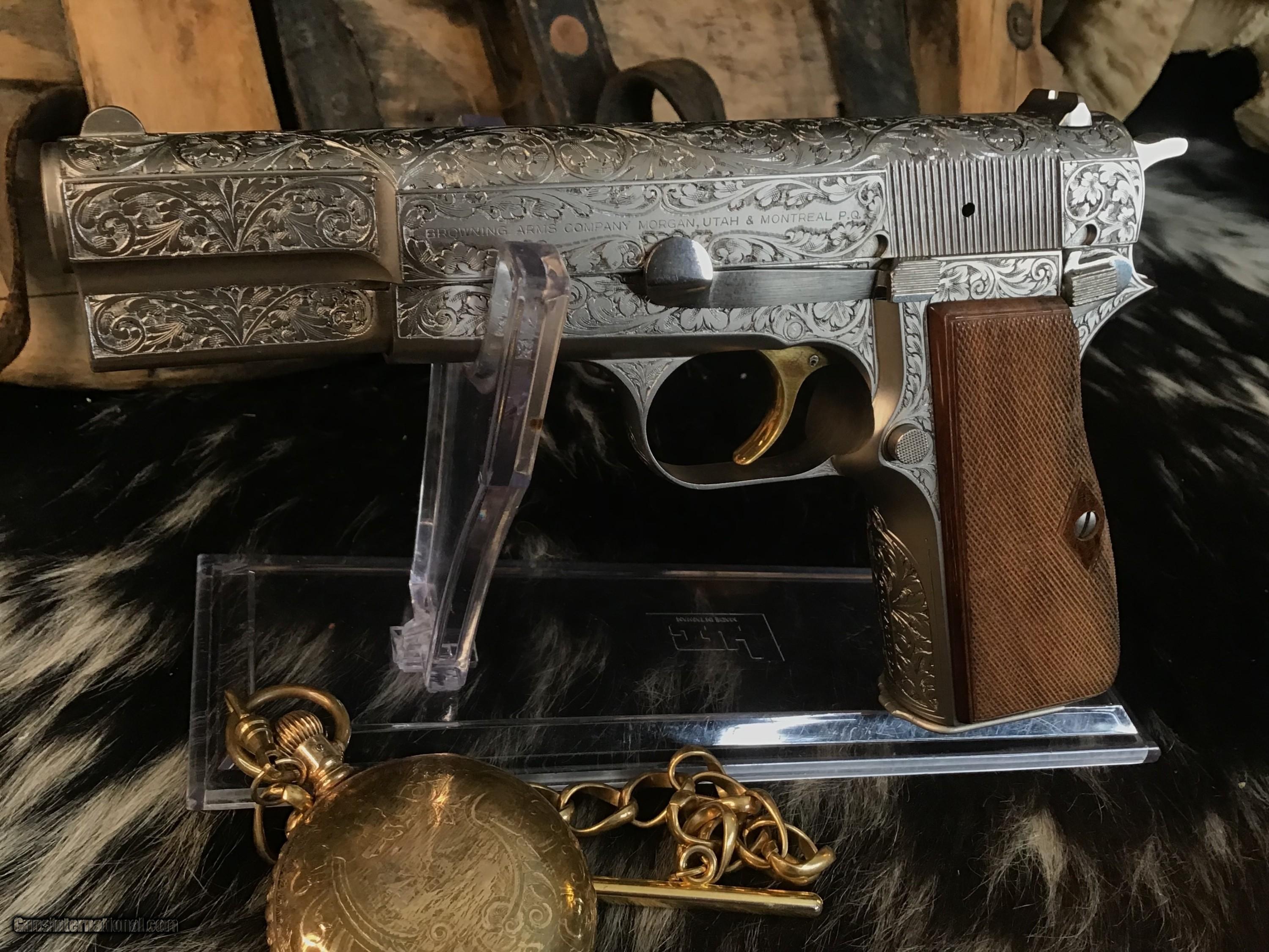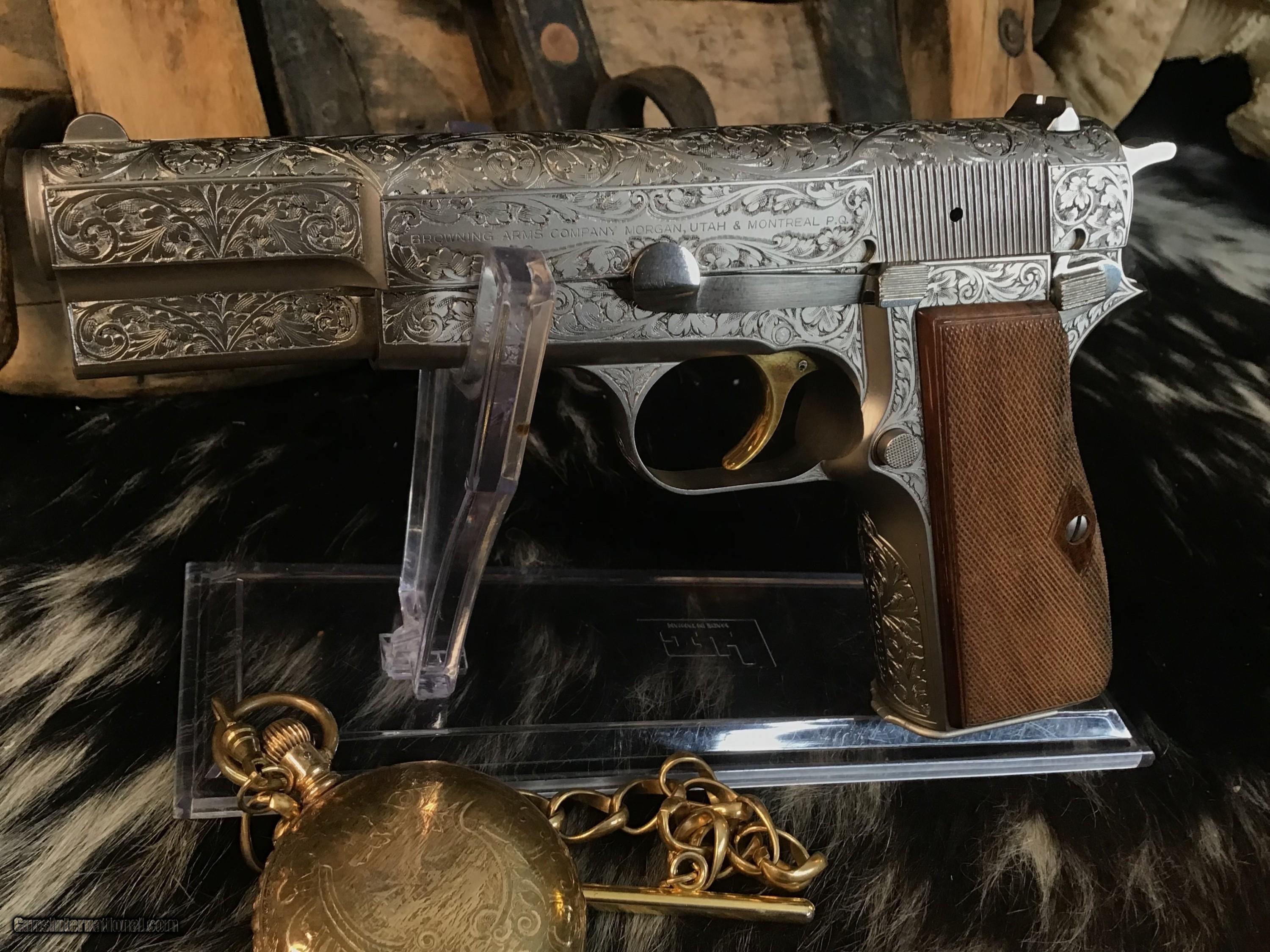 1981 Mfg. Belgium Browning factory Renaissance engraved Hi-Power 9mm pistol. Pistol appears unfired and in excellent original condition. Likely the most ornately engraved handgun crafted by a factory. Detail in engraving is excellent, something to behold in your hand.
