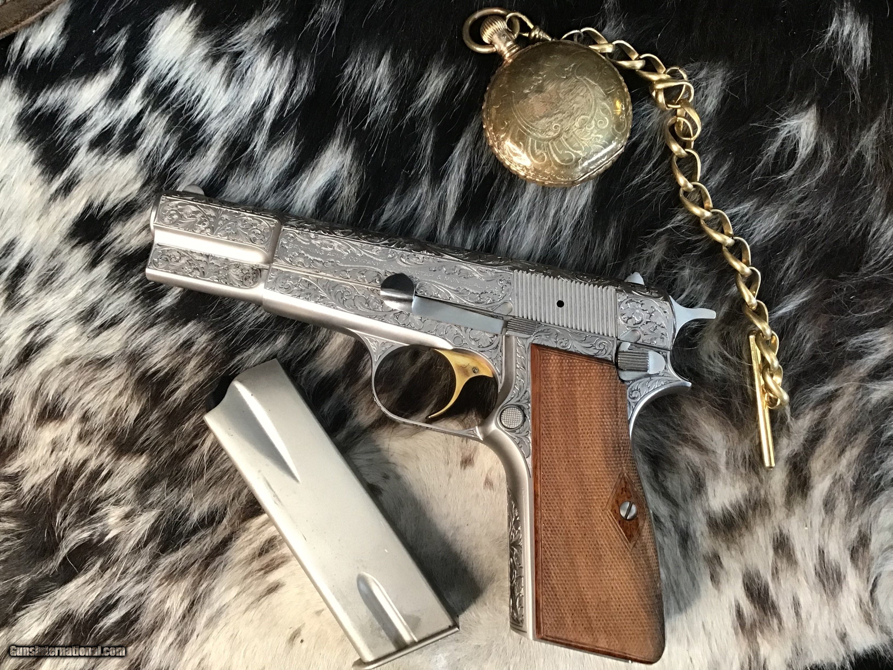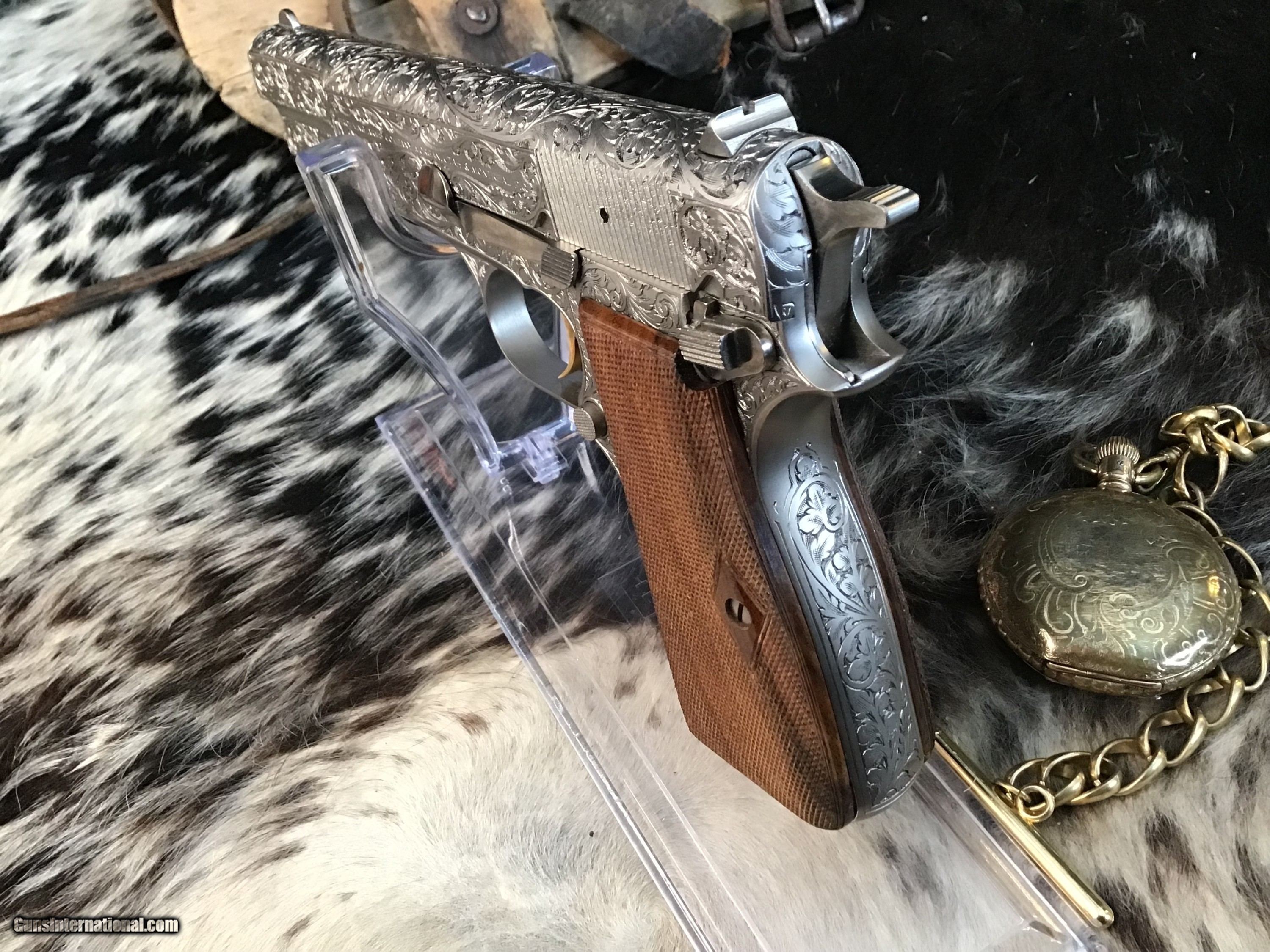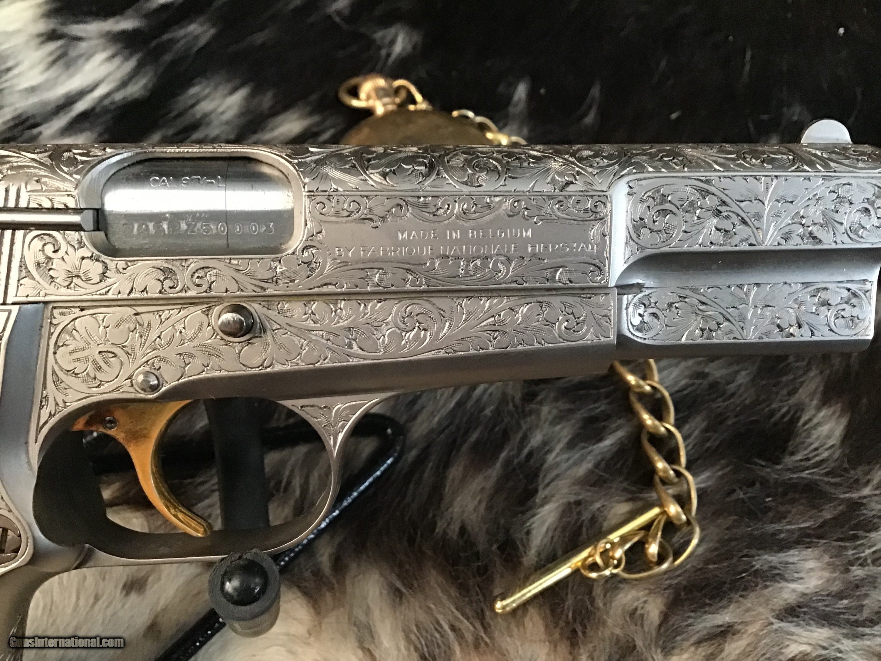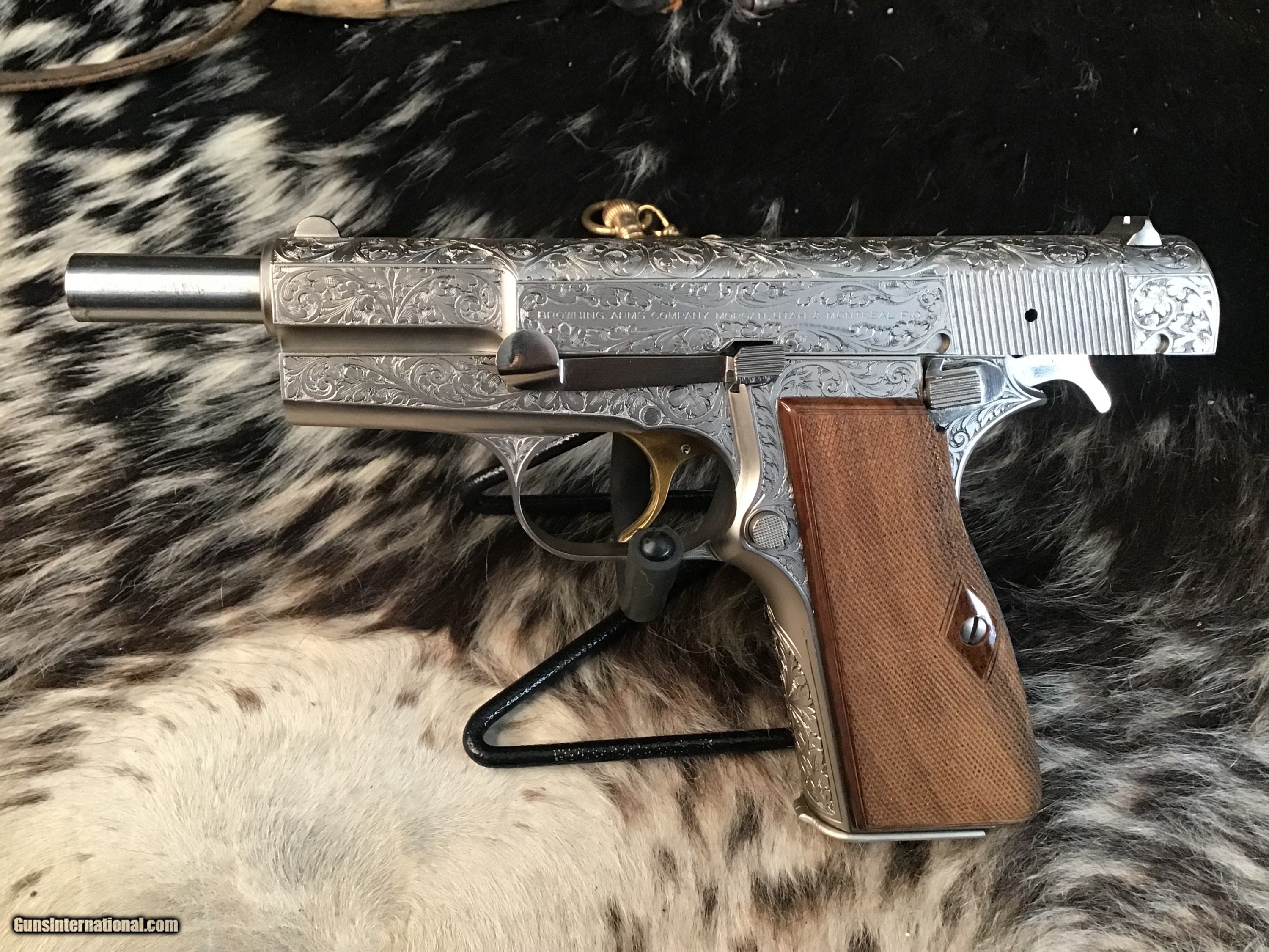 1981 Mfg. Belgium Browning factory Renaissance engraved Hi-Power 9mm pistol. Pistol appears unfired and in excellent original condition. Likely the most ornately engraved handgun crafted by a factory. Detail in engraving is excellent, something to behold in your hand.